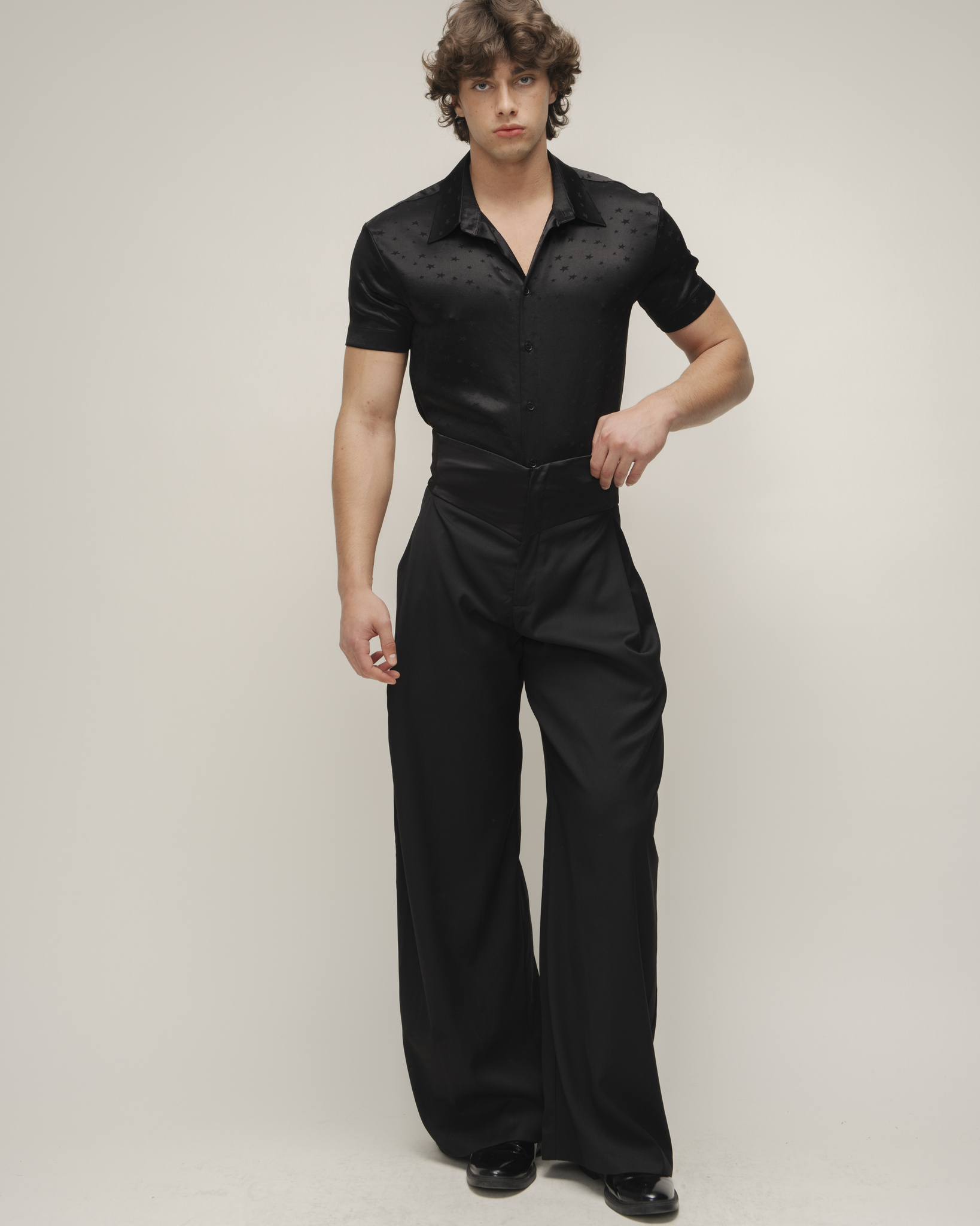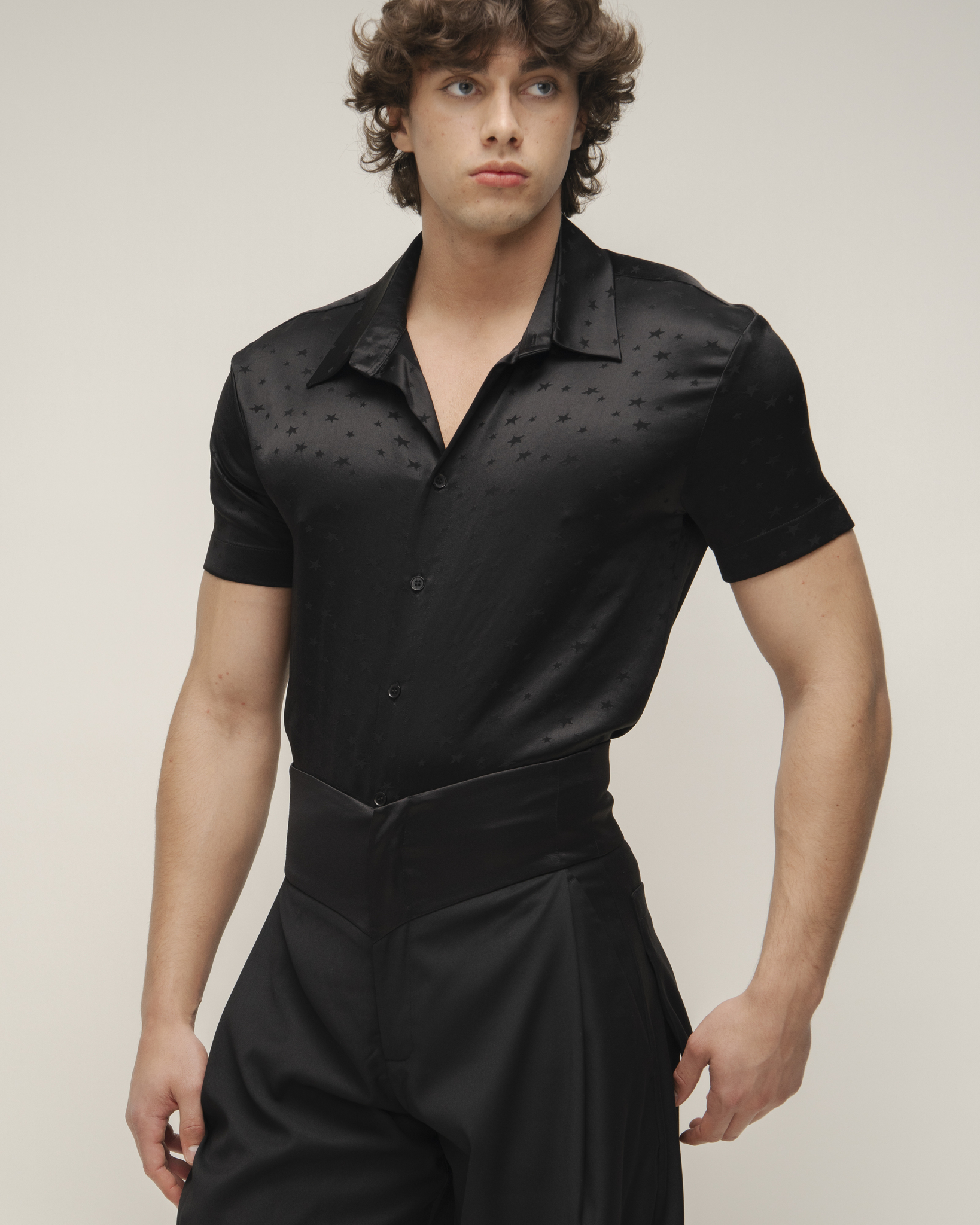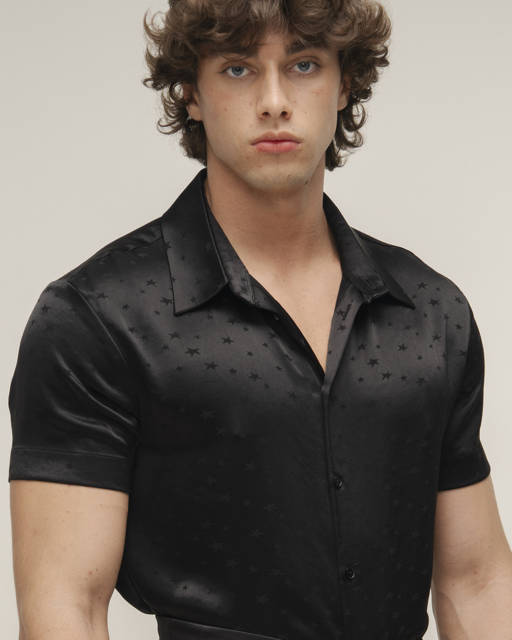 Рубашка с коротким рукавом из легкой, гладкой и очень приятной к телу жаккардовой атласной ткани. Классический отложной воротник. Застежка на пуговицы спереди.