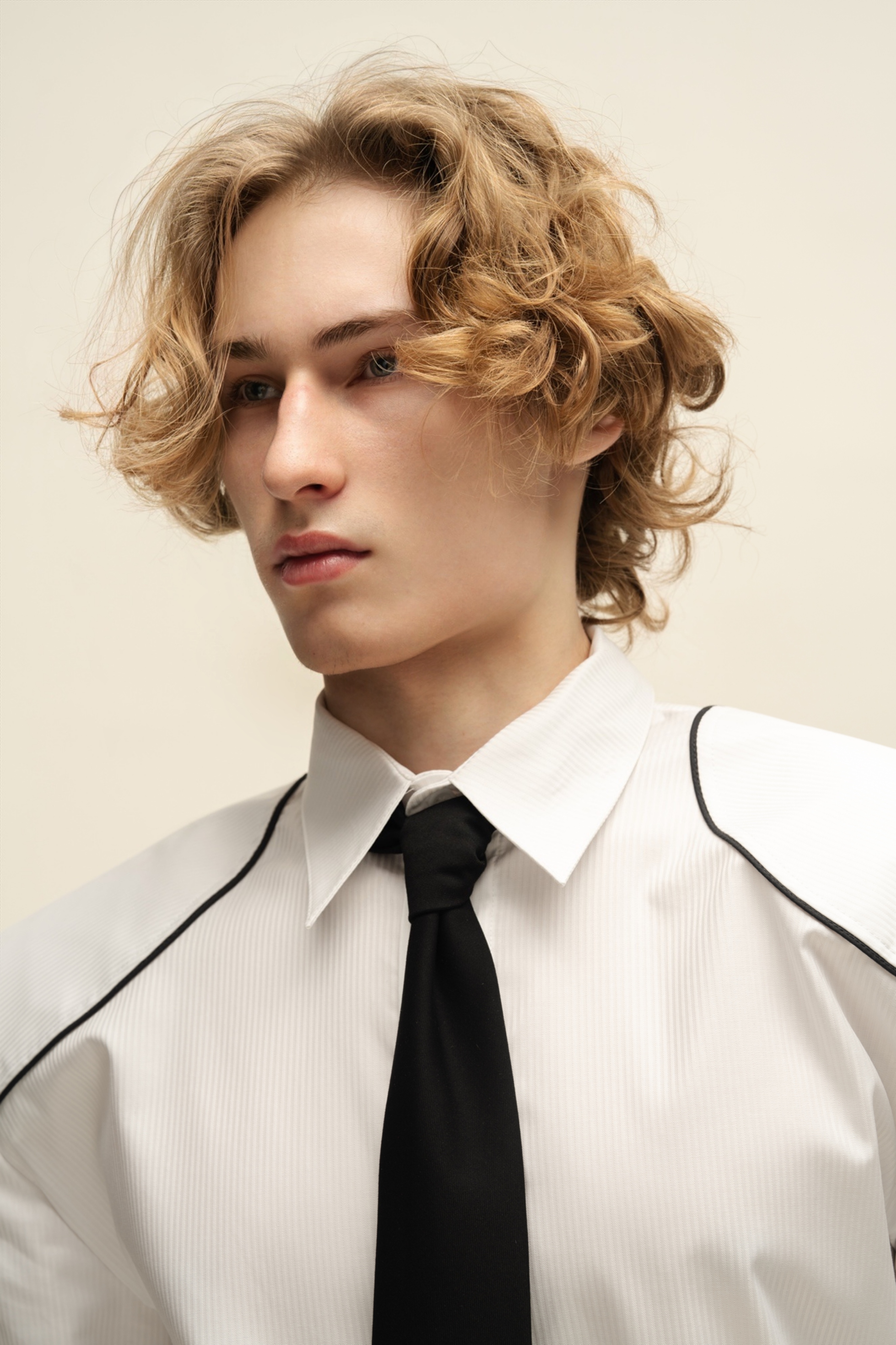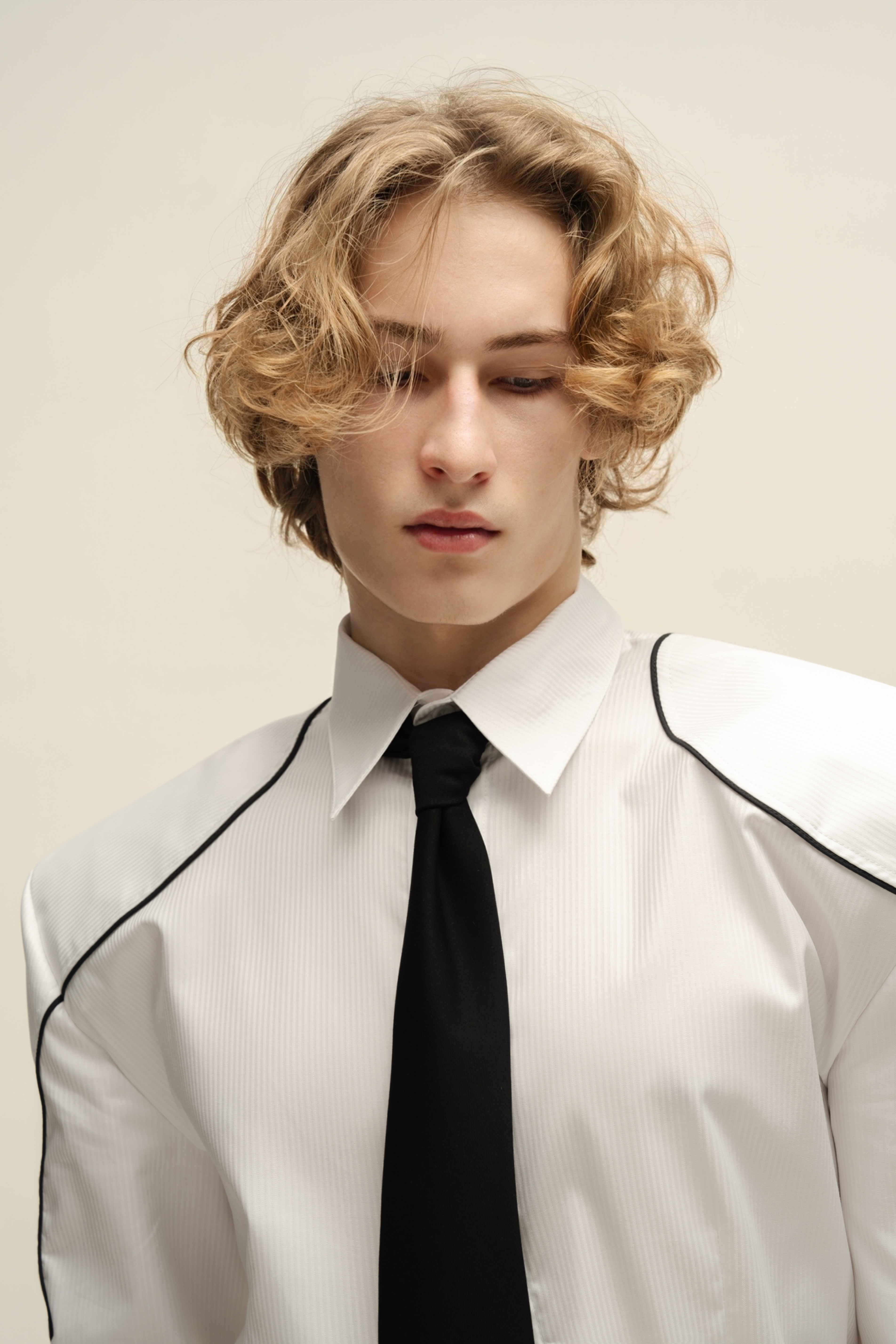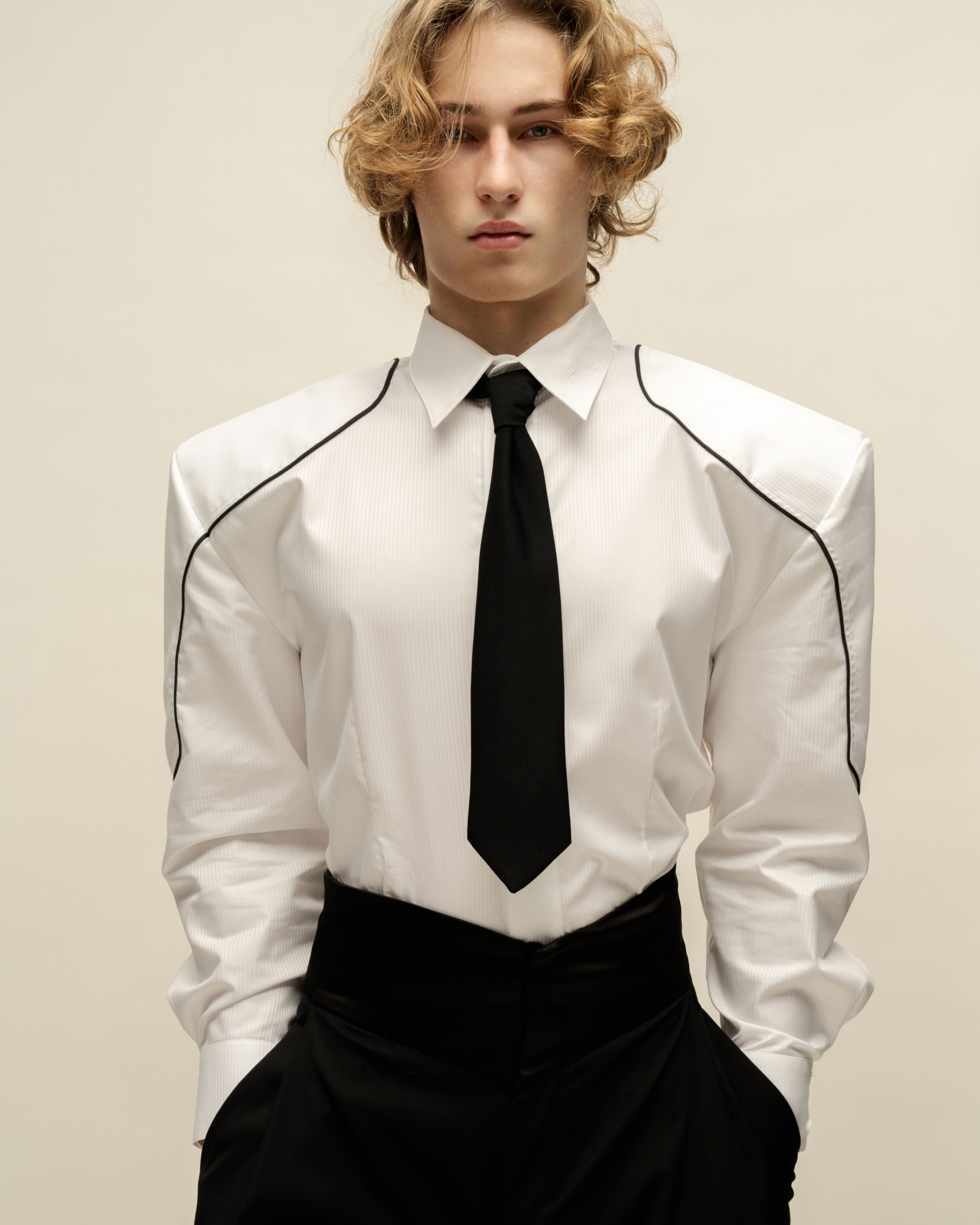 Рубашка «Матадор» из жаккардового хлопка в однотонную полоску, с укреплённой линией плеч и декоративными фигурными кантами. Скрытая застёжка на петли и пуговицы.
