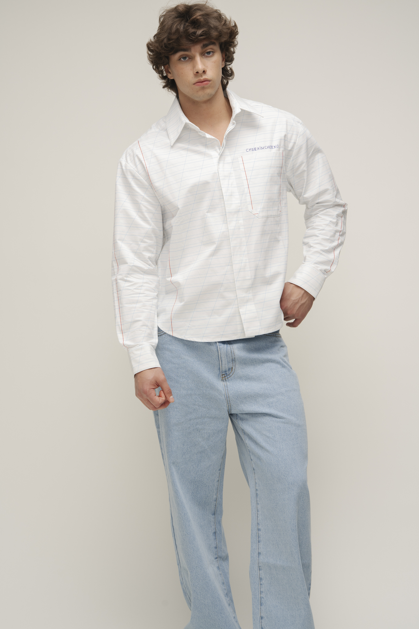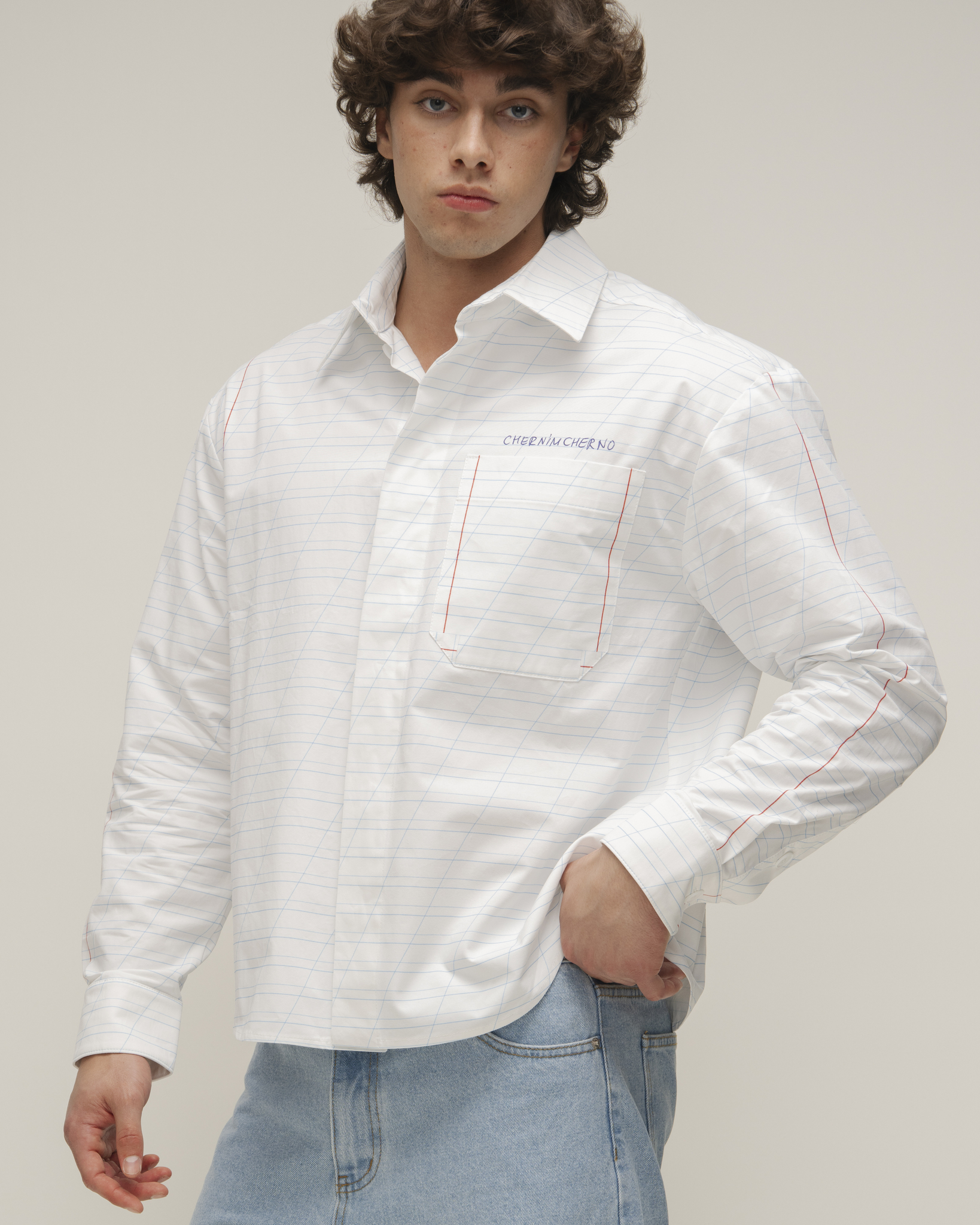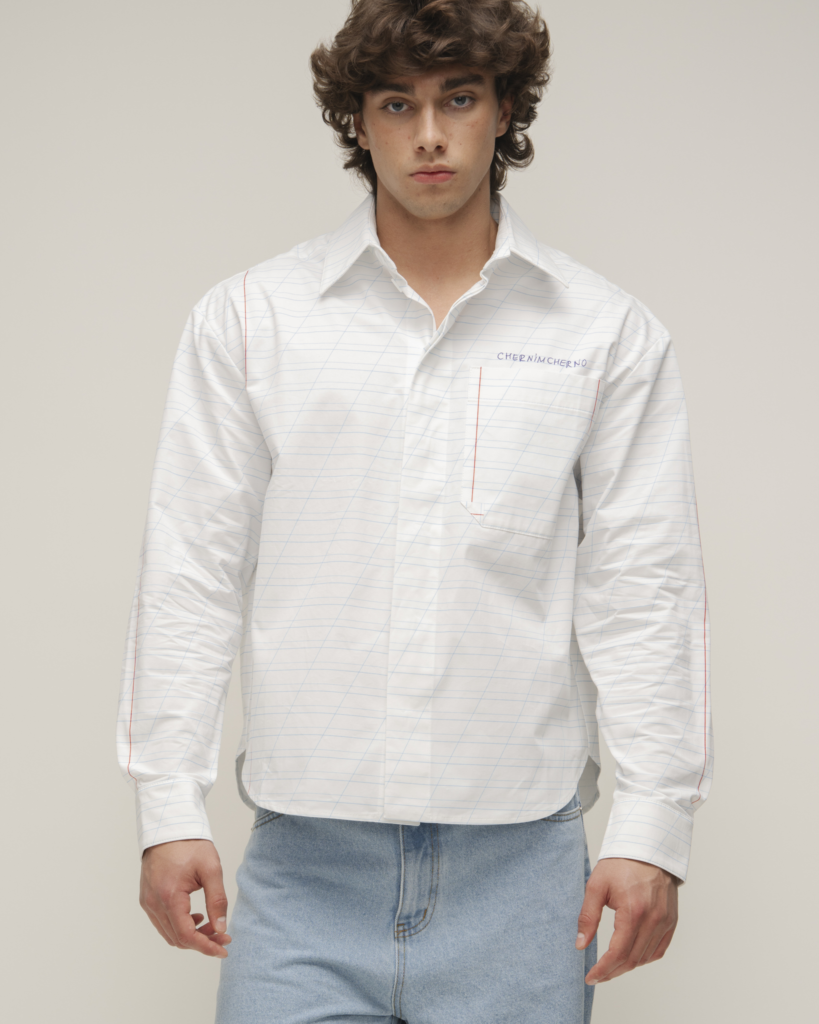 Рубашка из хлопка с авторским принтом, один накладной большой карман на переде. Застёжка на петли и пуговицы.