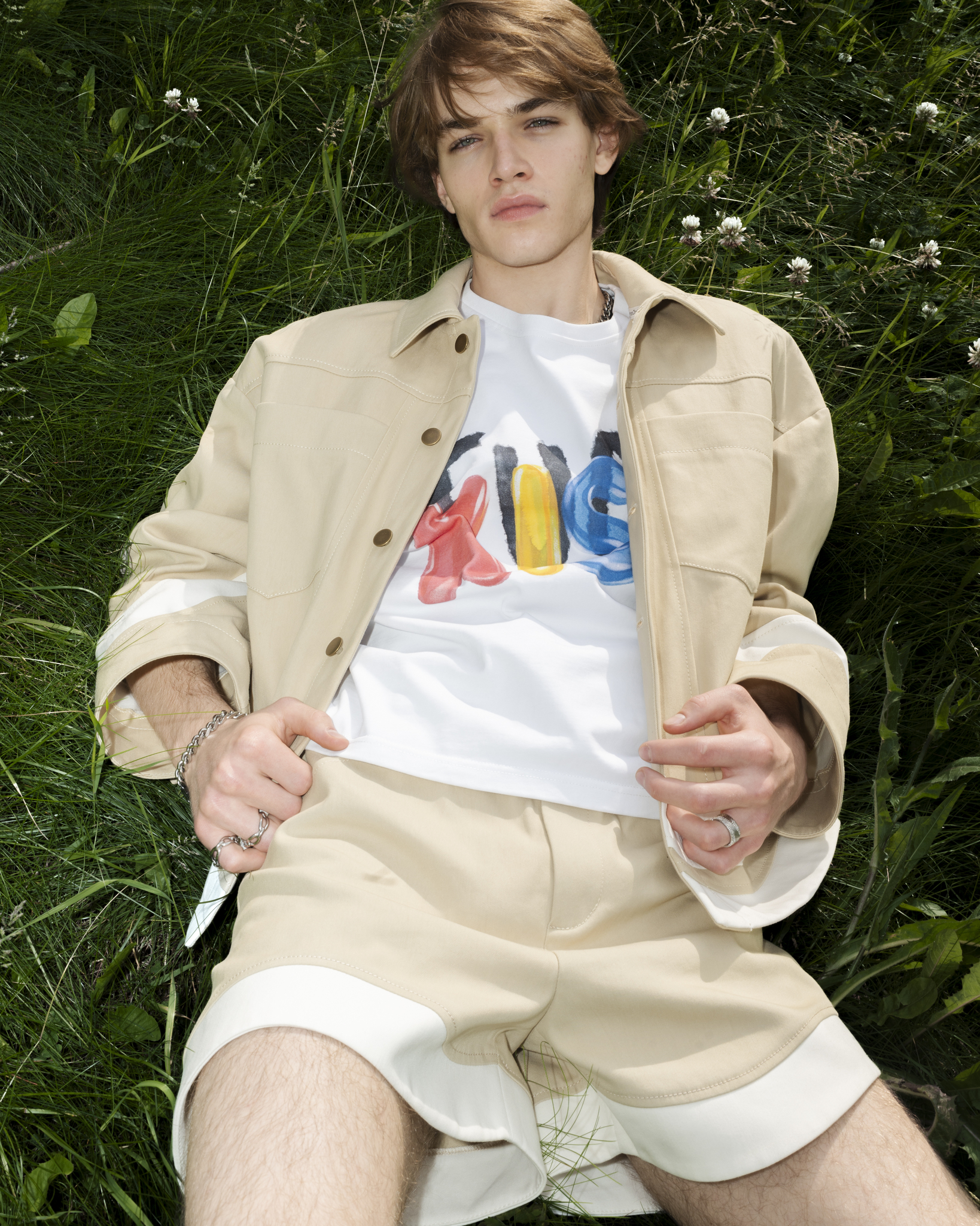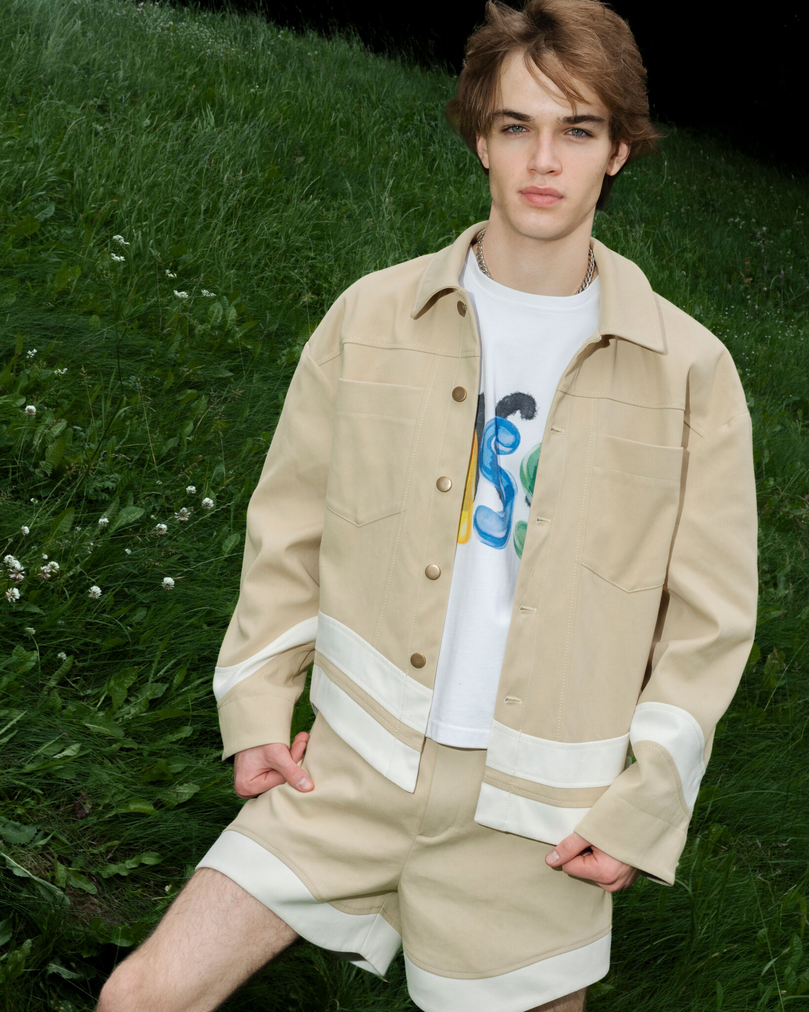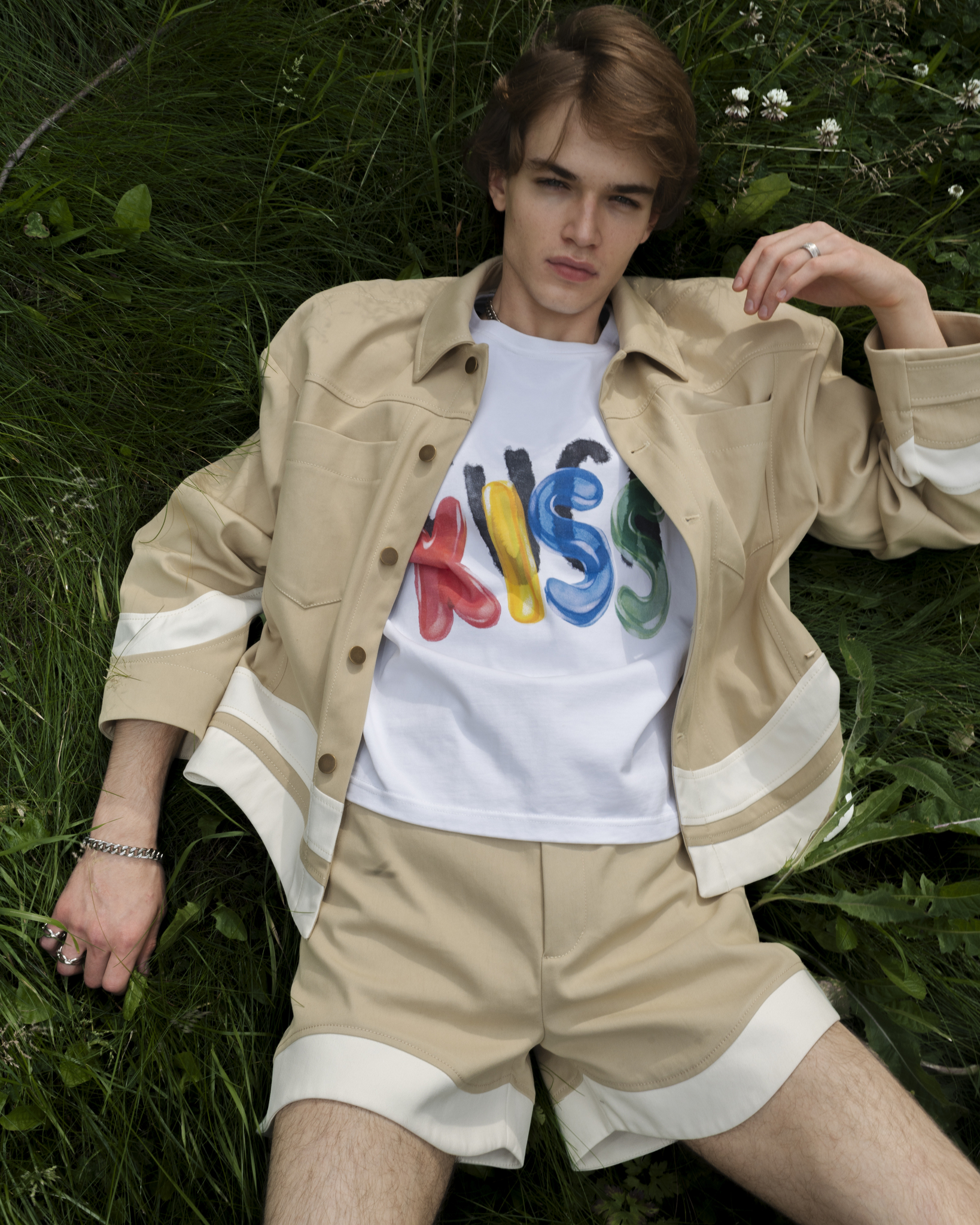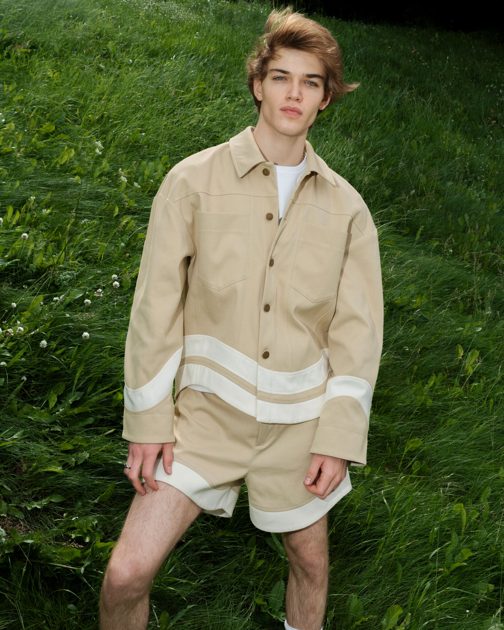 Рубашка из смесовый плотной джинсовой ткани с ассиметричным контрастным рисунком по низу изделия и рукавам. Два накладных кармана на груди. Застёжка на глазковые петли и установочные пуговицы.