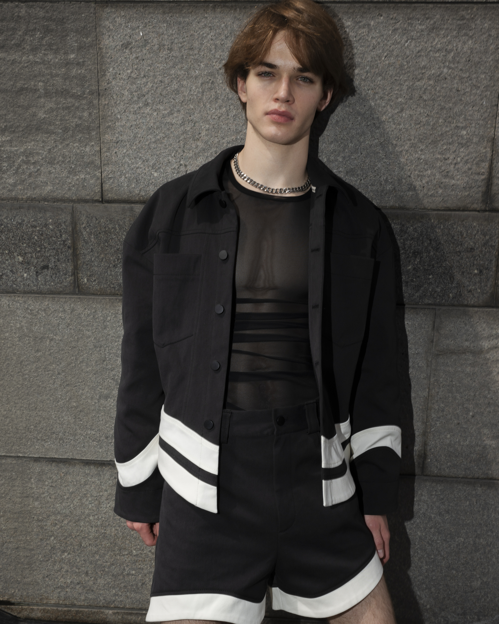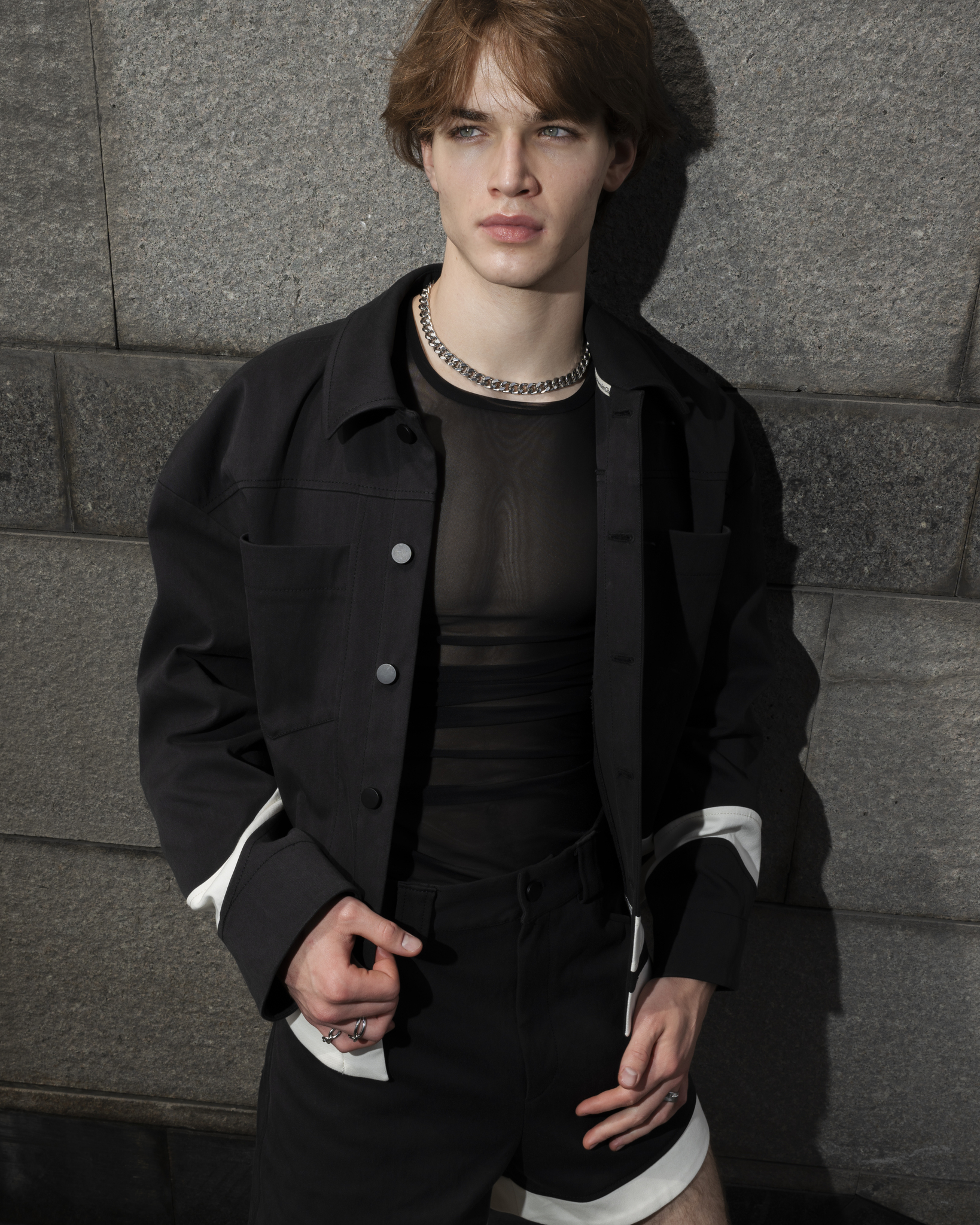 Рубашка из смесовый плотной джинсовой ткани с ассиметричным контрастным рисунком по низу изделия и рукавам. Два накладных кармана на груди. Застёжка на глазковые петли и установочные пуговицы.