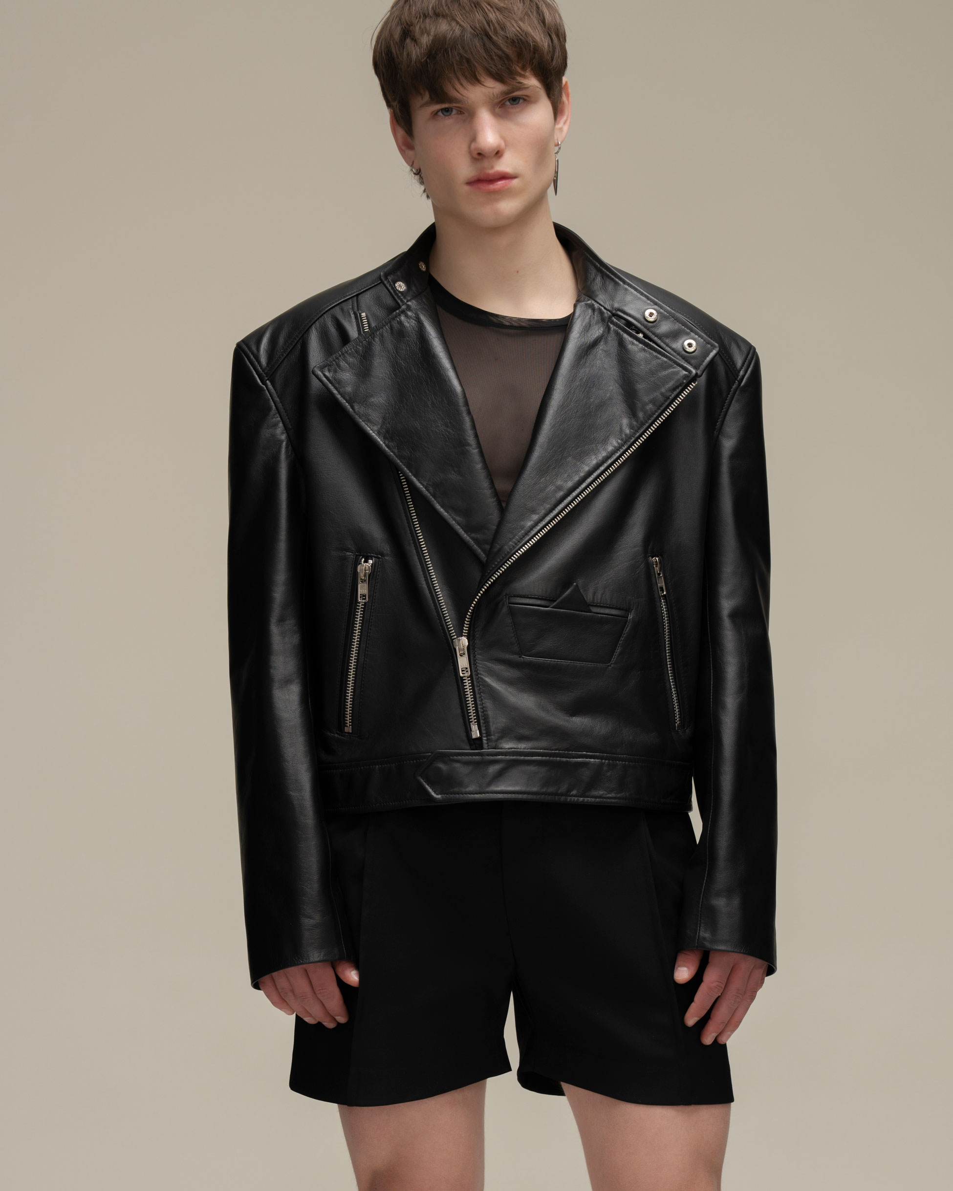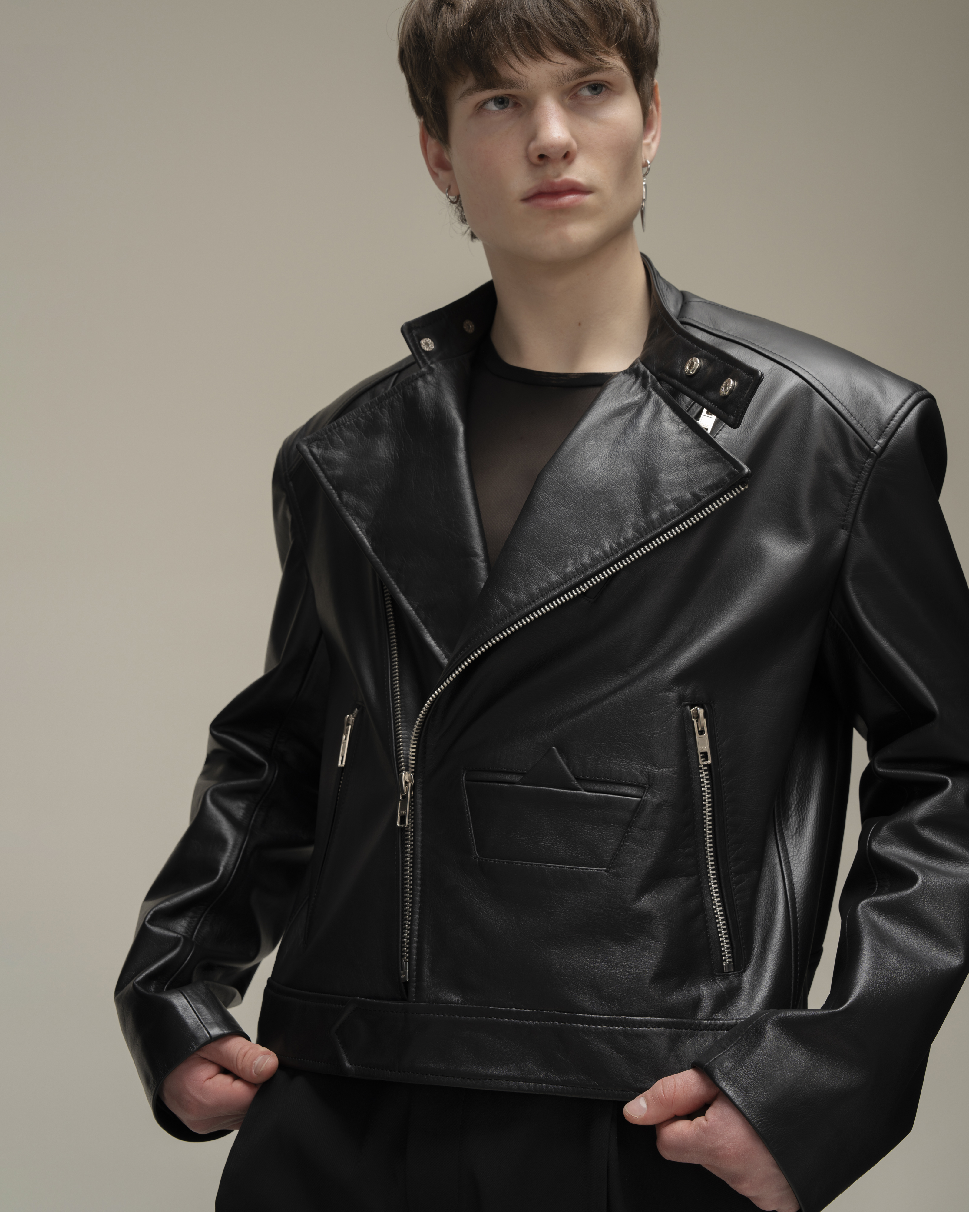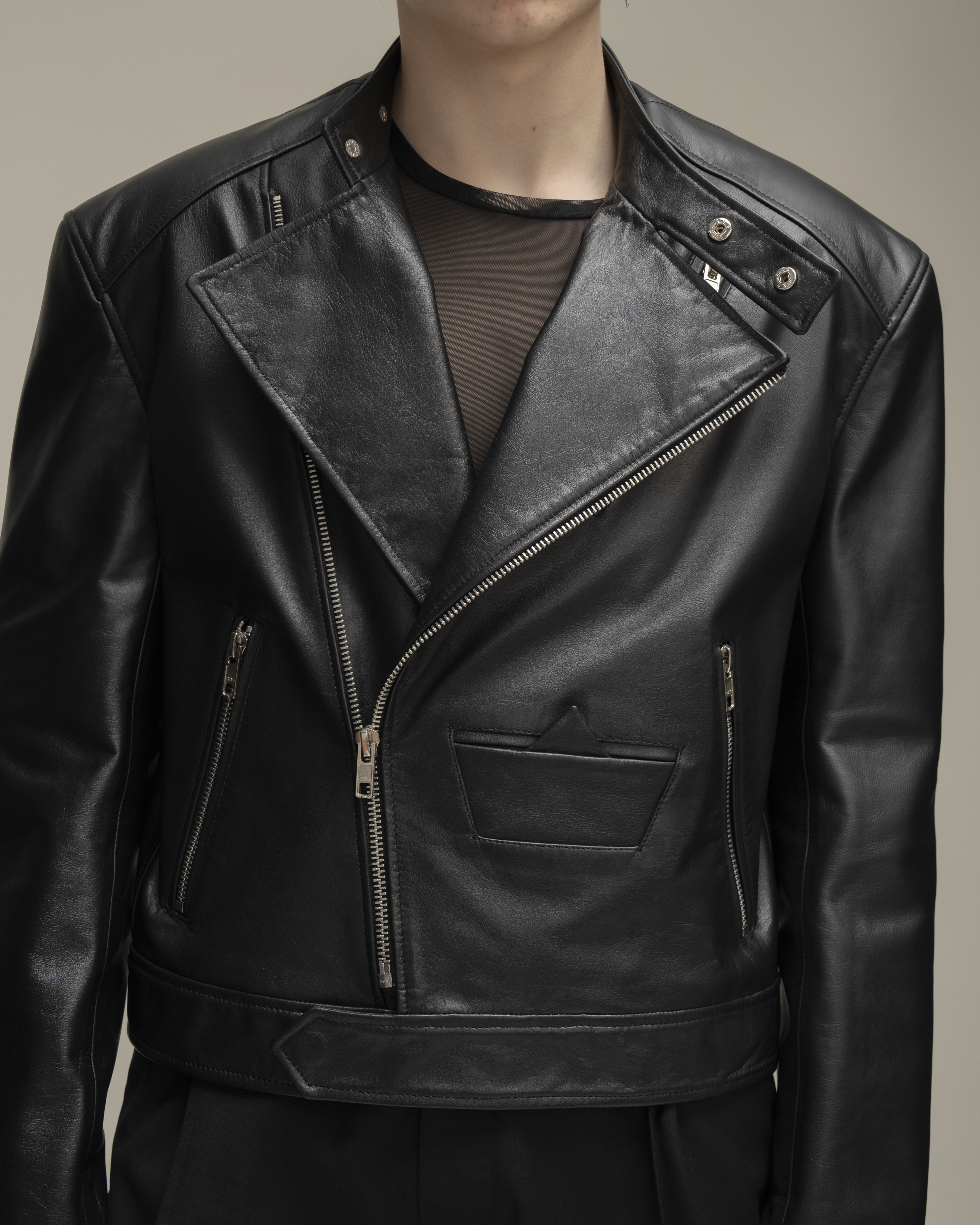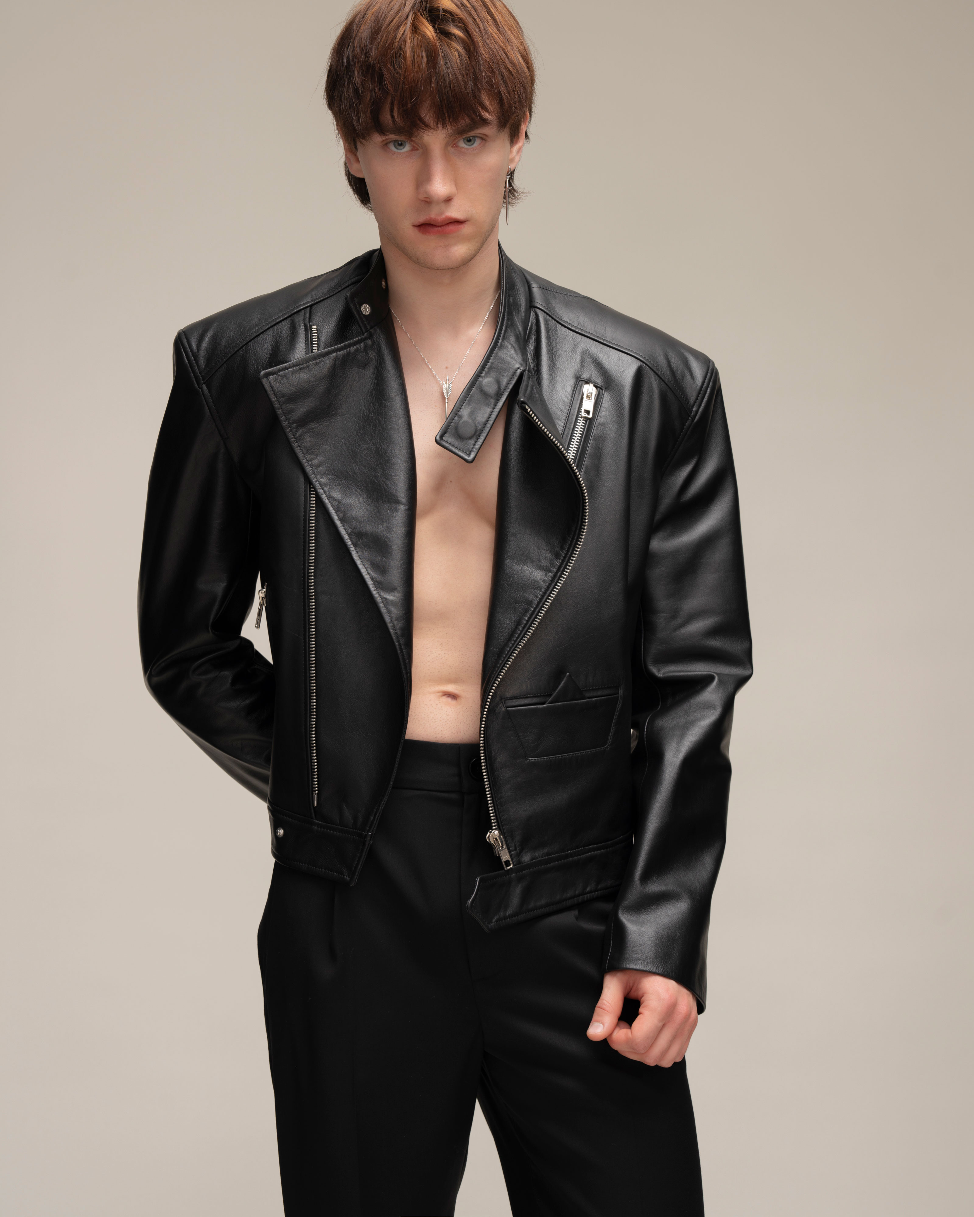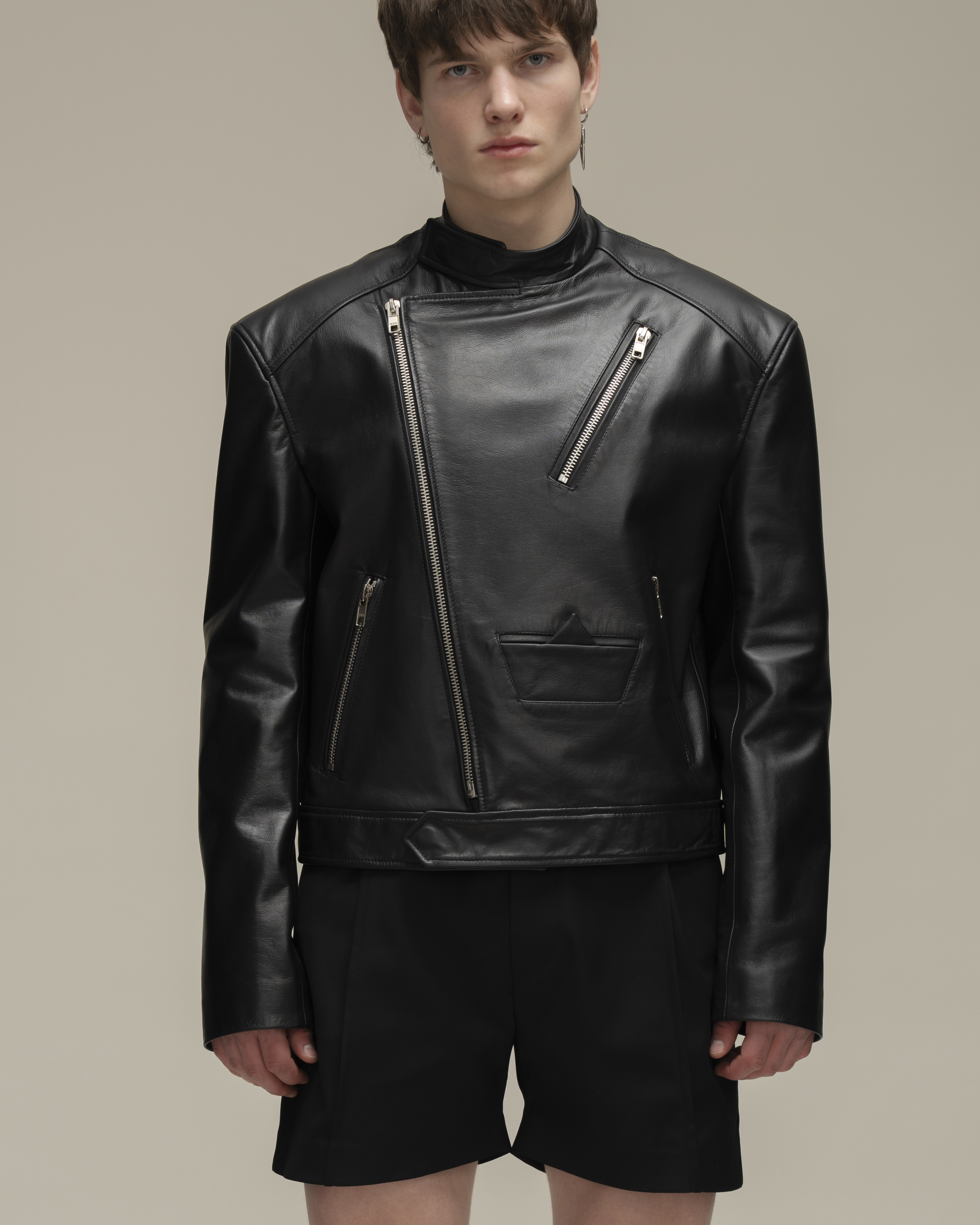 Косуха классического кроя из натуральной зернистой кожи. Воротник со стойкой и лацканами. Три кармана на молнии и карман-кораблик в технике оригами на полочке, один внутренний карман. Застежка на косую молнию по всей длине. Серебряная фурнитура.