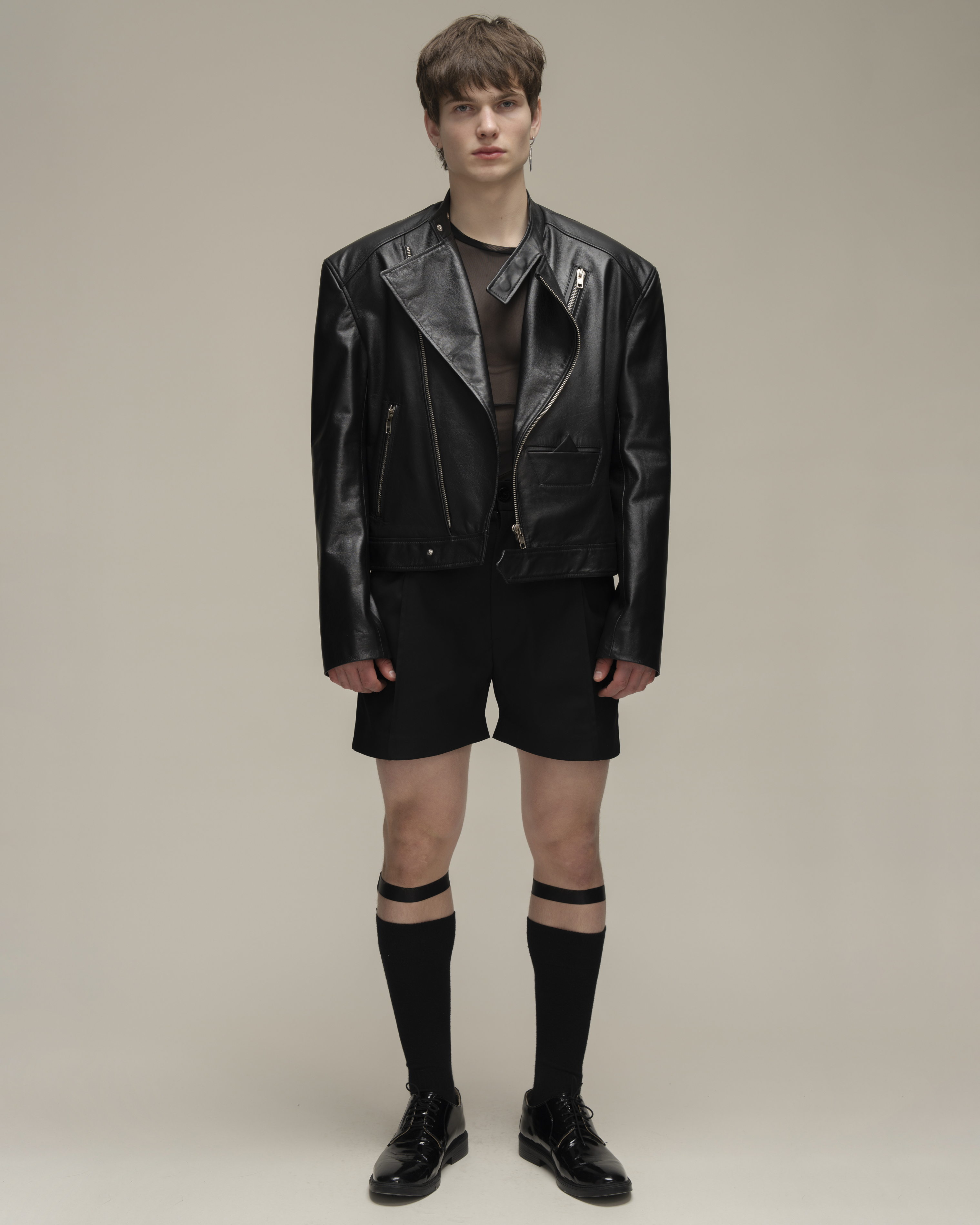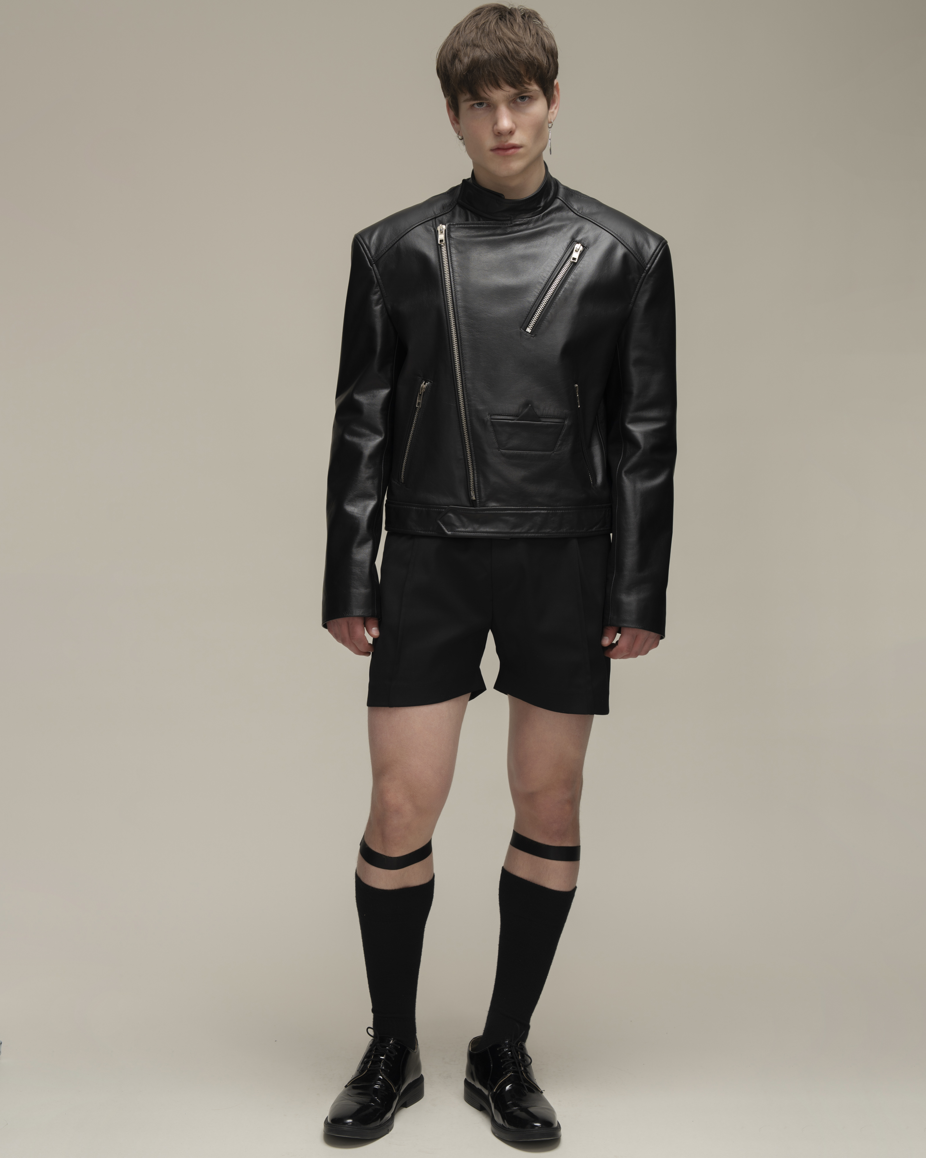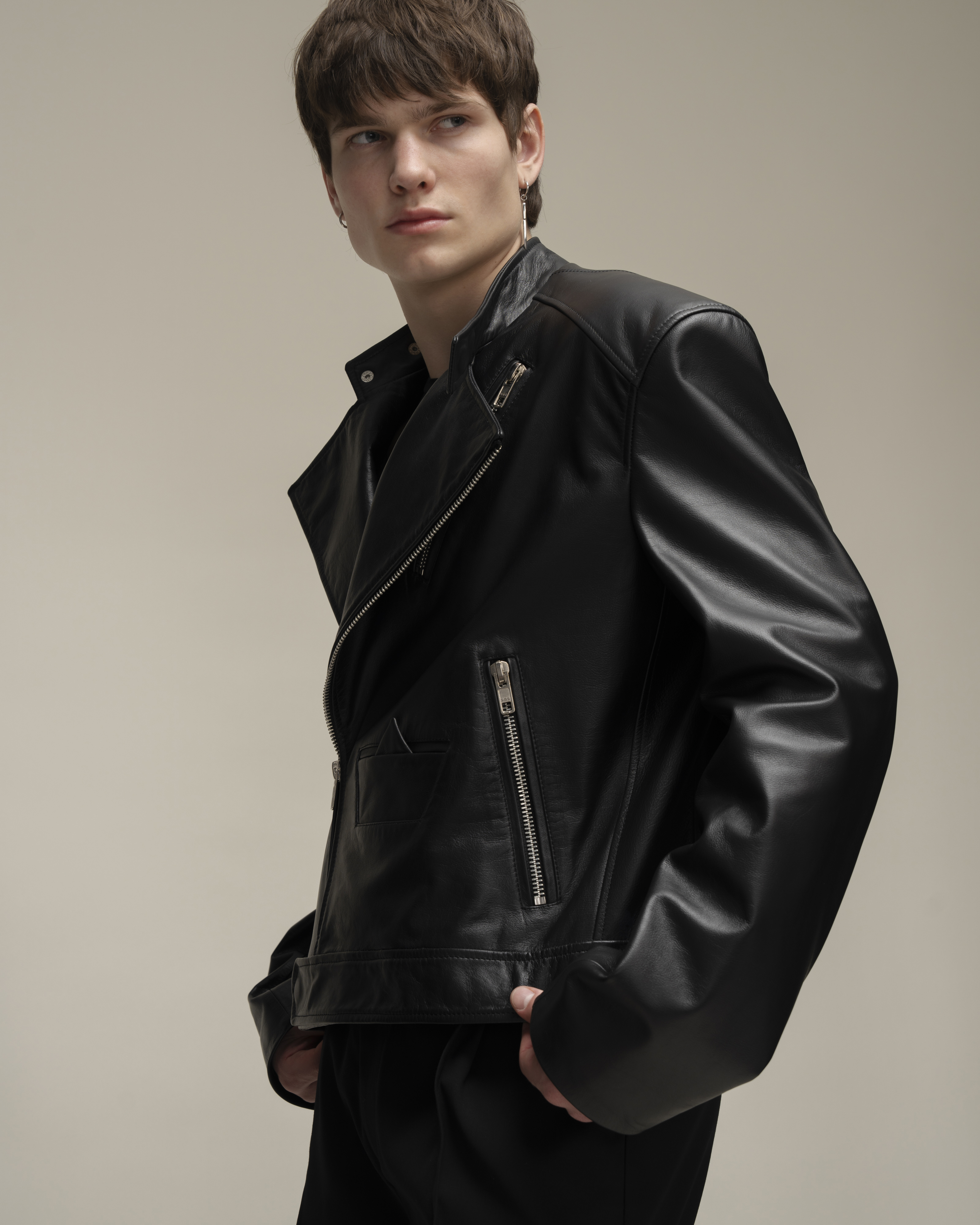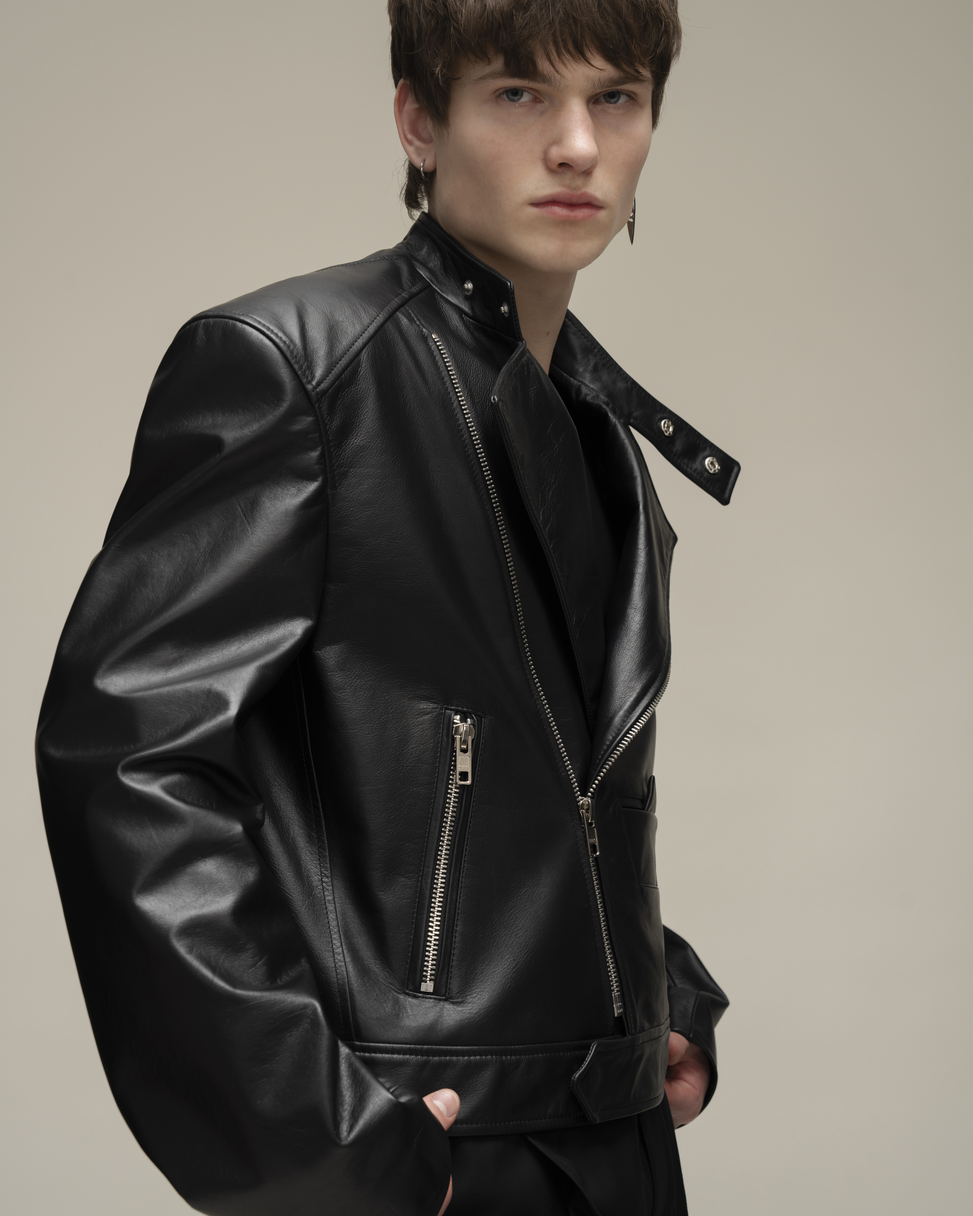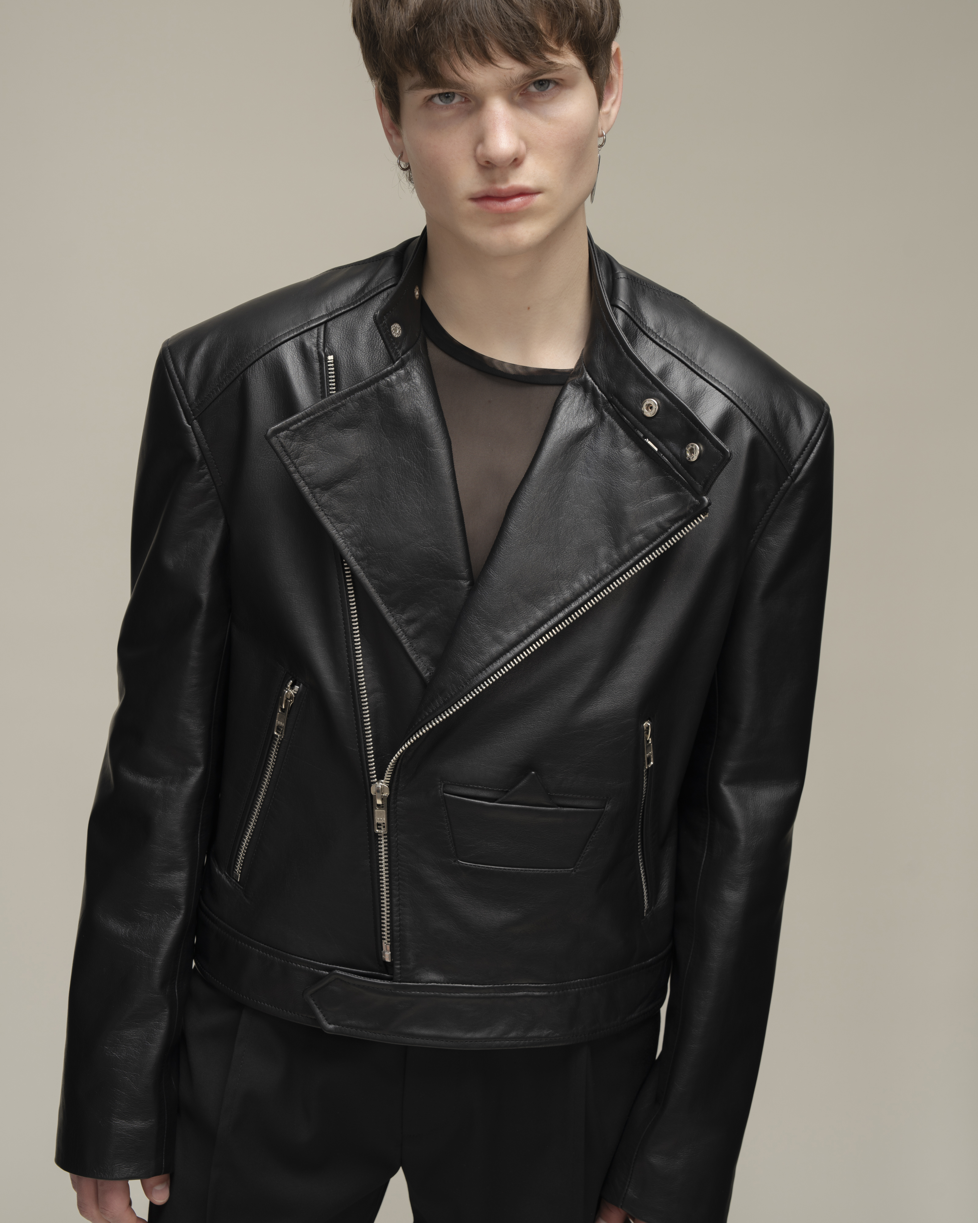 Косуха классического кроя из натуральной зернистой кожи. Воротник со стойкой и лацканами. Три кармана на молнии и карман-кораблик в технике оригами на полочке, один внутренний карман. Застежка на косую молнию по всей длине. Серебряная фурнитура.