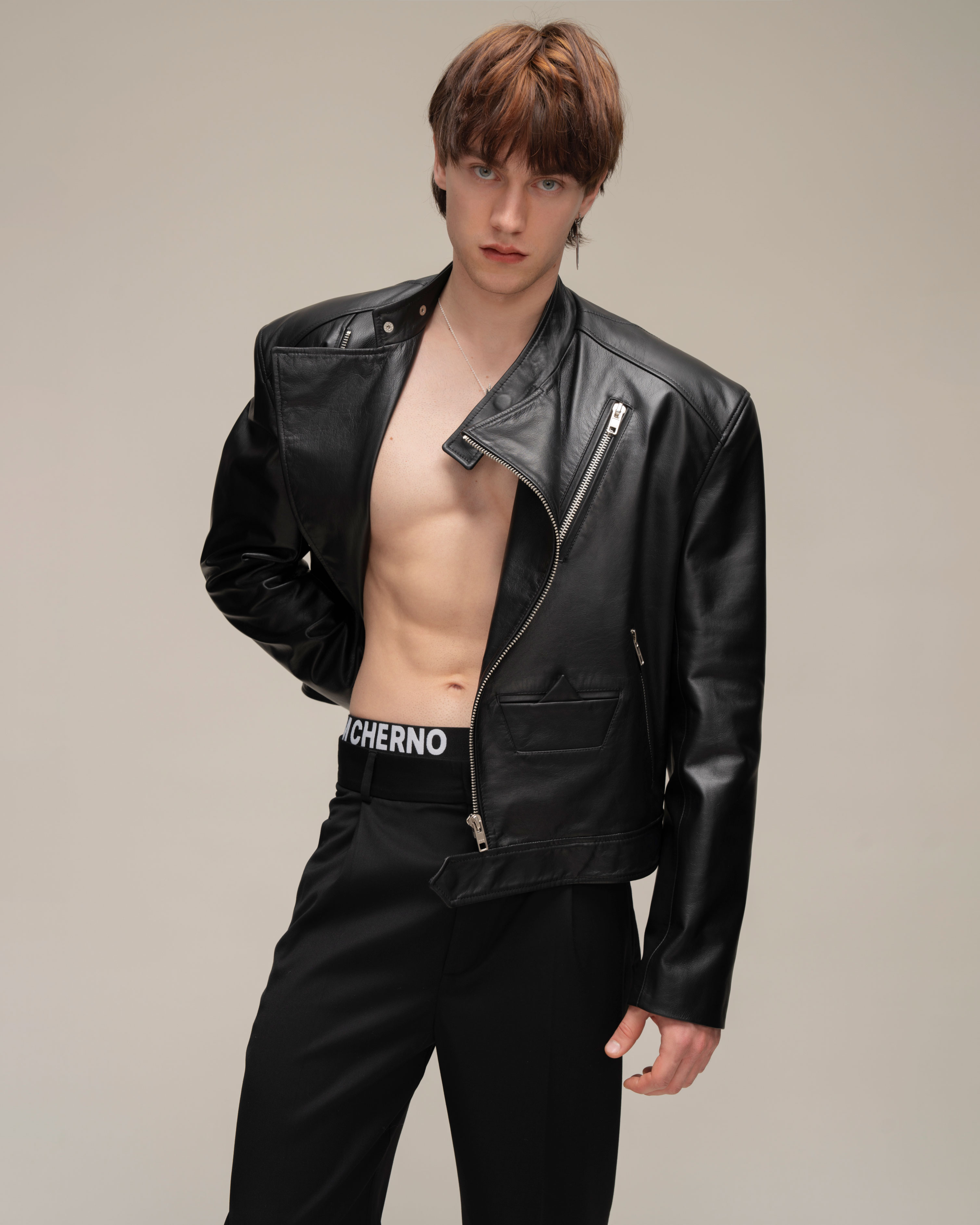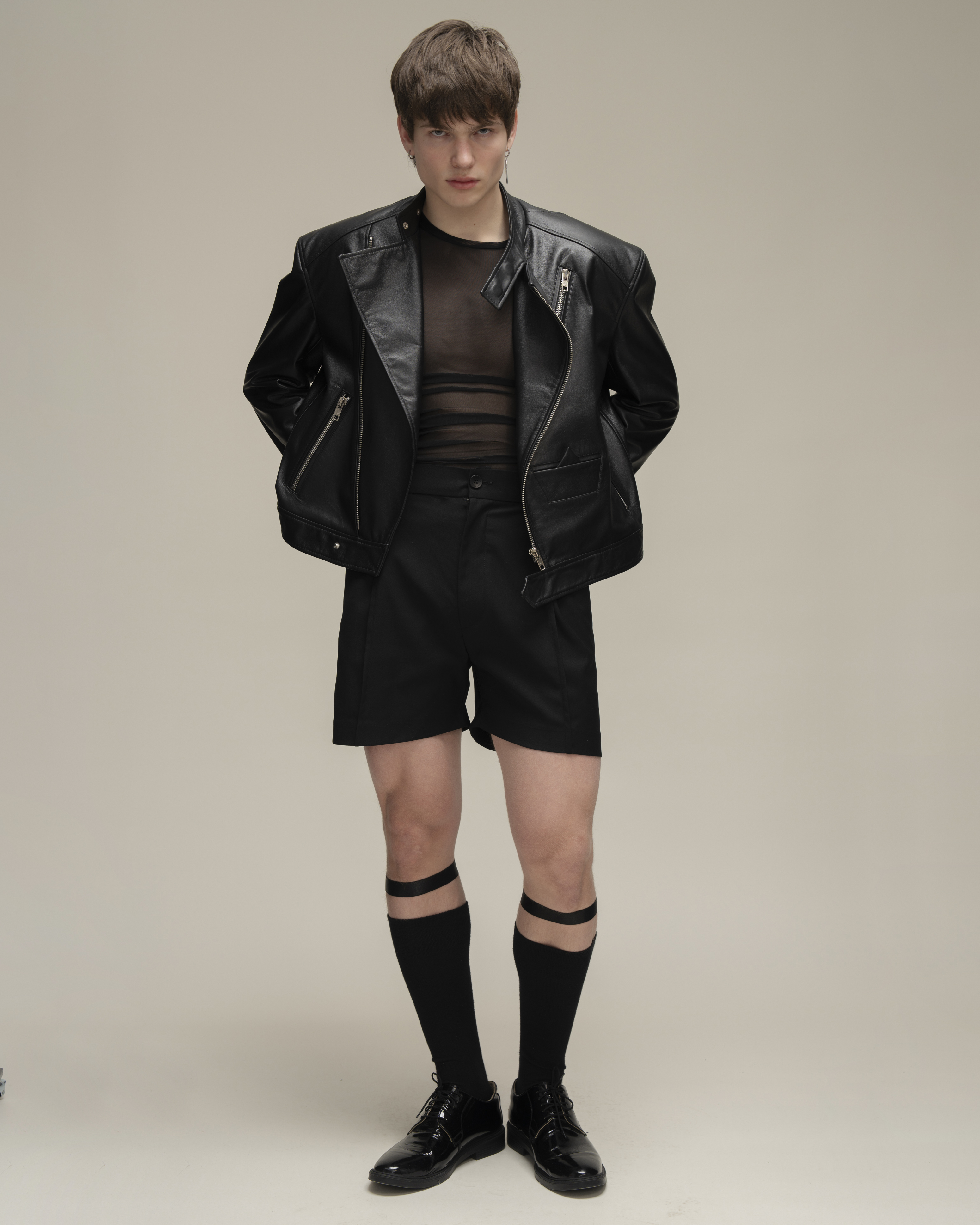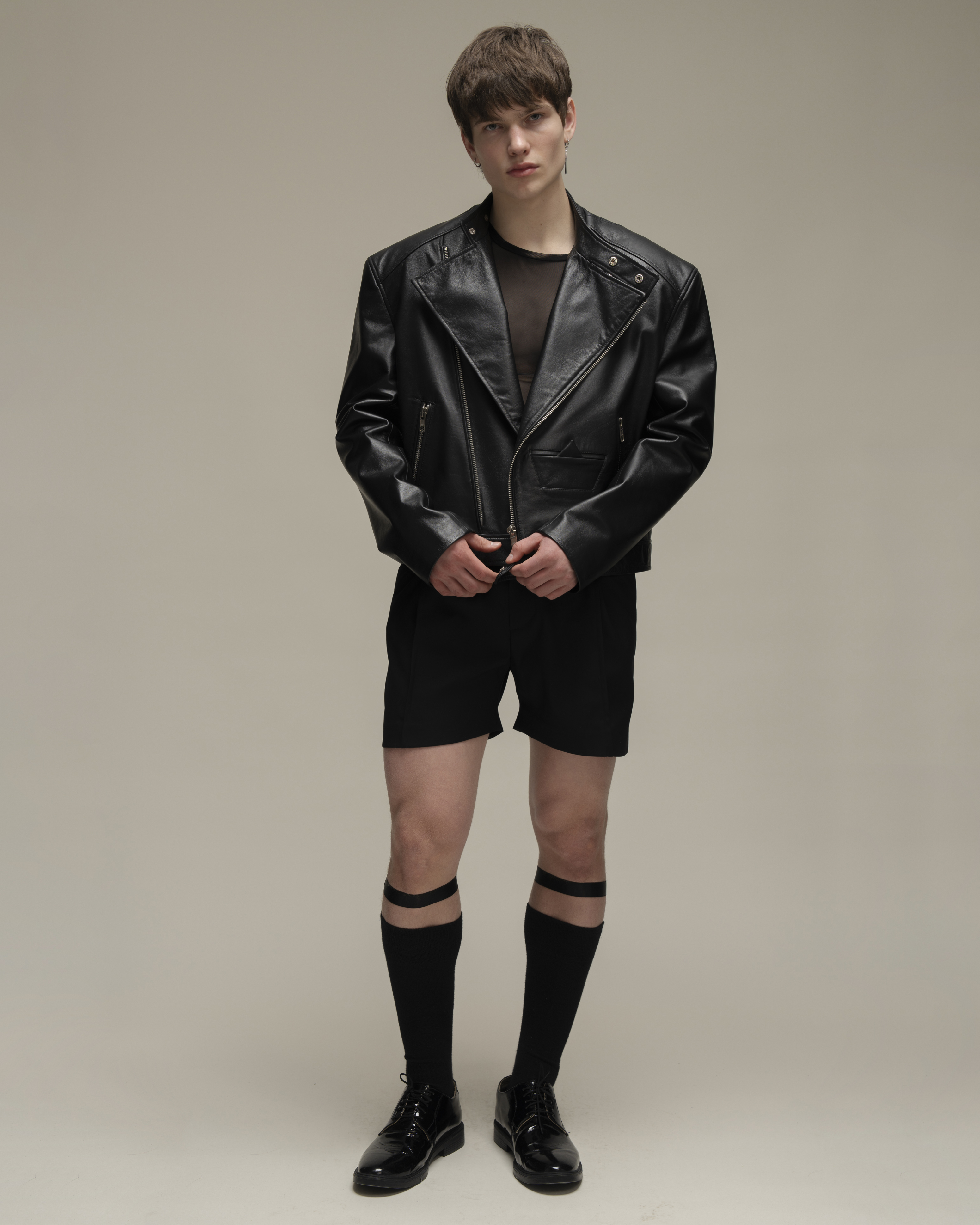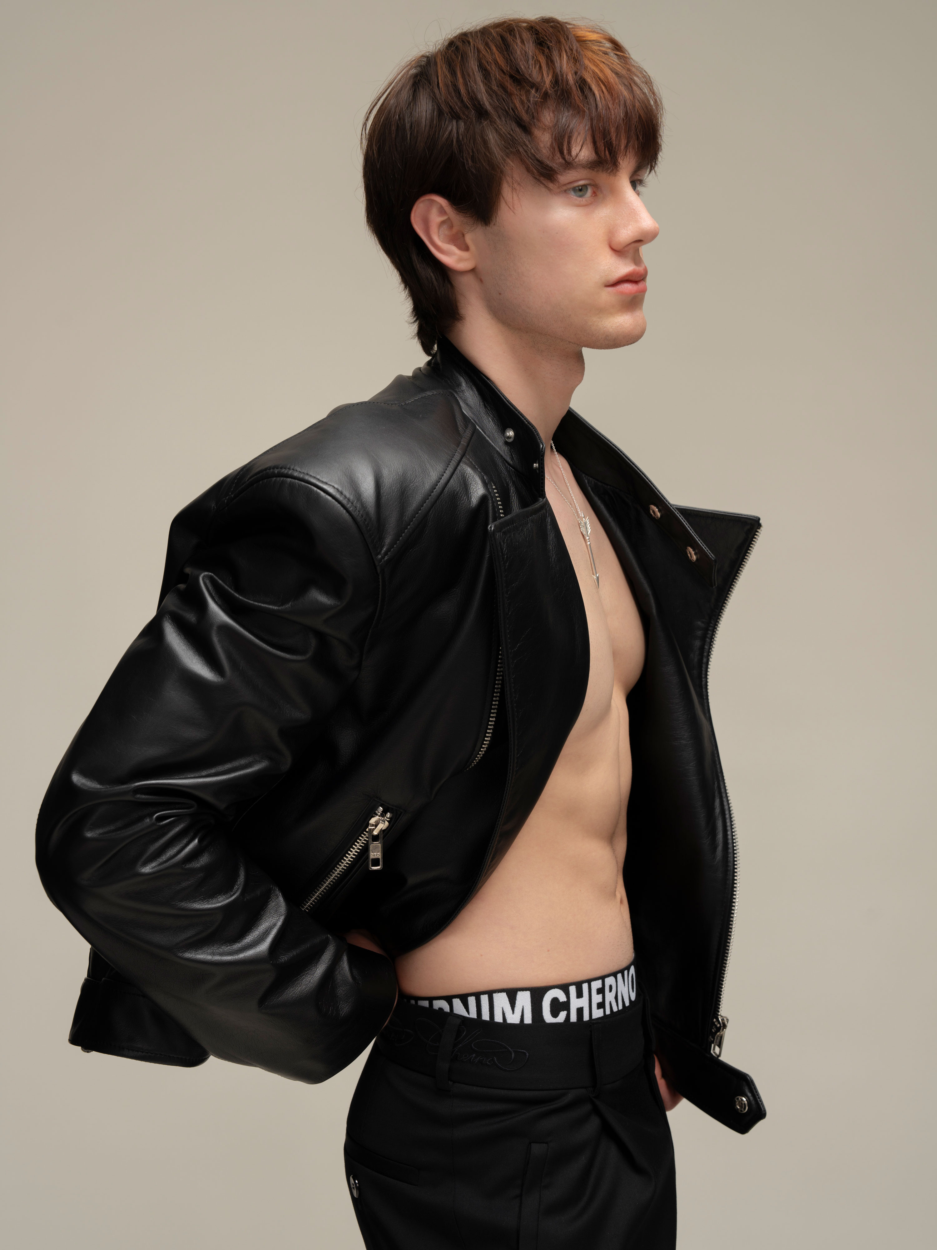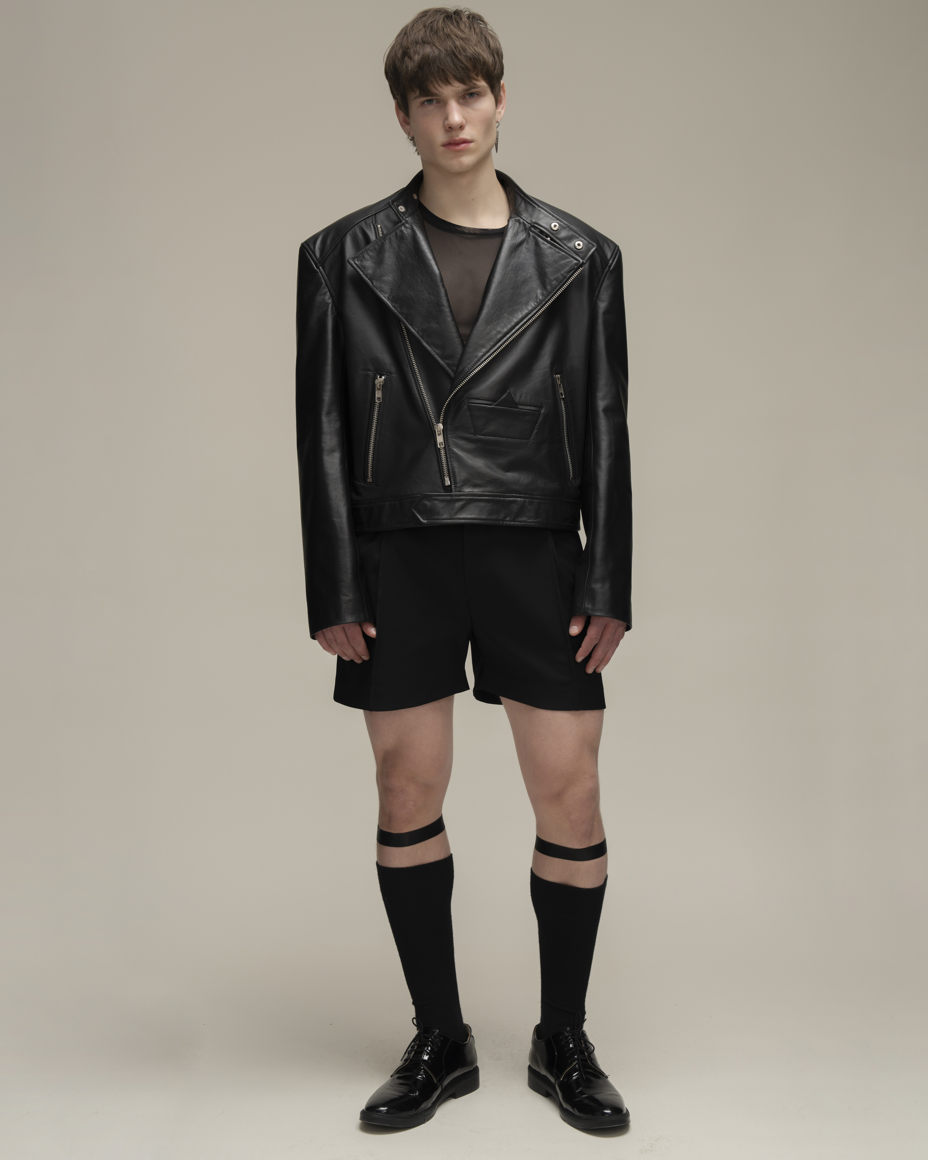 Косуха классического кроя из натуральной зернистой кожи. Воротник со стойкой и лацканами. Три кармана на молнии и карман-кораблик в технике оригами на полочке, один внутренний карман. Застежка на косую молнию по всей длине. Серебряная фурнитура.