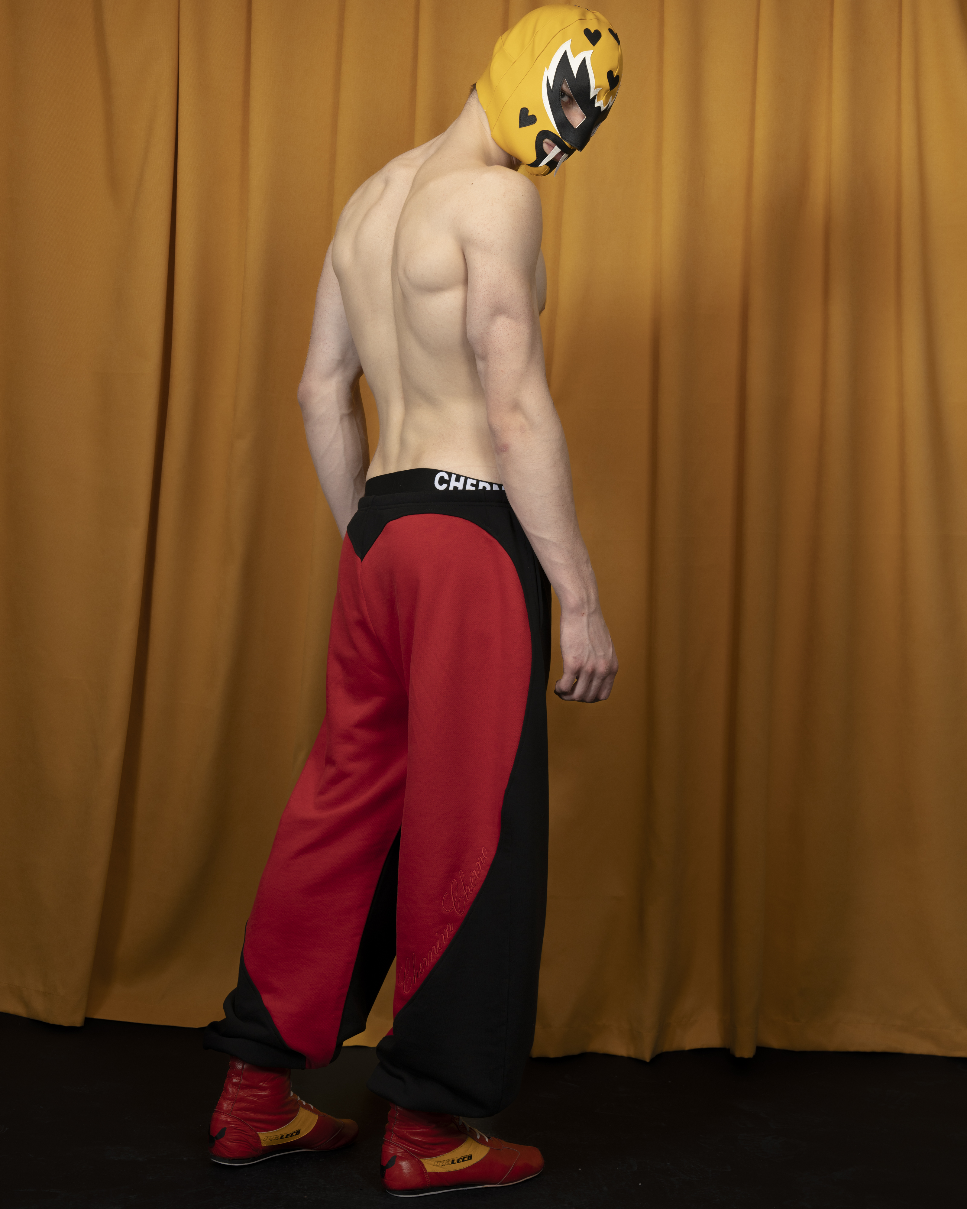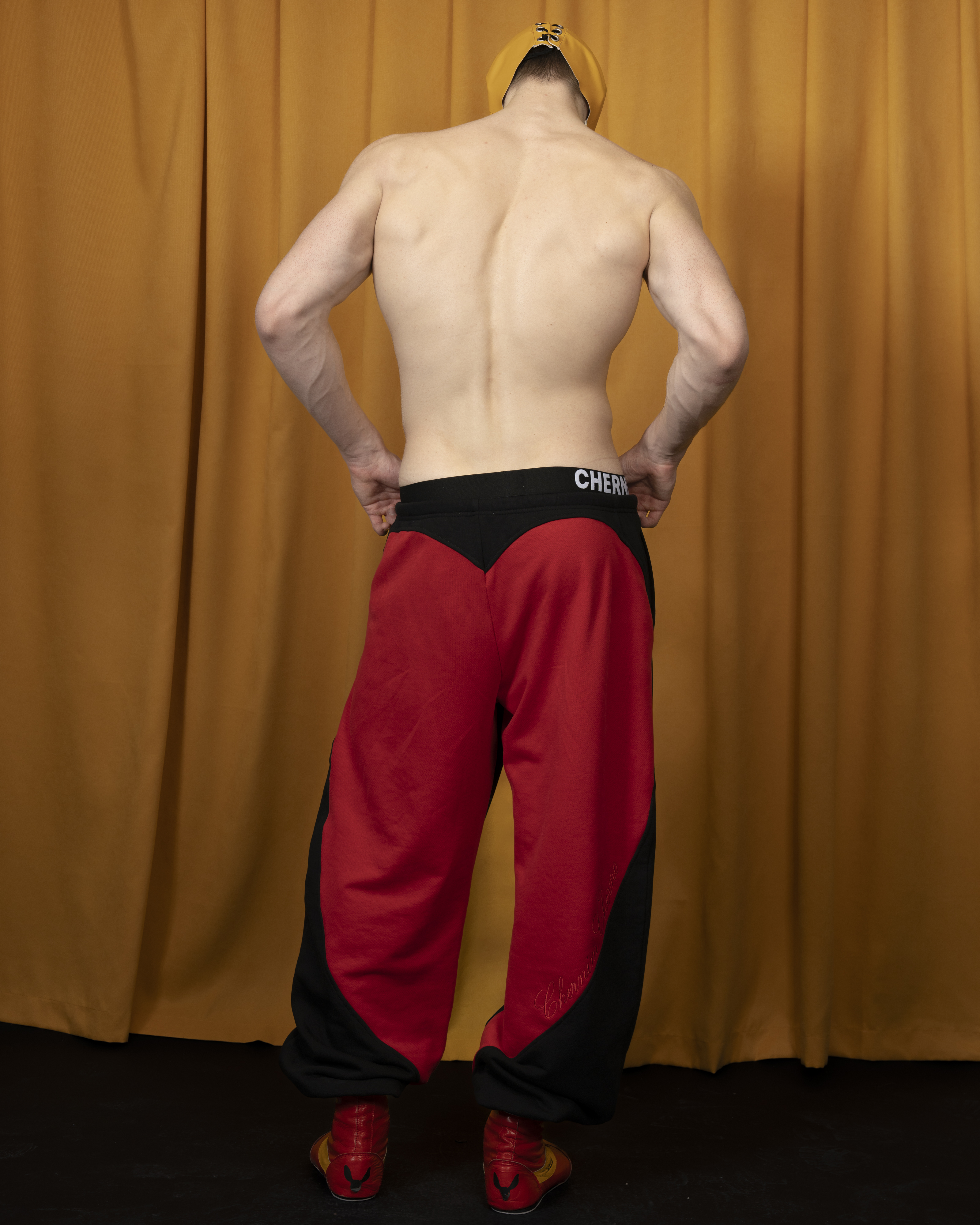 Брюки из плотного футера с двумя боковыми карманами, пояс на резинке с внутренним шнуром. Сзади — вшитая контрастная деталь в форме большого сердца. Крупная каллиграфическая вышивка Chernim Cherno вдоль штанины. Низ брюк на резинке.