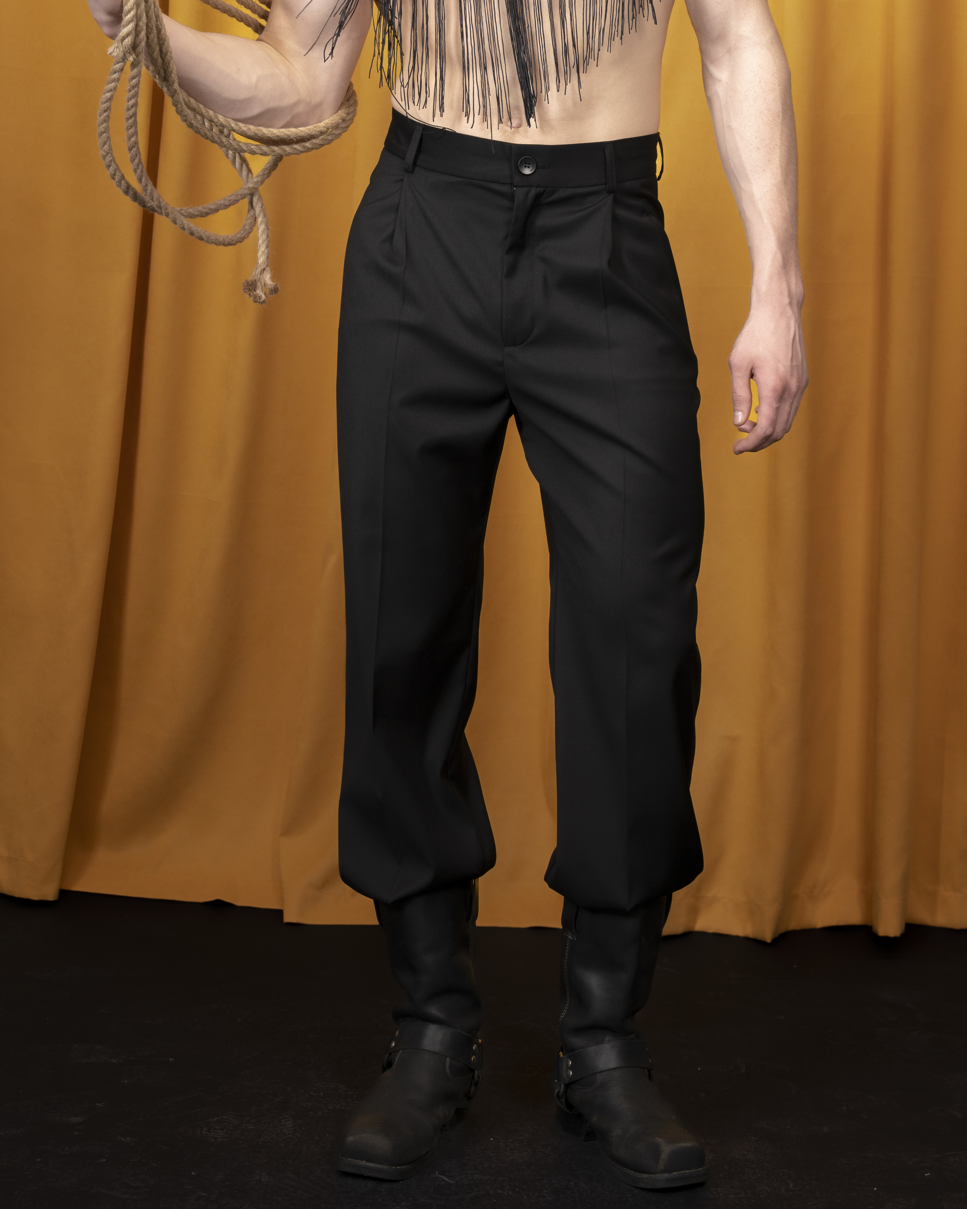 Брюки с каллиграфической вышивкой на поясе в тон ткани. На переде две складки, два боковых кармана, один задний.