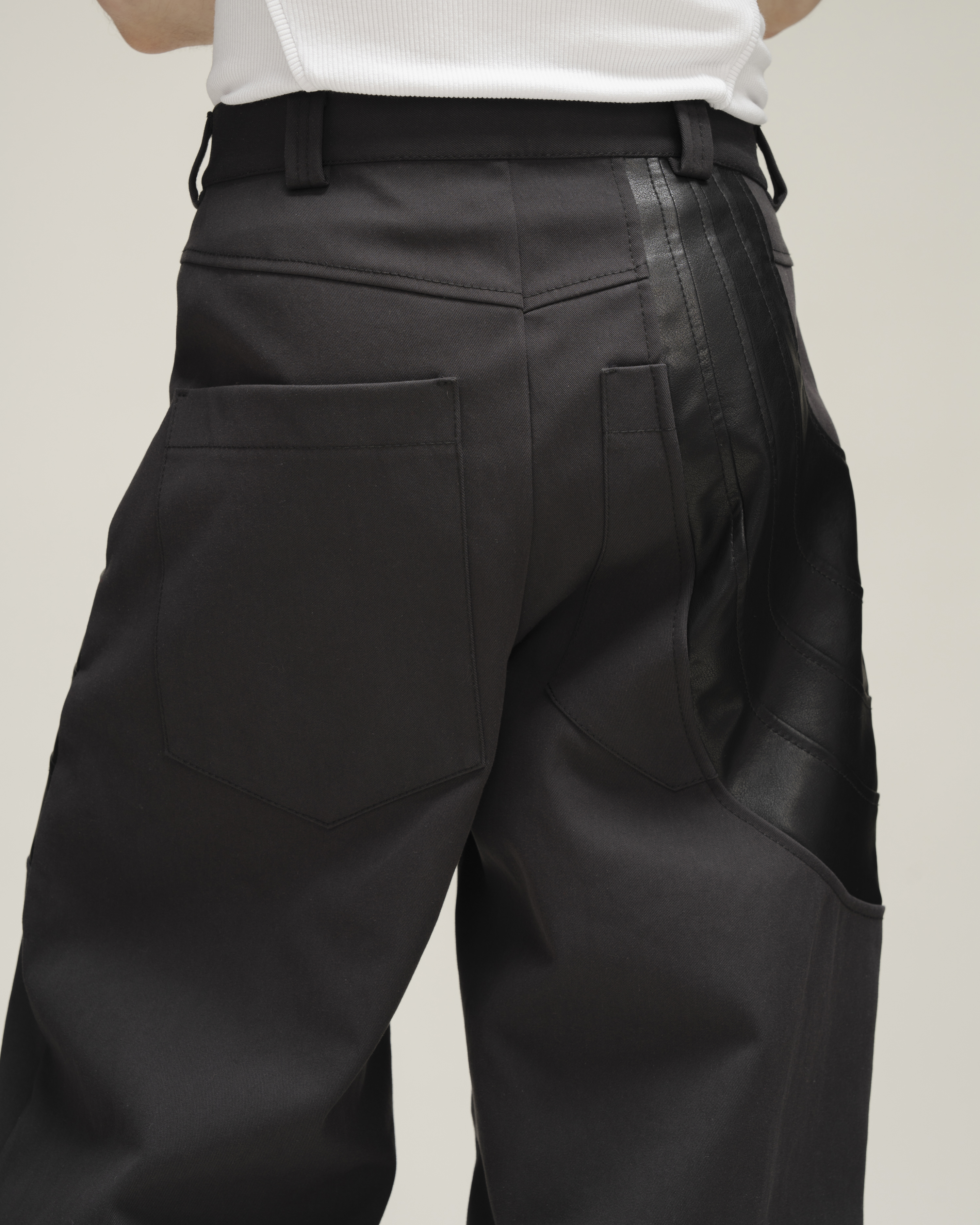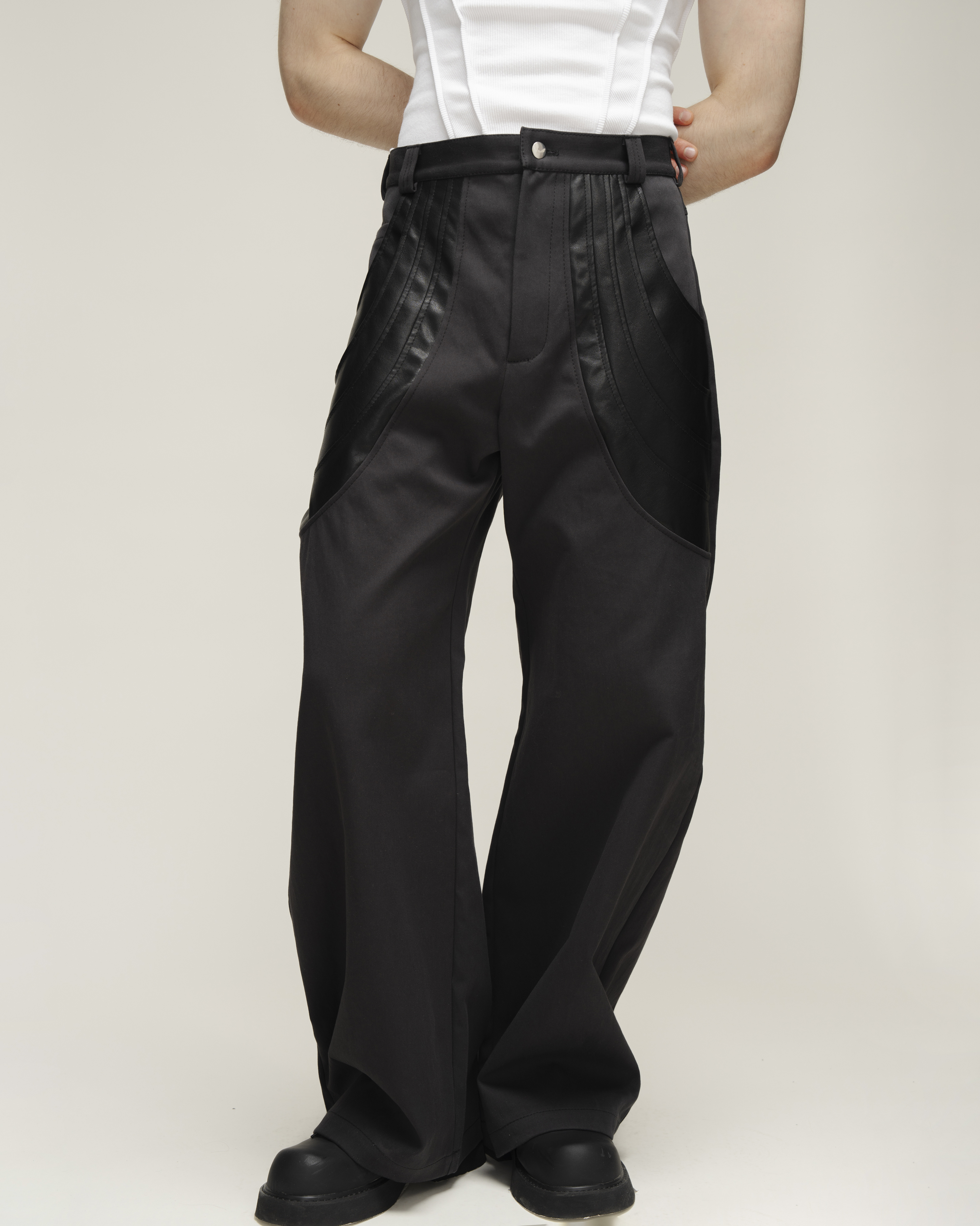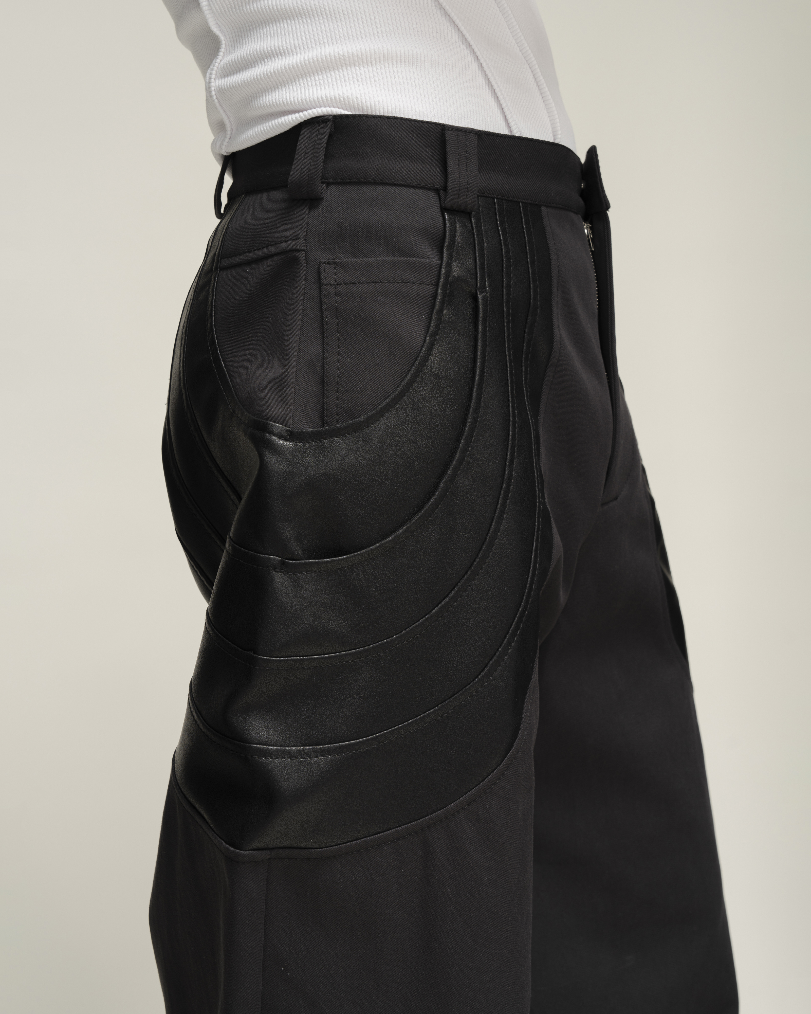 Брюки о-силуэта из плотной джинсовой ткани с застывшими драпировками из экокожи. Шесть карманов: четыре прорезных и два накладных(спереди и сзади). Застегиваются на молнию и брендированную пуговицу.