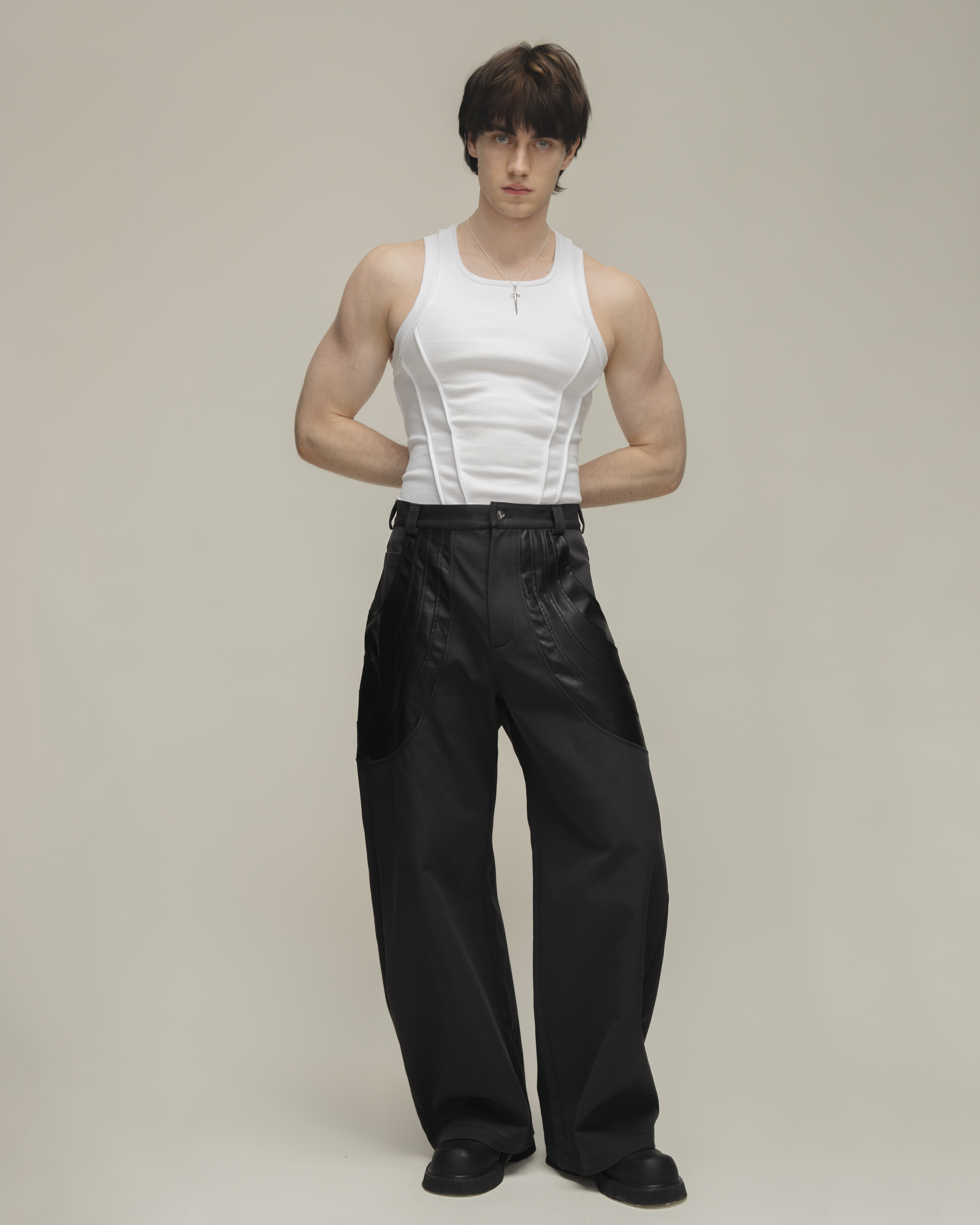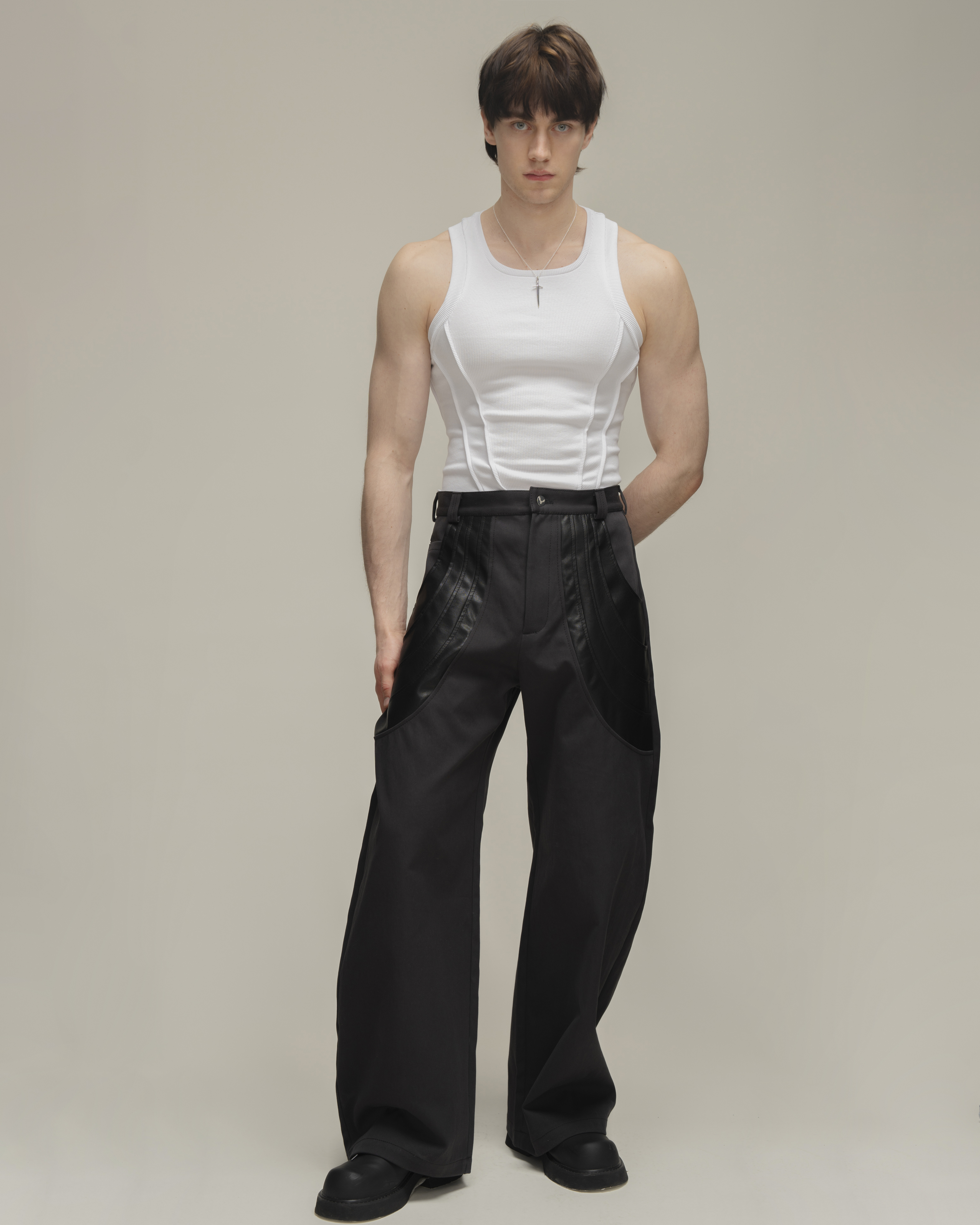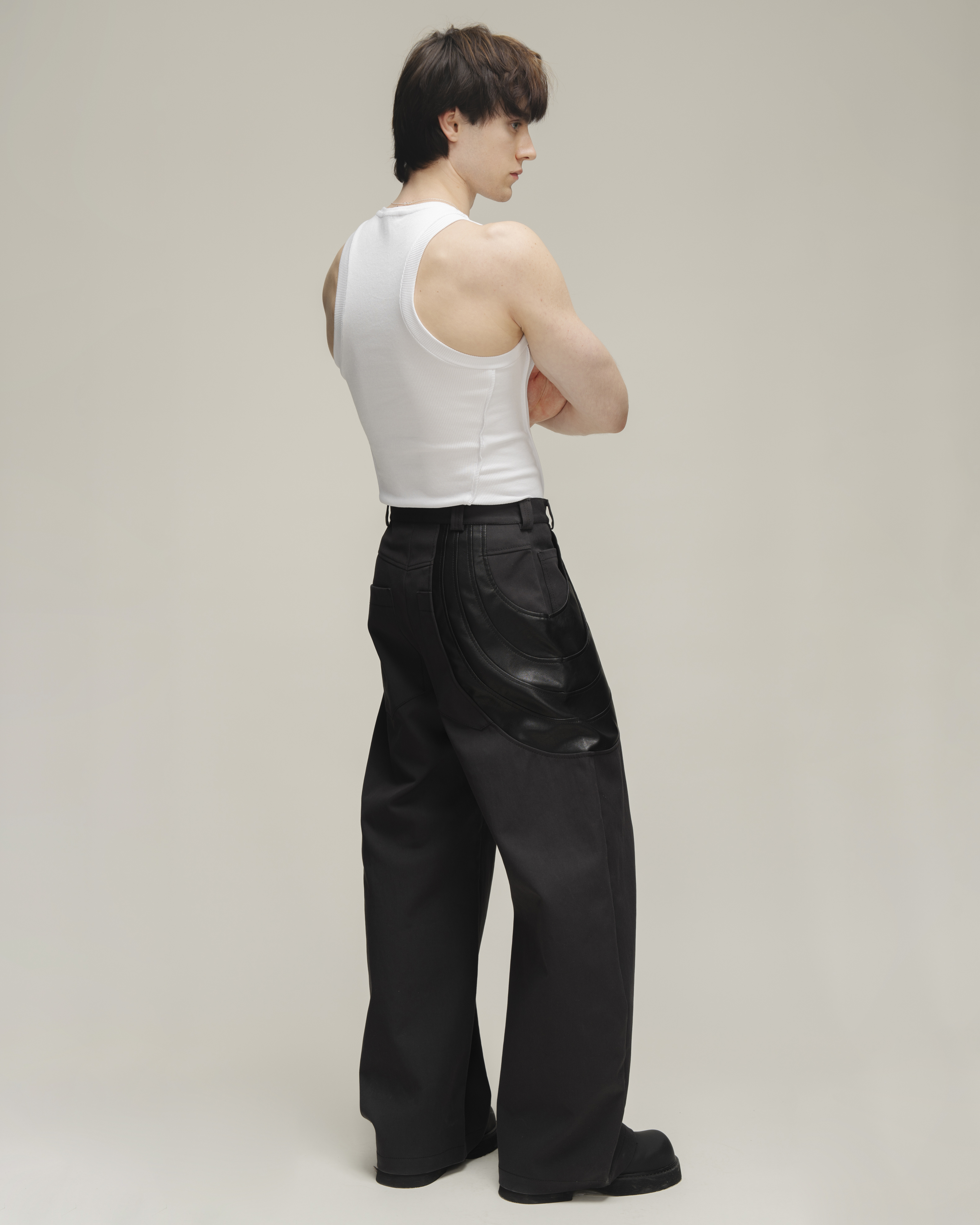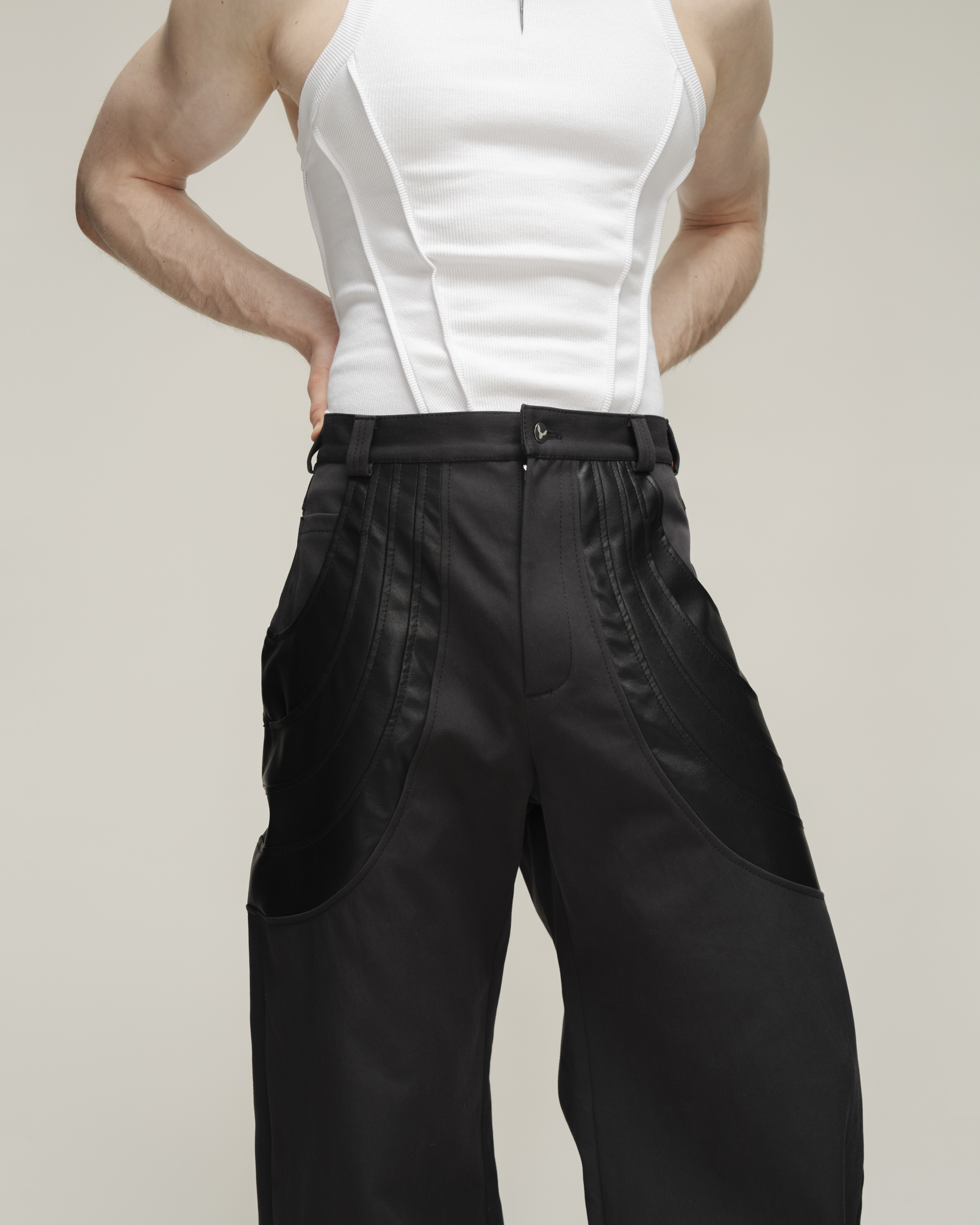 Брюки о-силуэта из плотной джинсовой ткани с застывшими драпировками из экокожи. Шесть карманов: четыре прорезных и два накладных(спереди и сзади). Застегиваются на молнию и брендированную пуговицу.