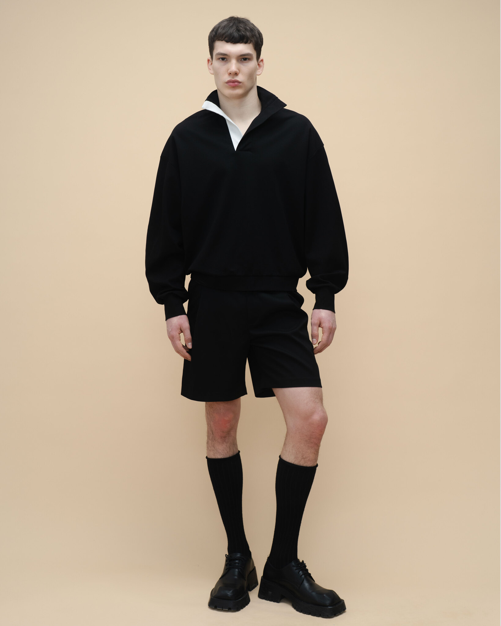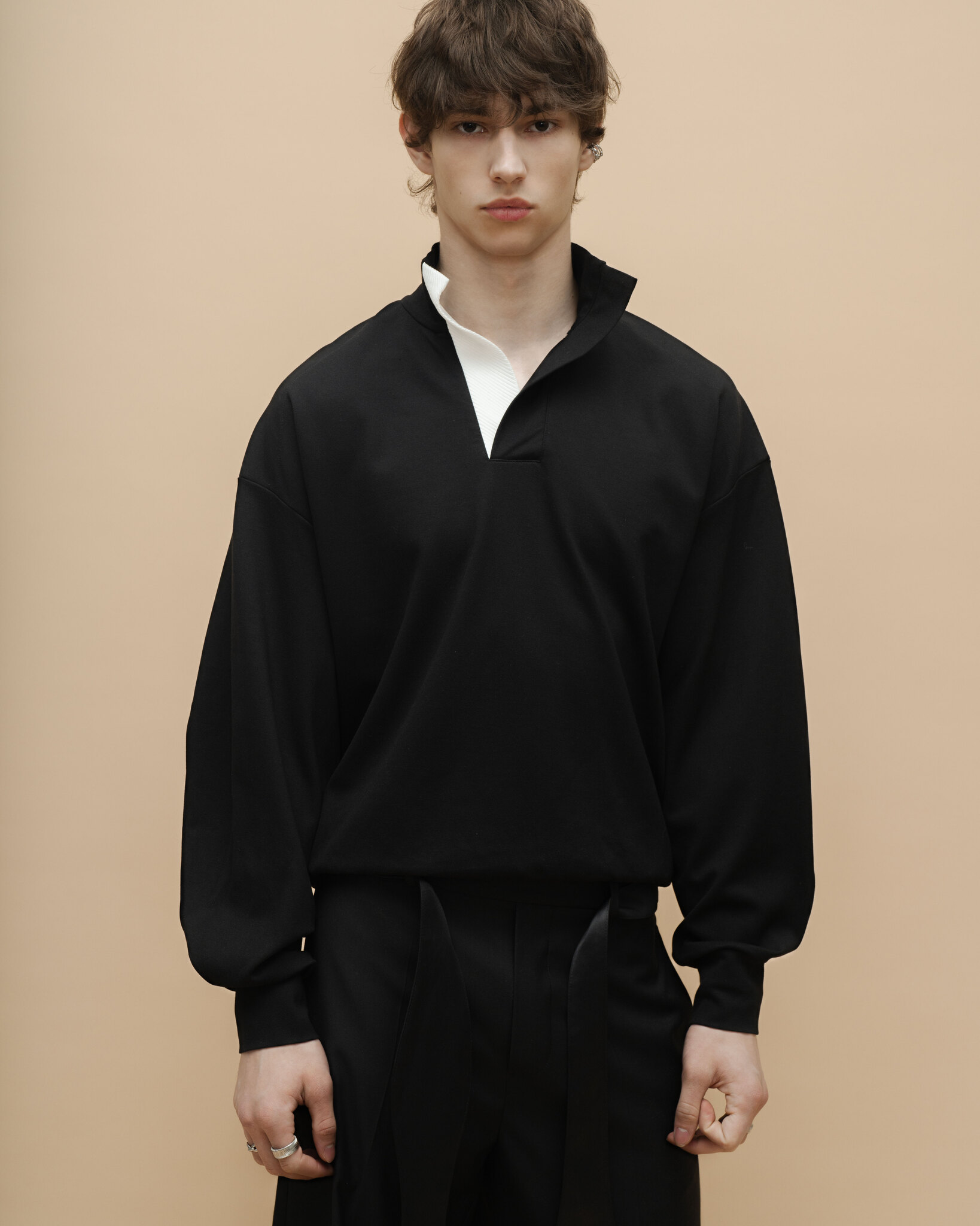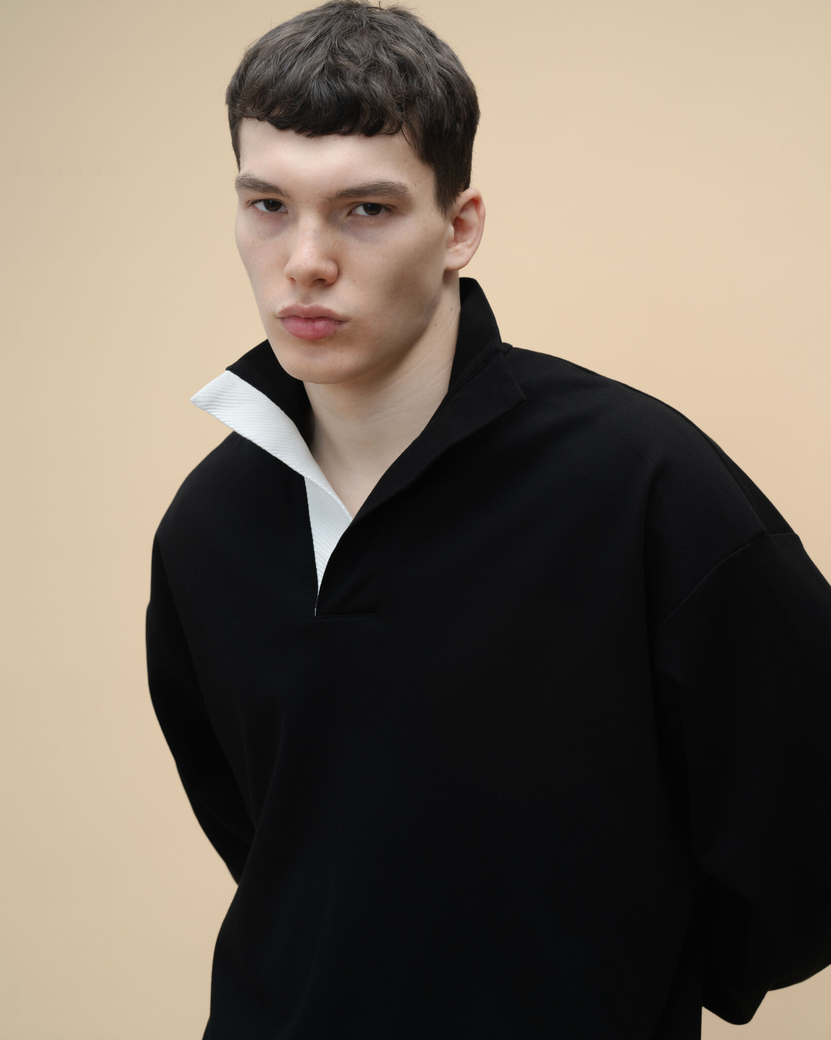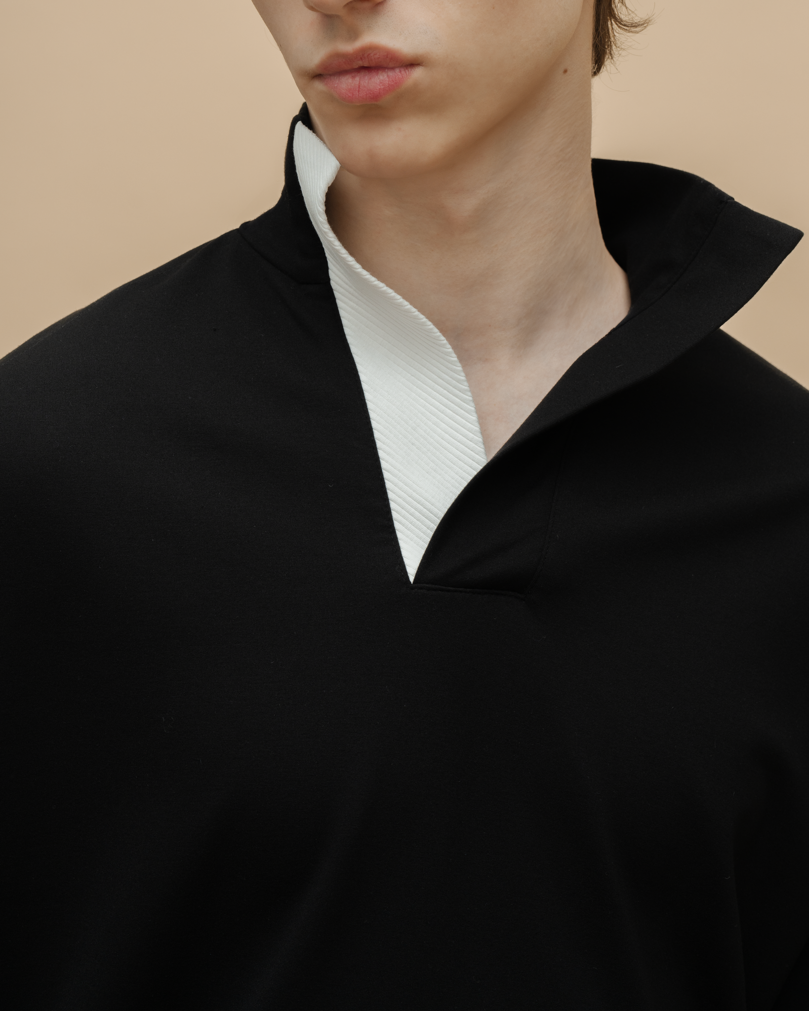Лонгслив из смесовой пластичной ткани с декоративной составной уплотненной планкой. Нижняя часть планки из молочной ткани с фактурой рубчика.