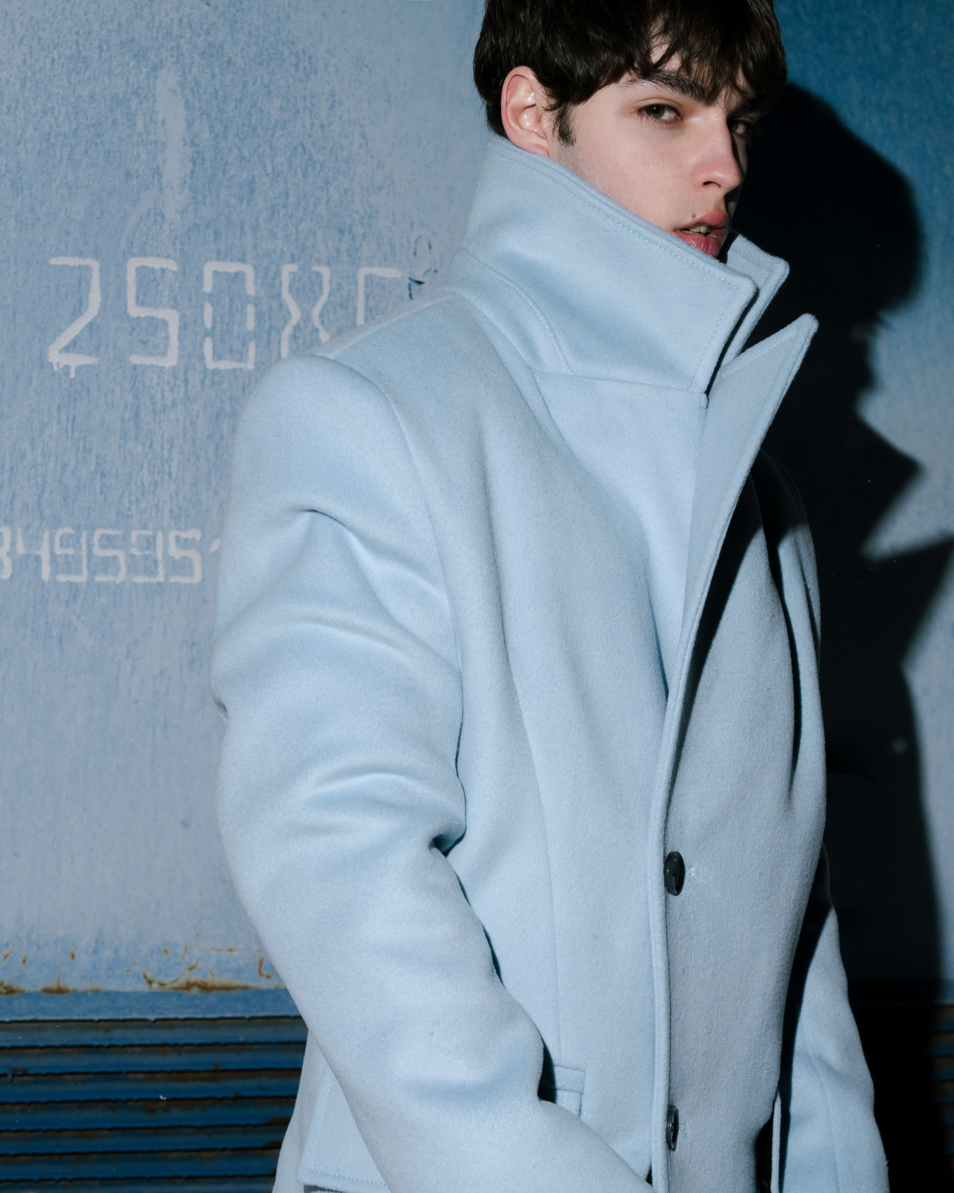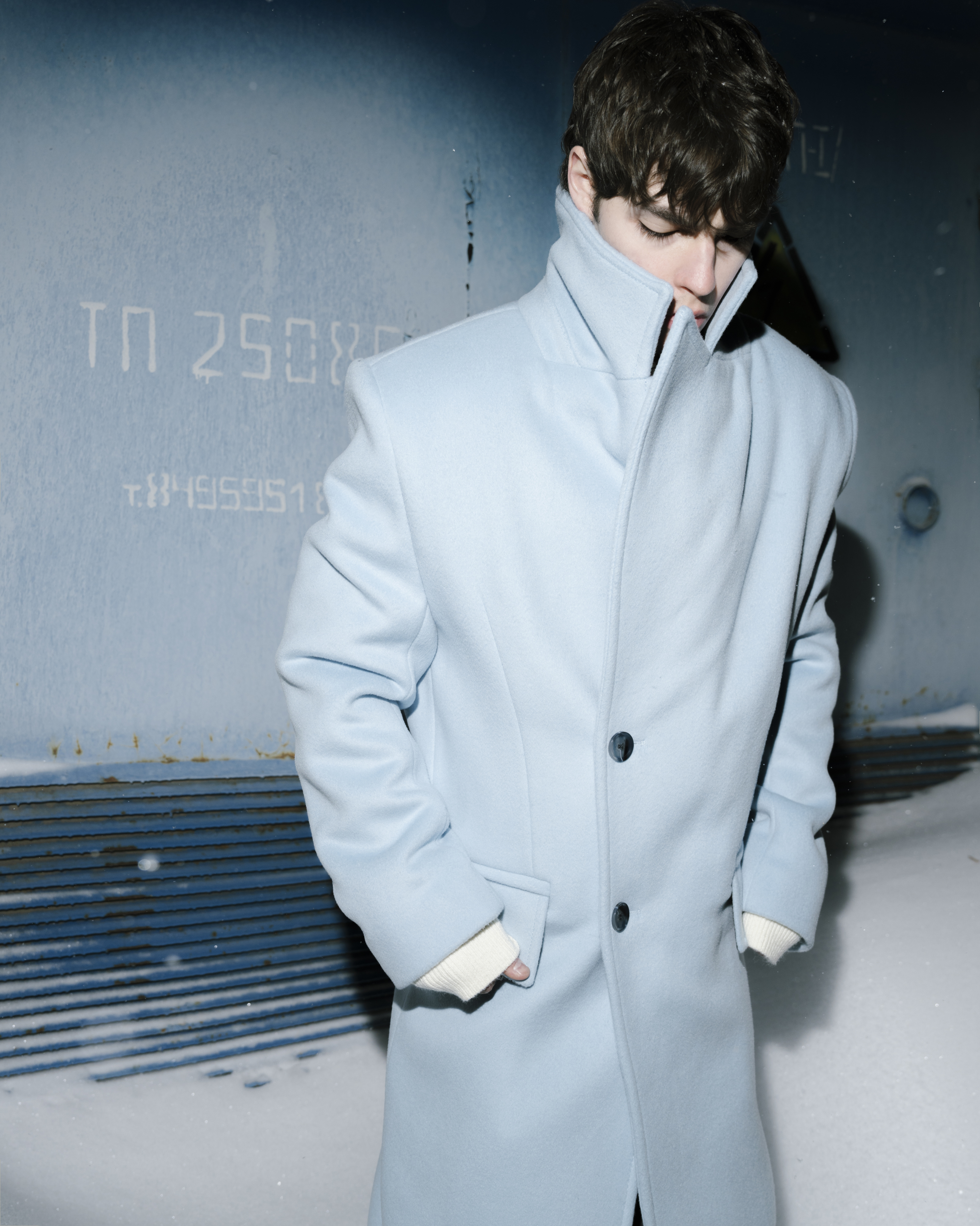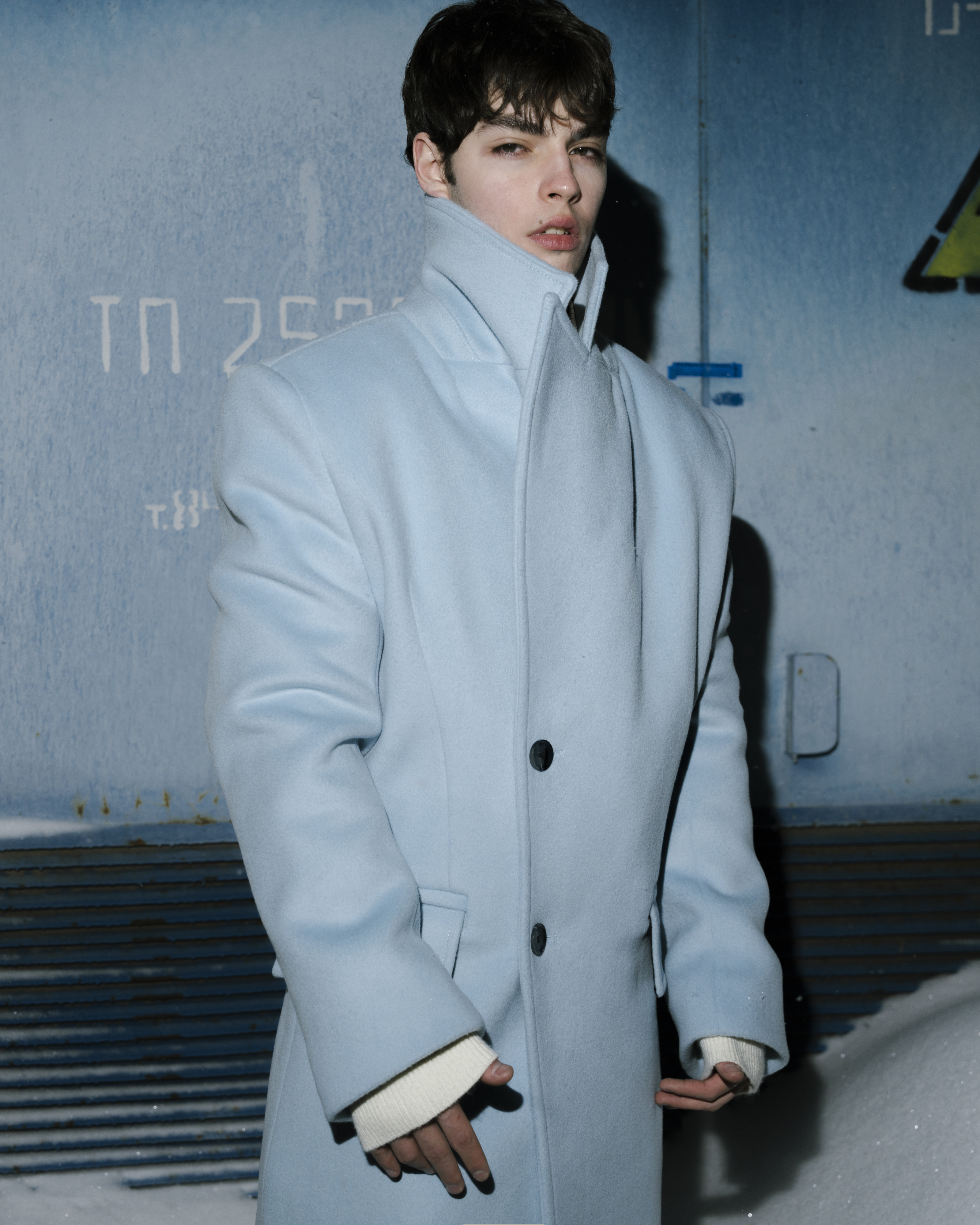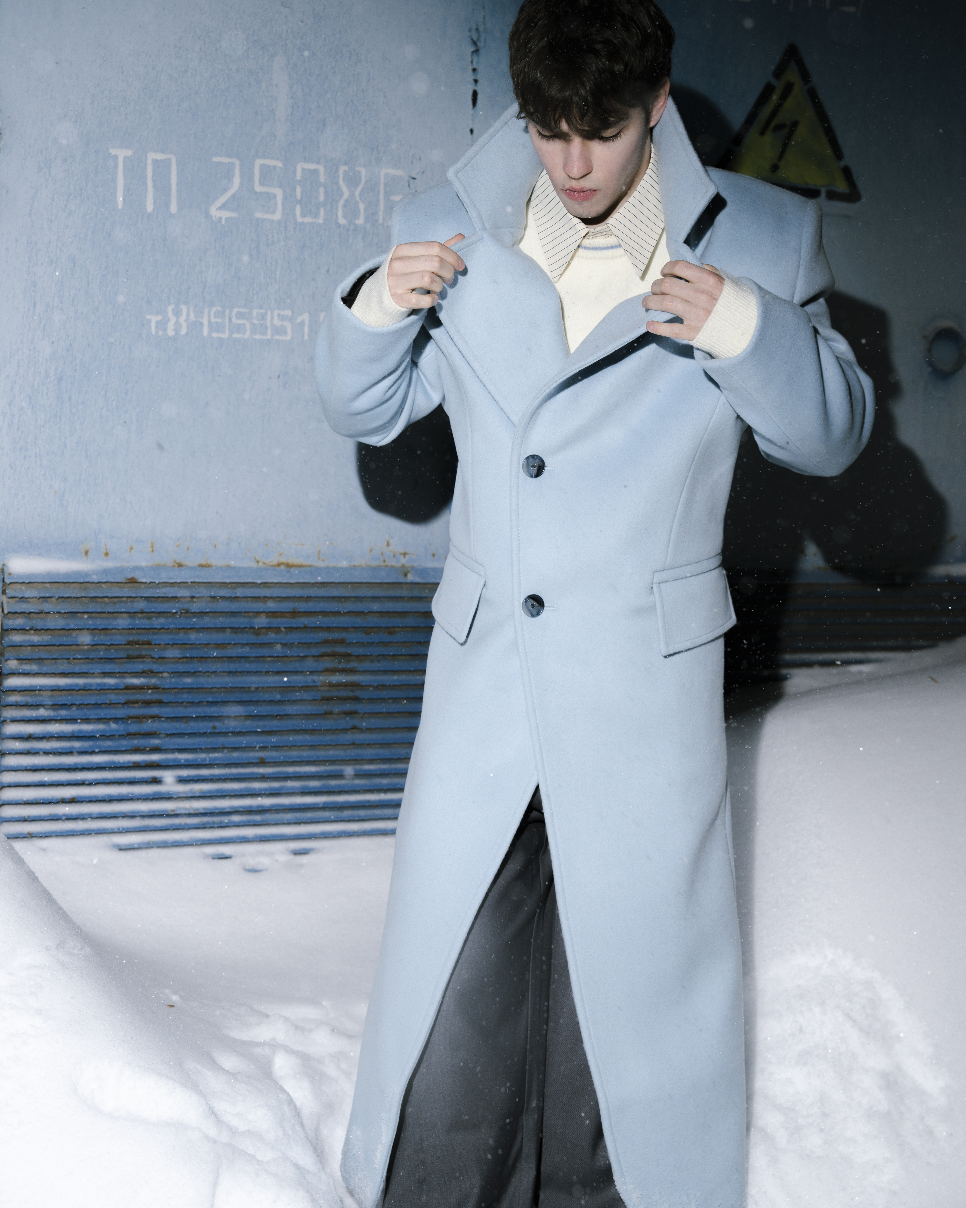 Длинное пальто из 100% австралийской шерсти с ассиметричным бортом с закругленным низом. Застёжка на две прорезные глазковые петли и пуговицы. На переде два прорезных кармана с клапаном. Спинка с двумя высокими шлицами и широким регулирующимся хлястиком на петлях и пуговицах. Широкая отстрочка по борту всего изделия, воротнику в тон. Один внутренний карман.