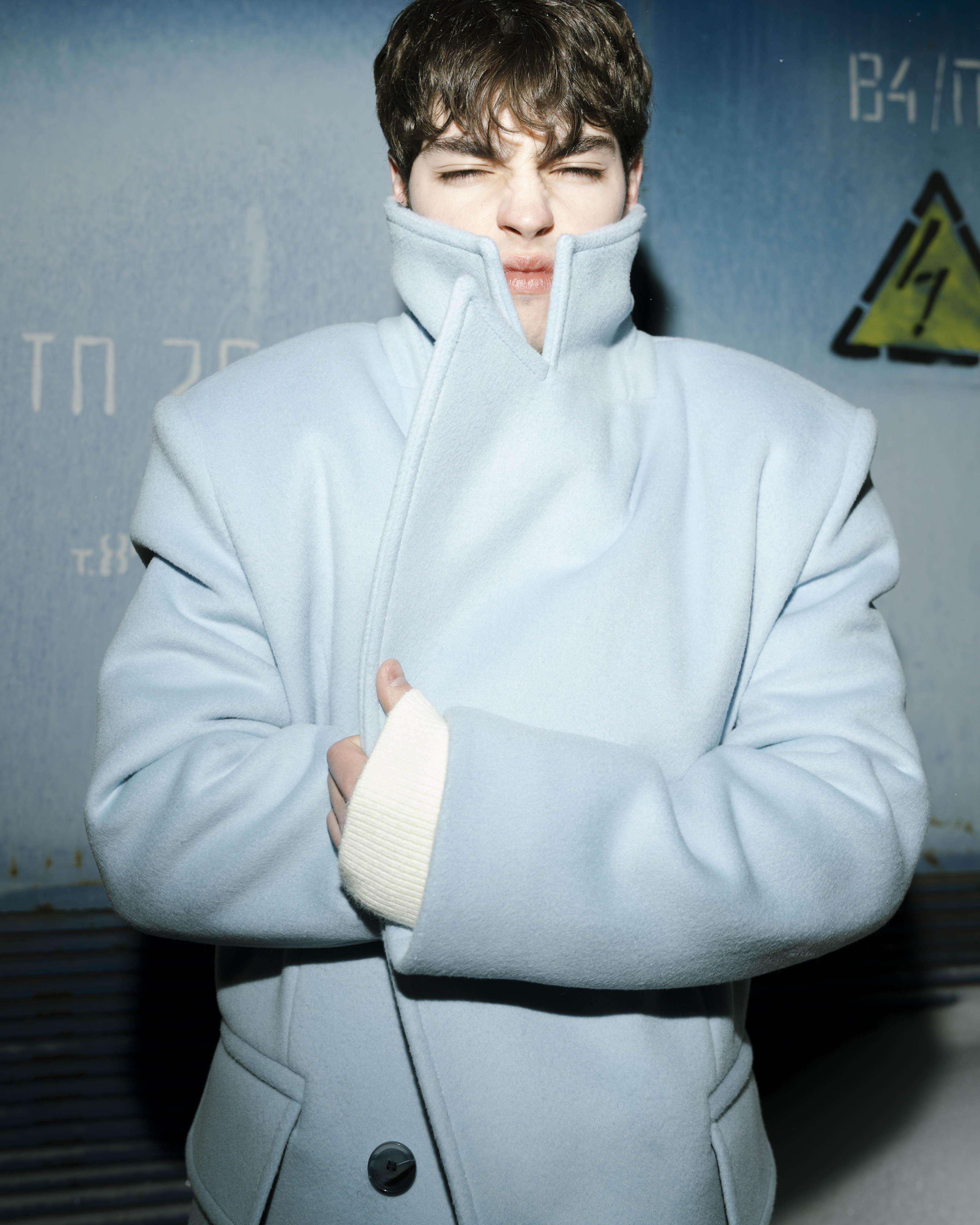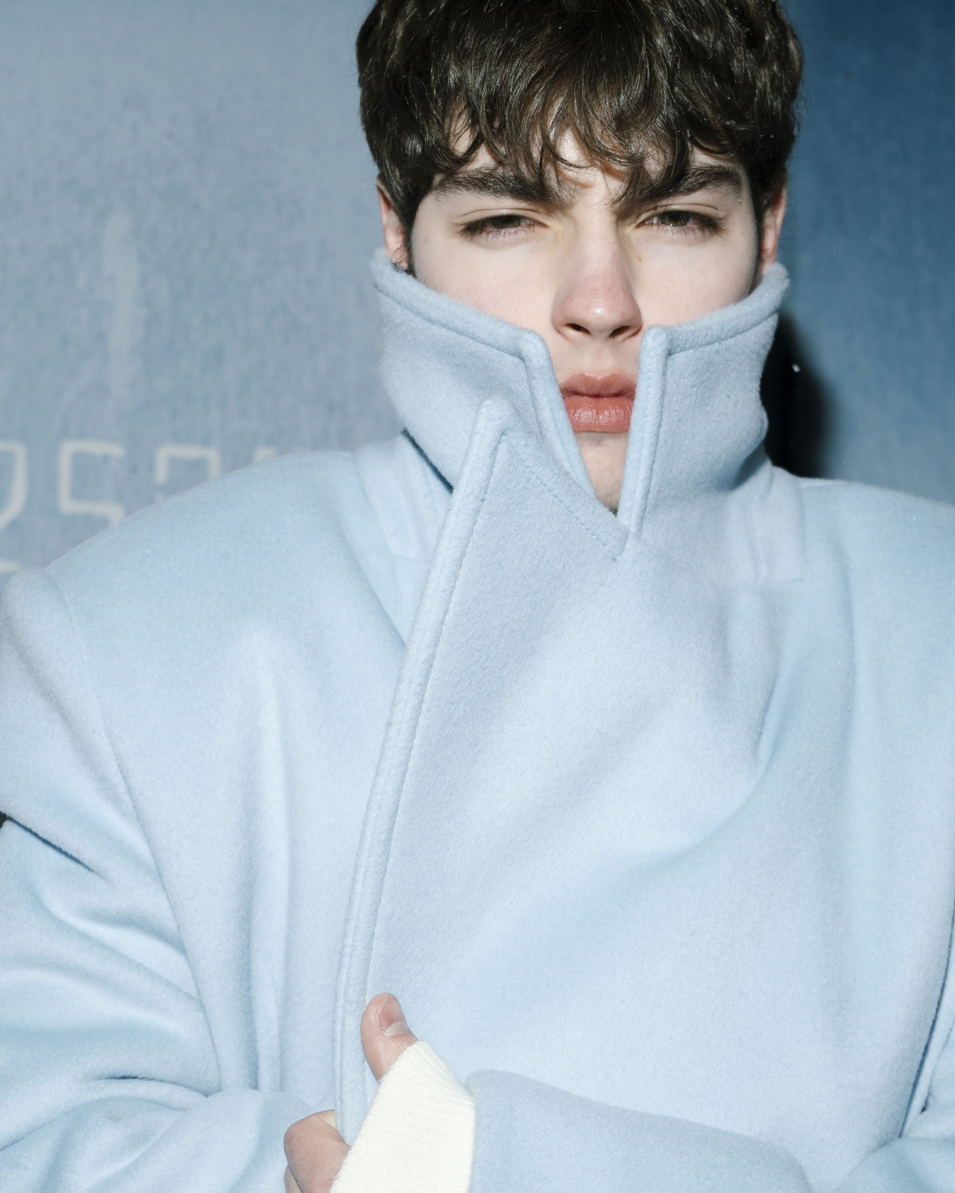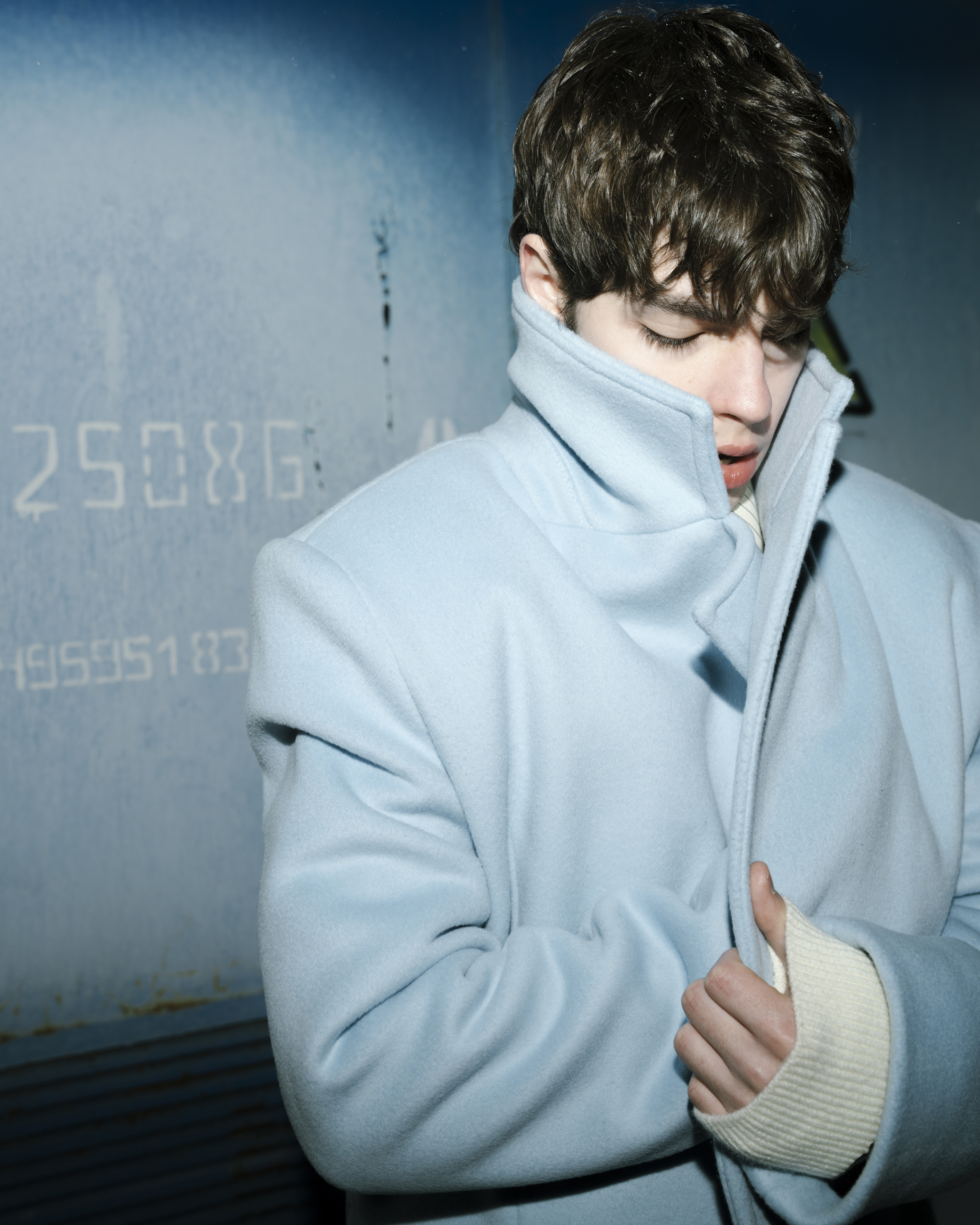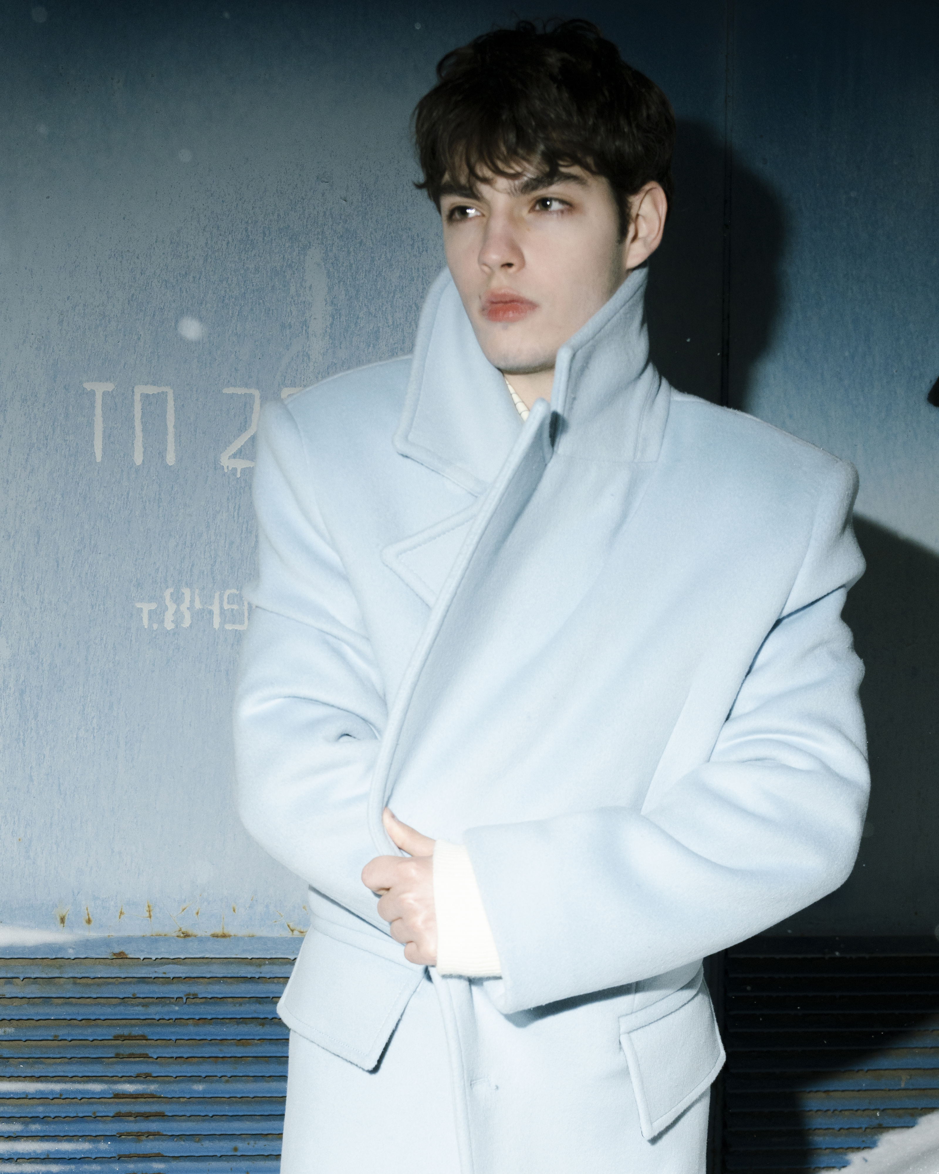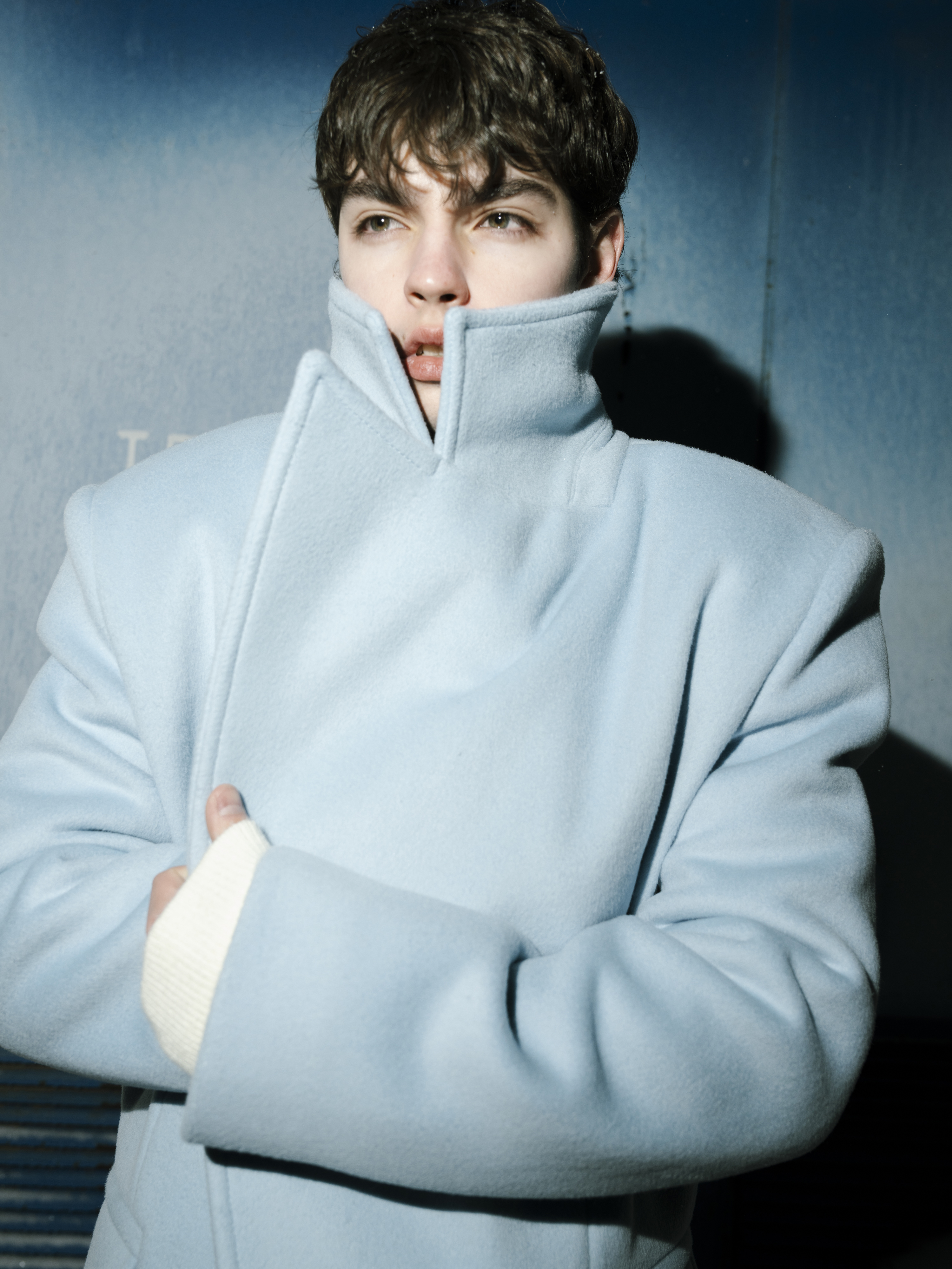 Длинное пальто из 100% австралийской шерсти с ассиметричным бортом с закругленным низом. Застёжка на две прорезные глазковые петли и пуговицы. На переде два прорезных кармана с клапаном. Спинка с двумя высокими шлицами и широким регулирующимся хлястиком на петлях и пуговицах. Широкая отстрочка по борту всего изделия, воротнику в тон. Один внутренний карман.