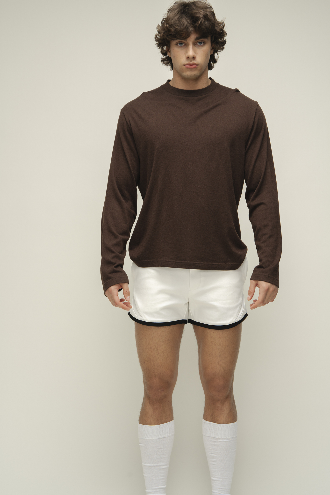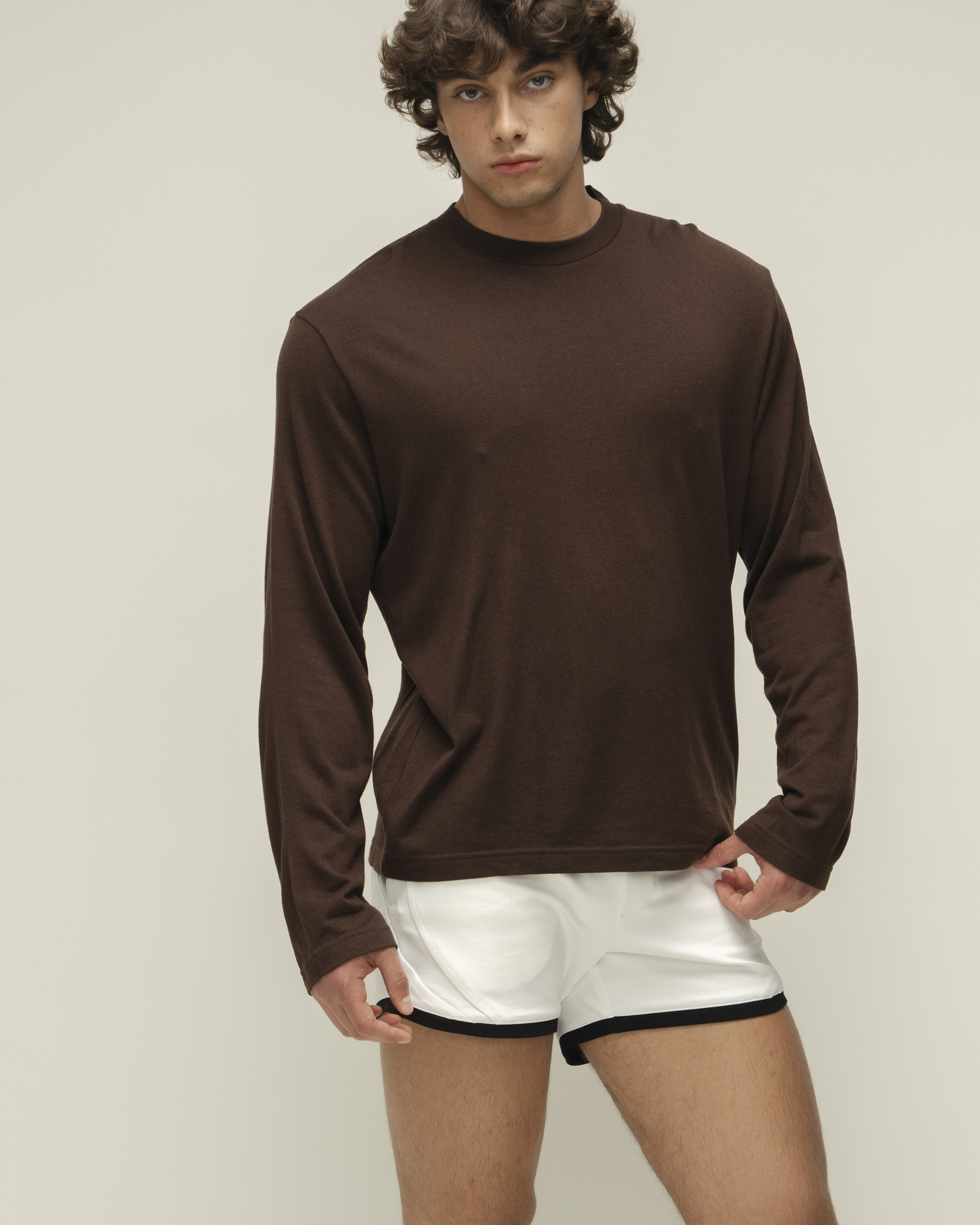 Лонгслив свободного кроя из тактильно приятного материала. Круглый вырез. Брендированная киперная лента внутри на горловине.