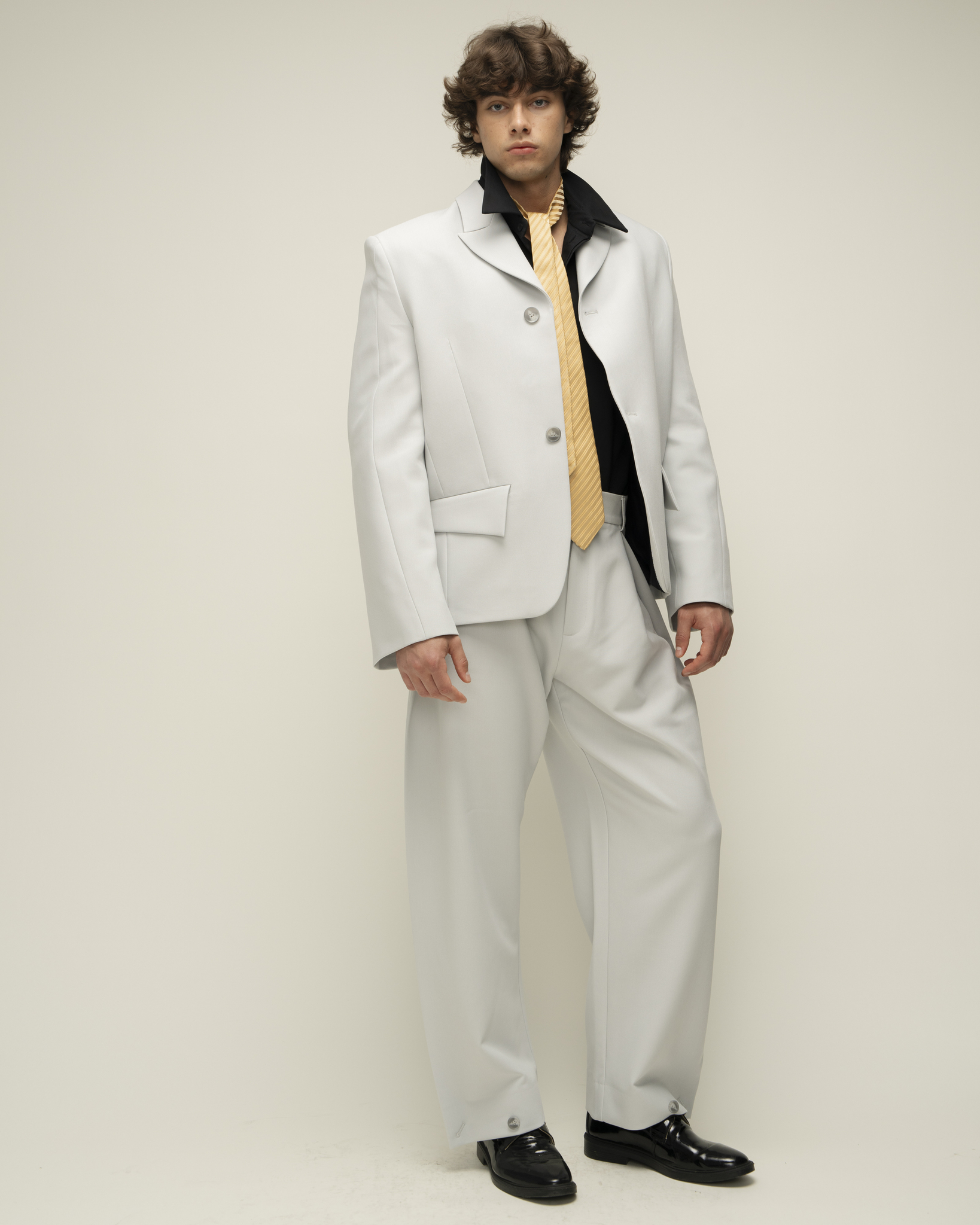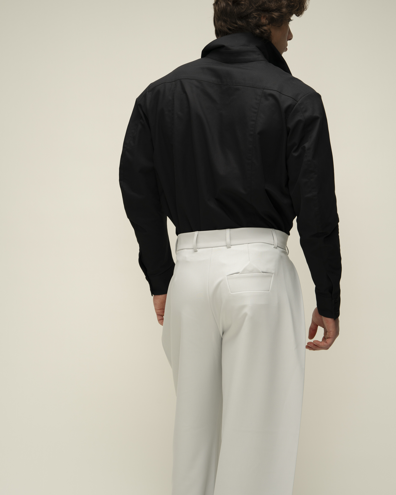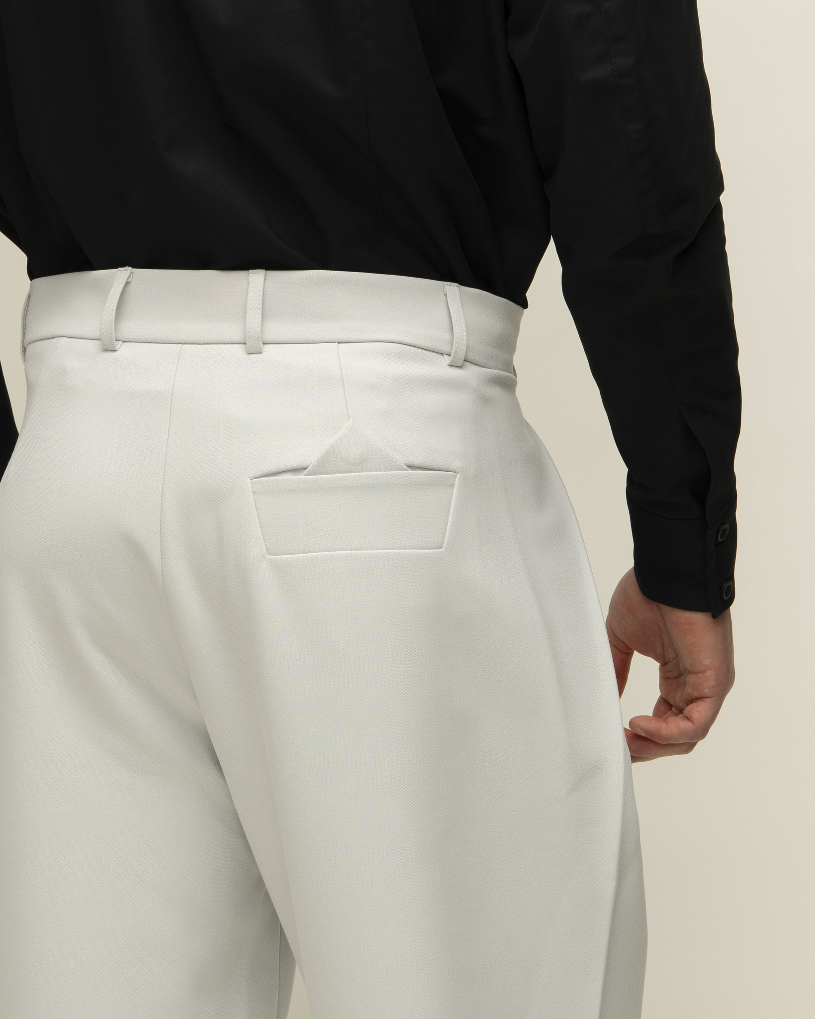 Брюки из смесовой костюмной ткани с боковой глубокой односторонней складкой. Два боковых кармана, один задний карман в форме «кораблика». По низу брюк складка фиксируется на петлю и пуговицу.
