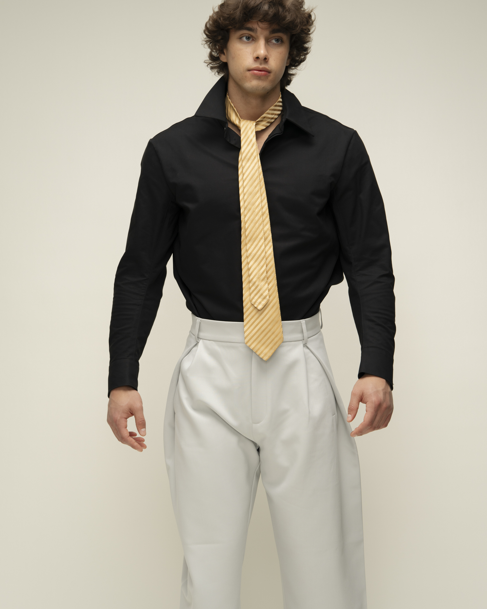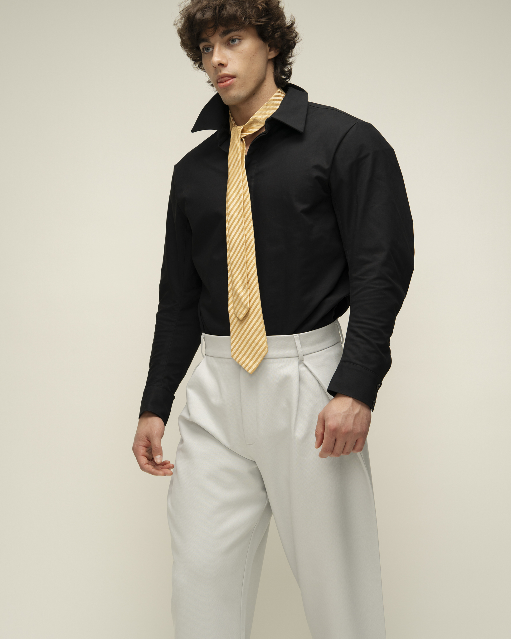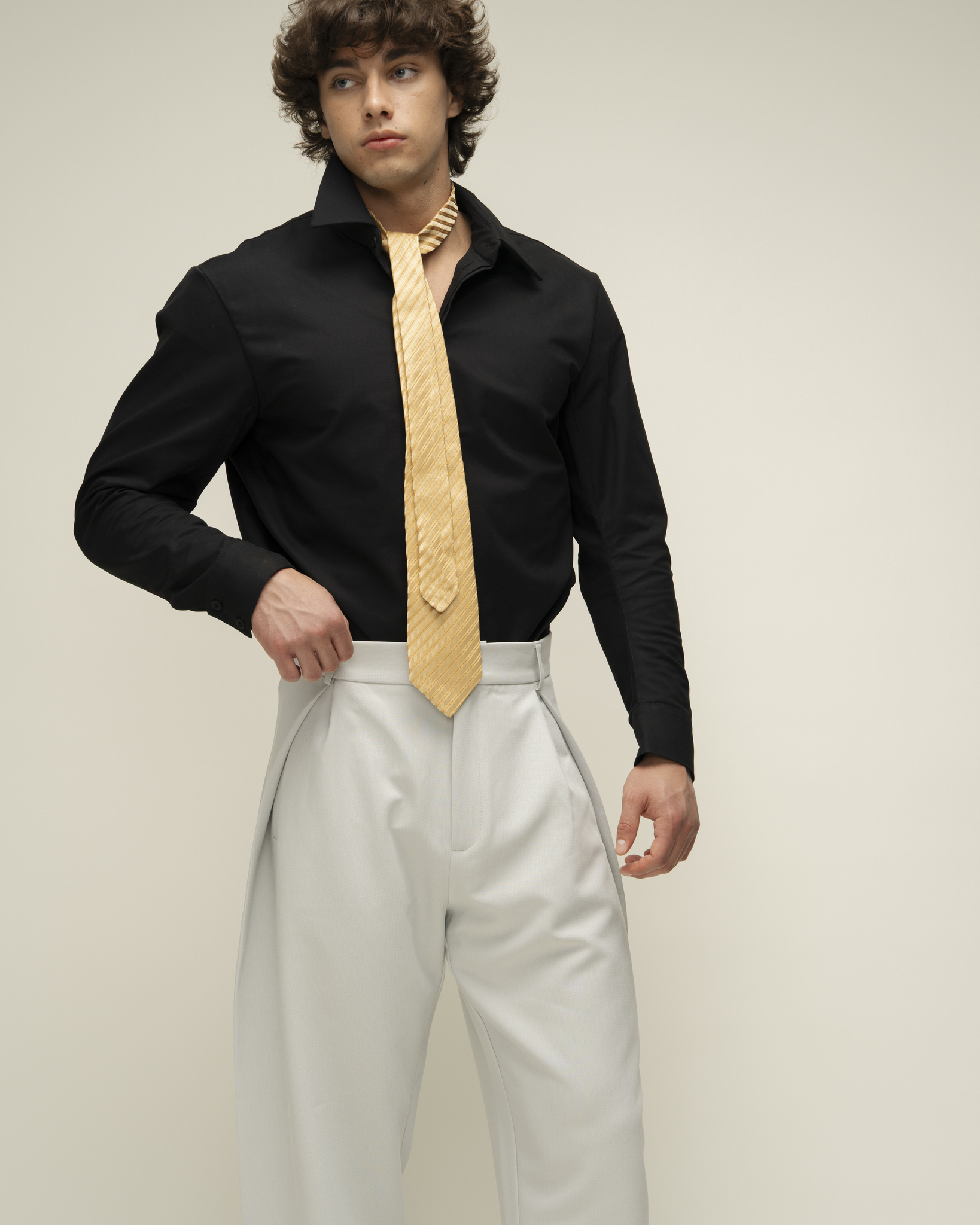 Брюки из смесовой костюмной ткани с боковой глубокой односторонней складкой. Два боковых кармана, один задний карман в форме «кораблика». По низу брюк складка фиксируется на петлю и пуговицу.