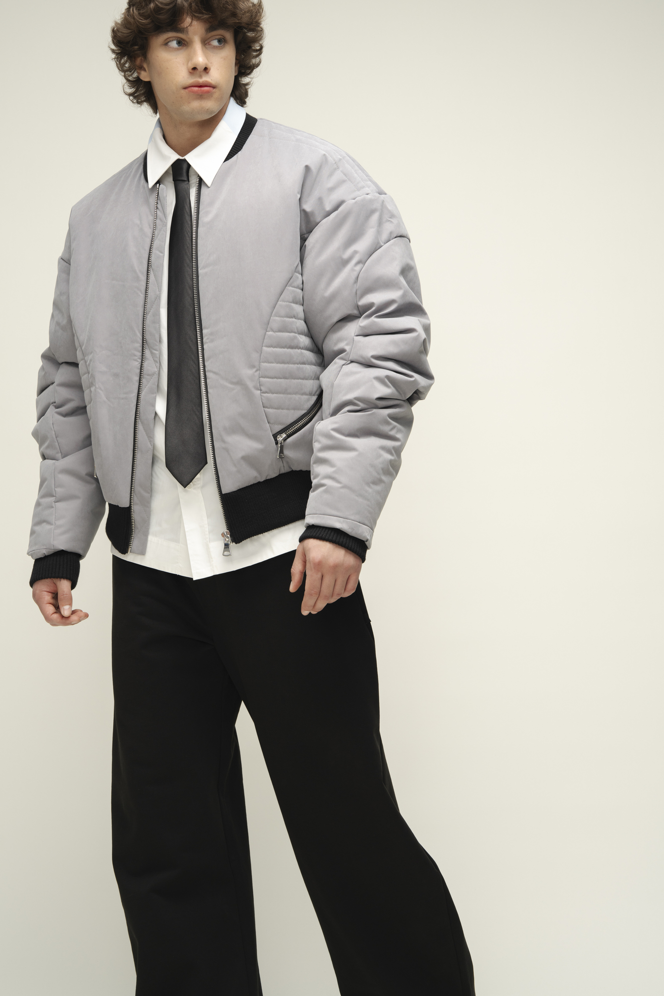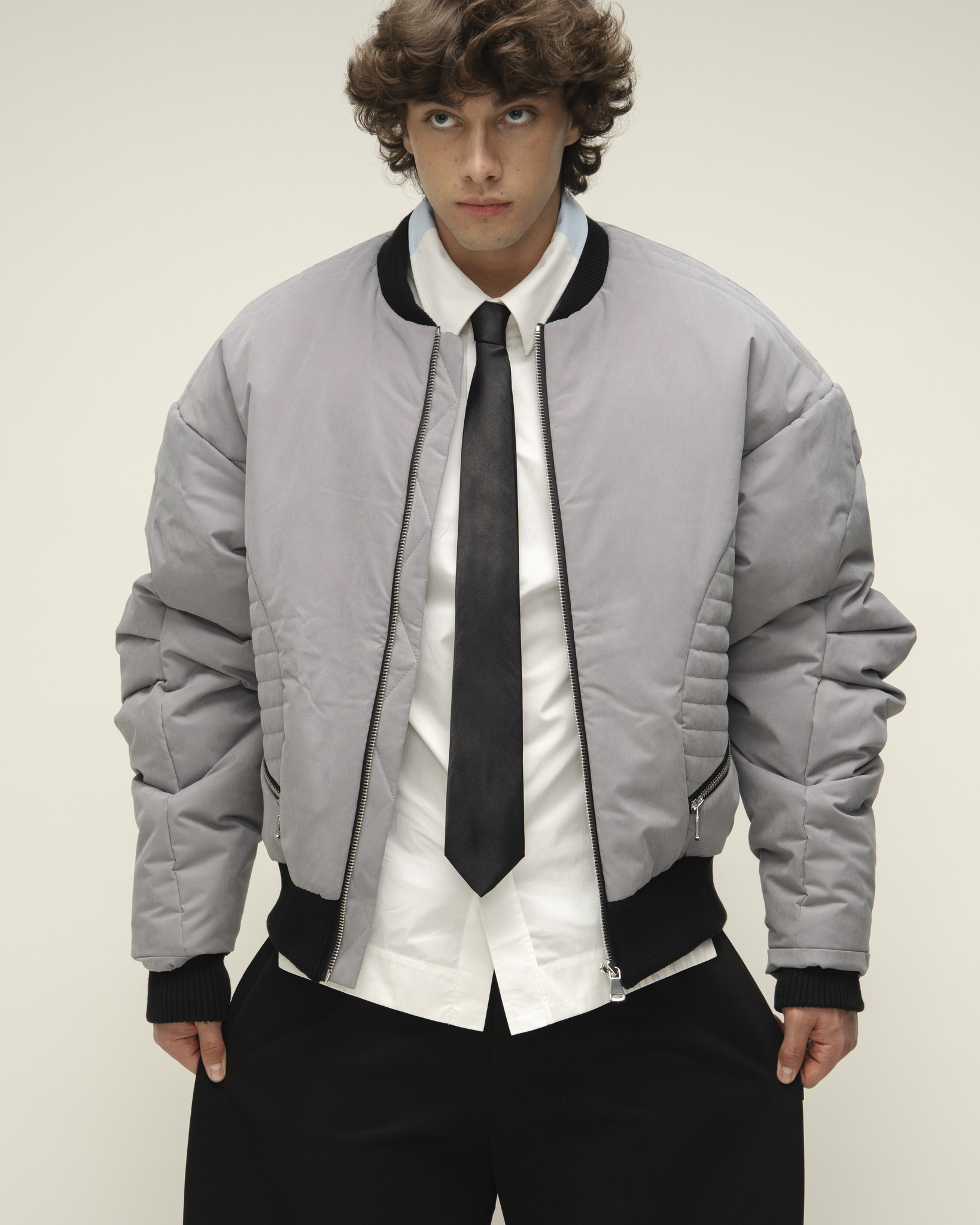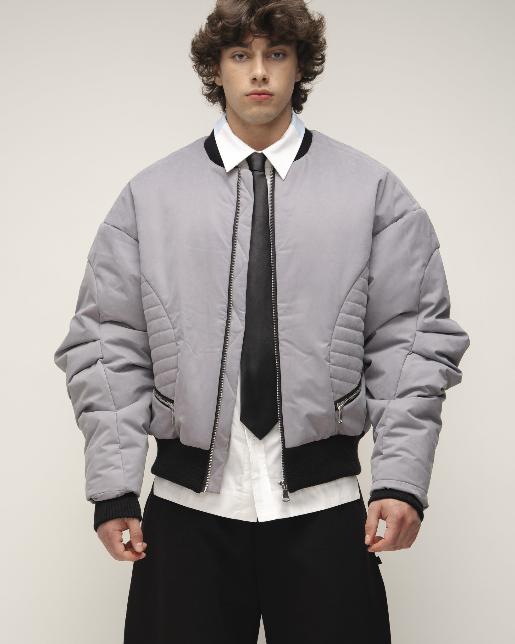 Оверсайз бомбер из серой фактурной ткани. Для бомбера специально разработаны подвязы с крупным рубчиком, толстые молнии, укреплённая линия плеча. Оригинальный крой рукава со складками даёт большую свободу движения, простеганные боковые детали с карманами визуально вытягивают силуэт, делая объемную вещь точёной. Для удобства хранения гаджетов предусмотрен внутренний карман.