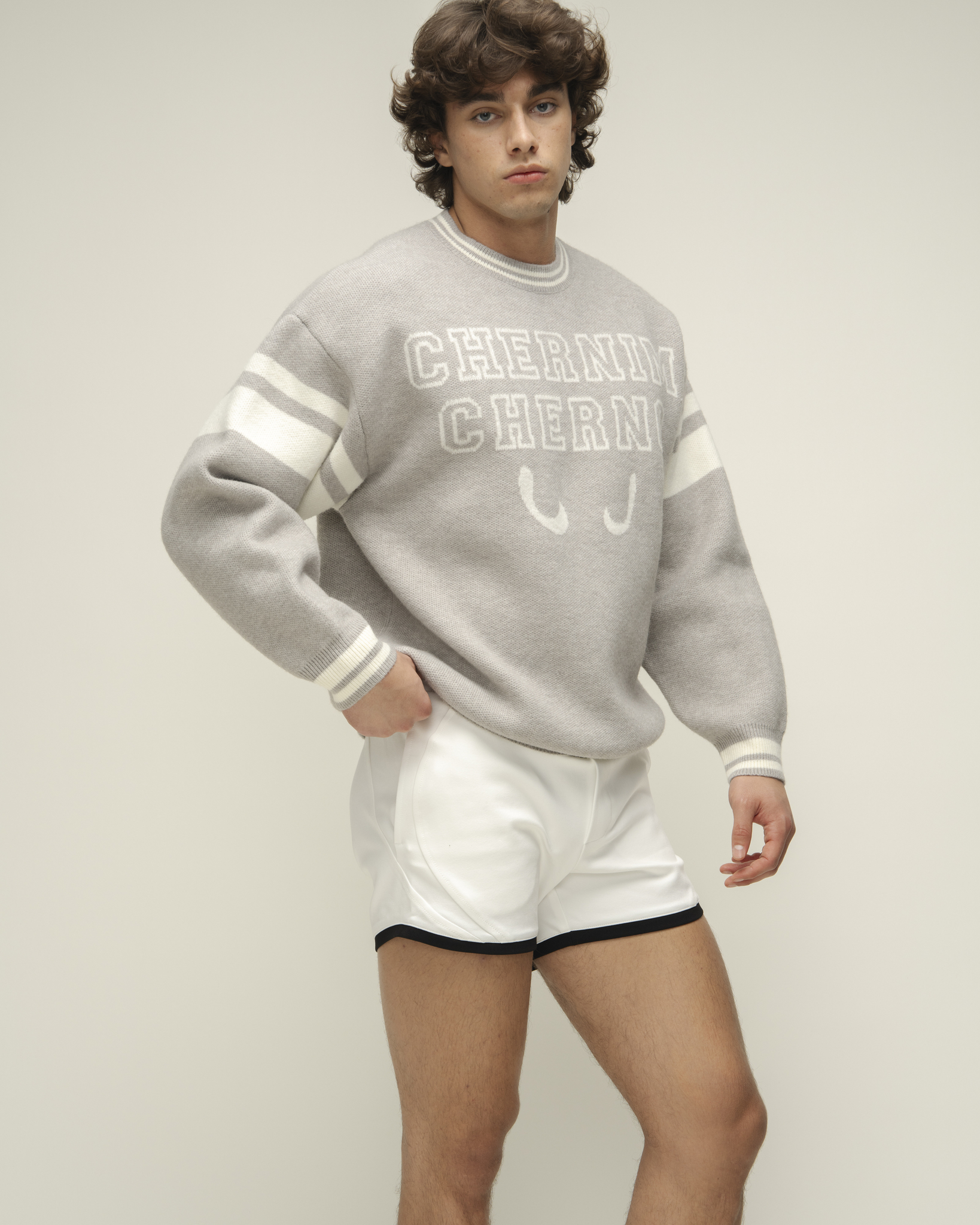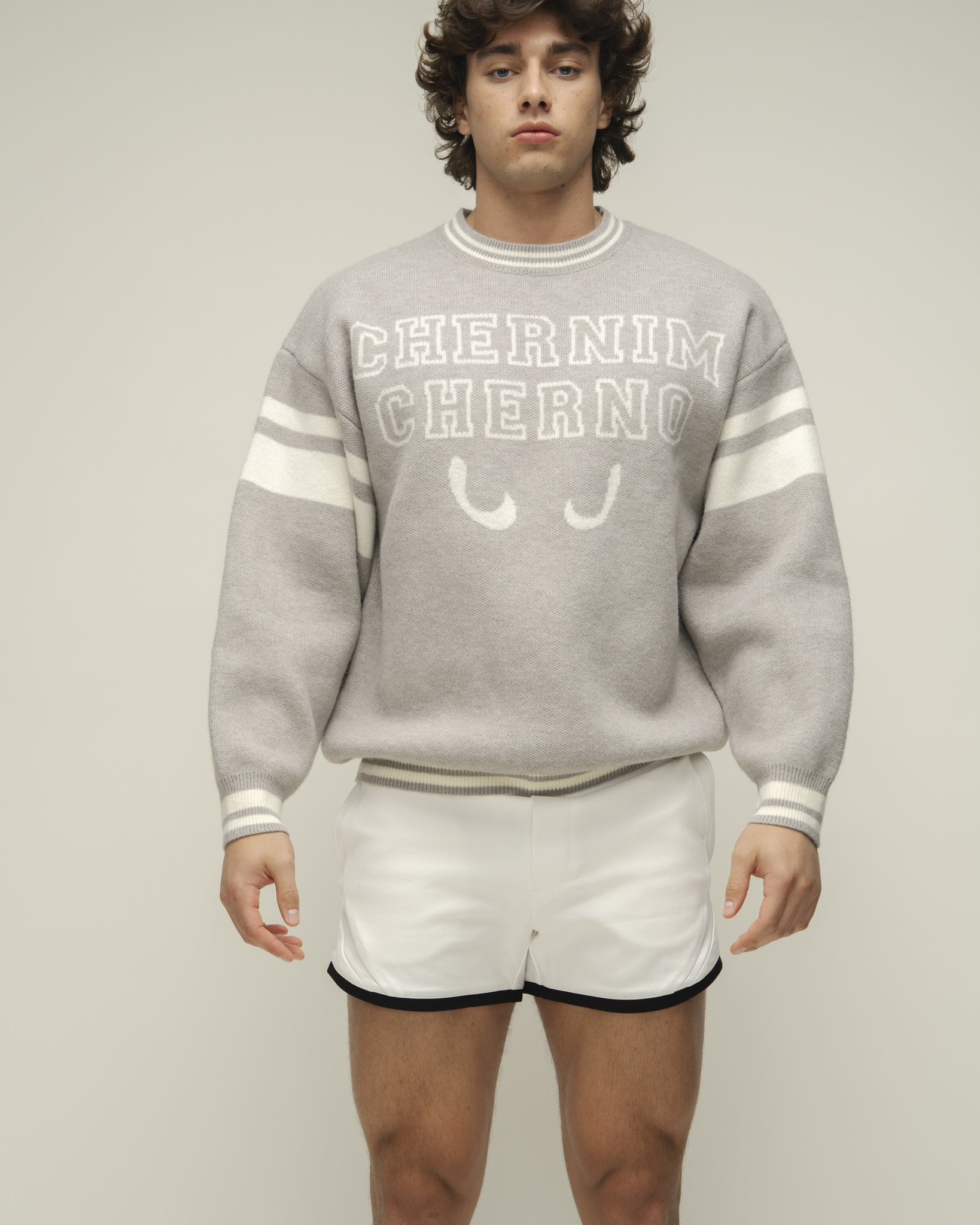Свитер свободного кроя со спущенной линией плеча выполнен из мягкого трикотажа и украшен контрастными полосами и логотипом с глазами черныша.