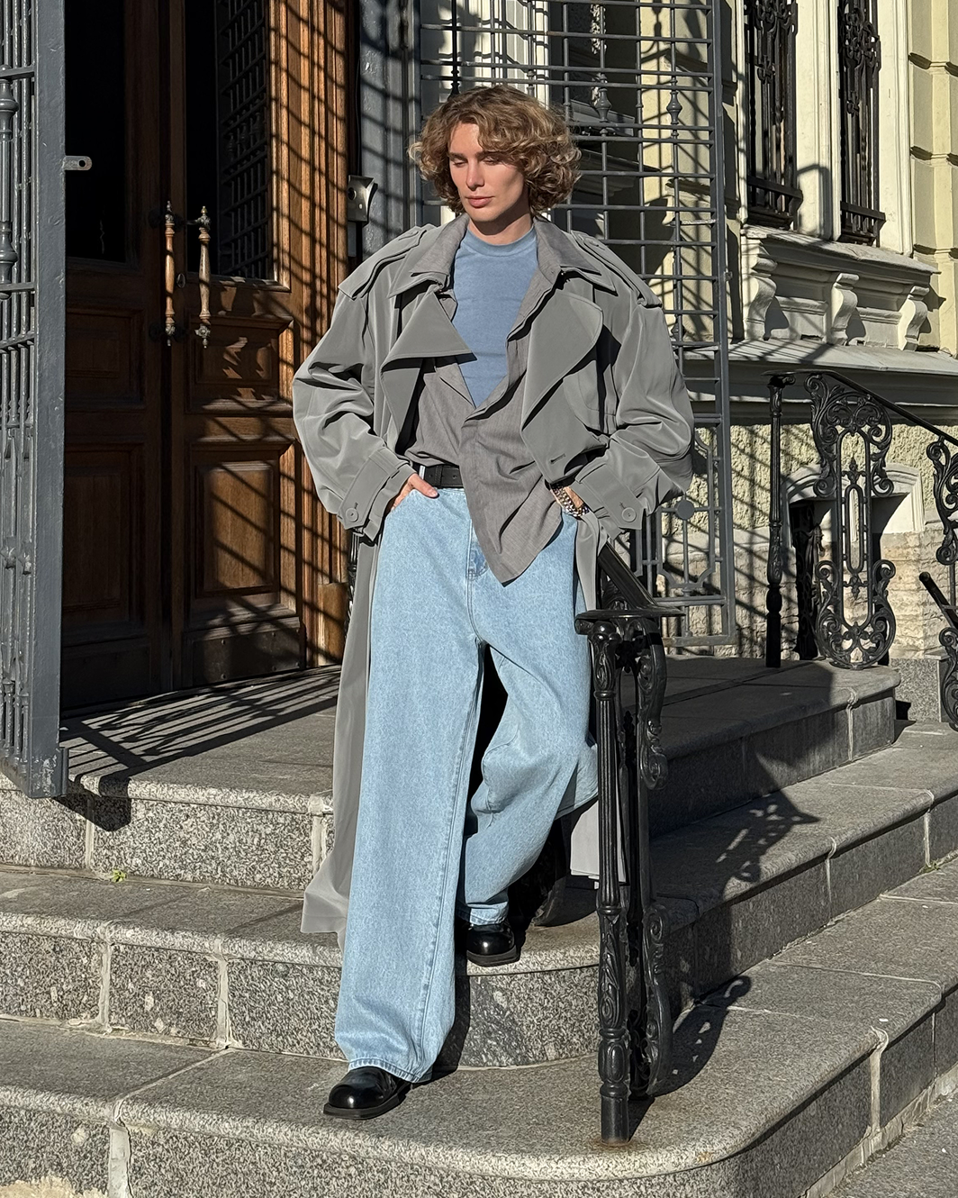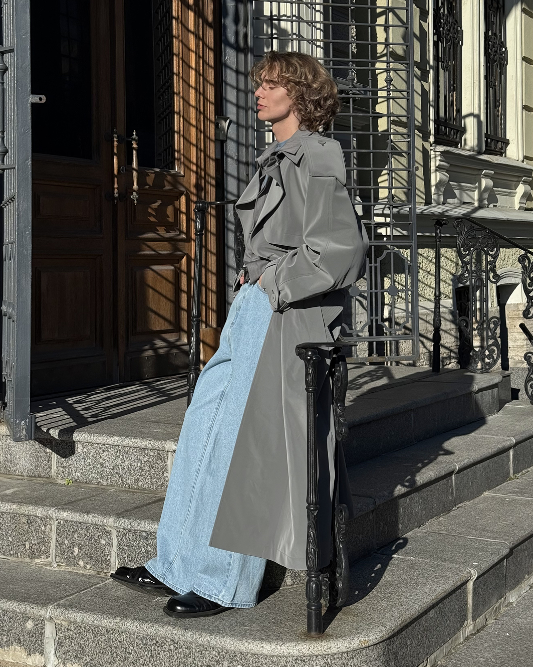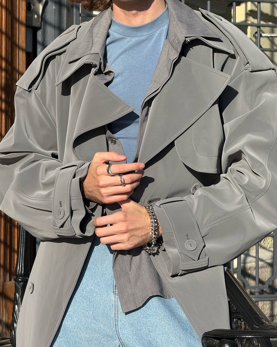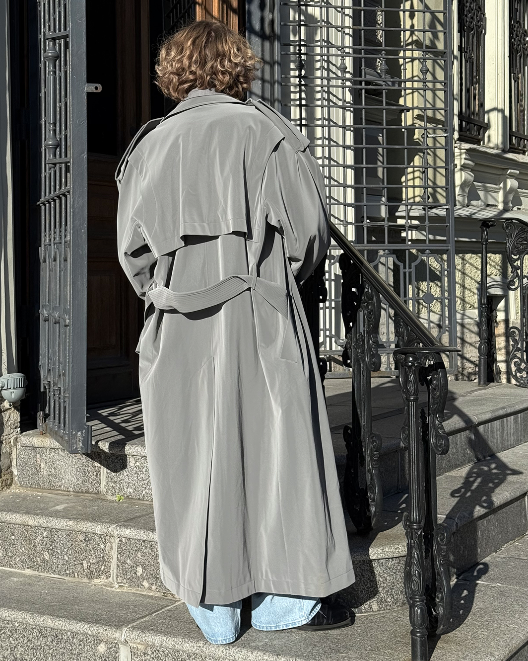 Длинный тренч из экокожи с бархатистым эффектом на хлопковой основе, что позволяет ткани дышать. Акцентные двойные паты на плечах. Пуговицы и люверсы обтянуты основной тканью. Два боковых кармана, кокетка спереди, отлётная кокетка на спинке. Длинный выстроченный пояс.