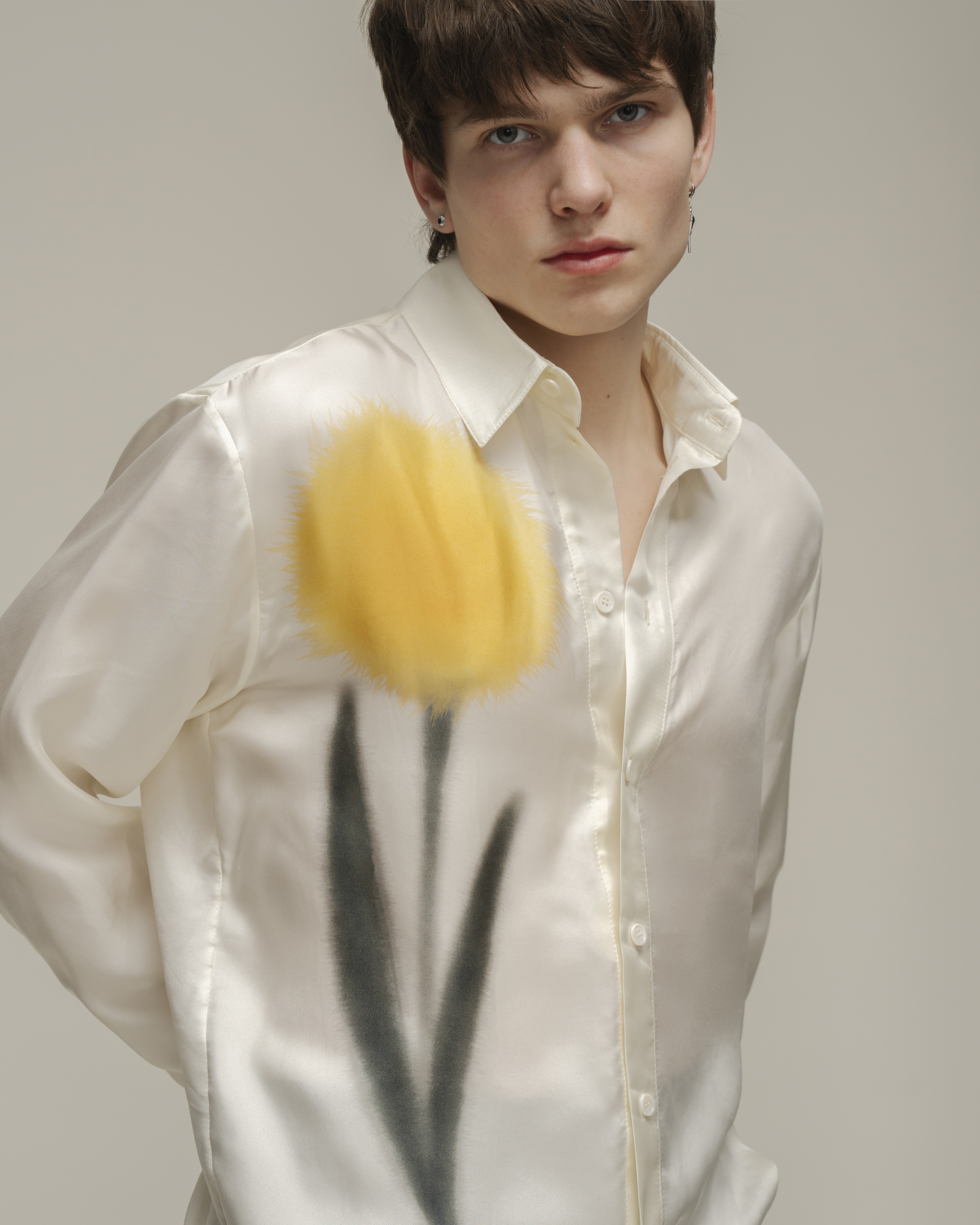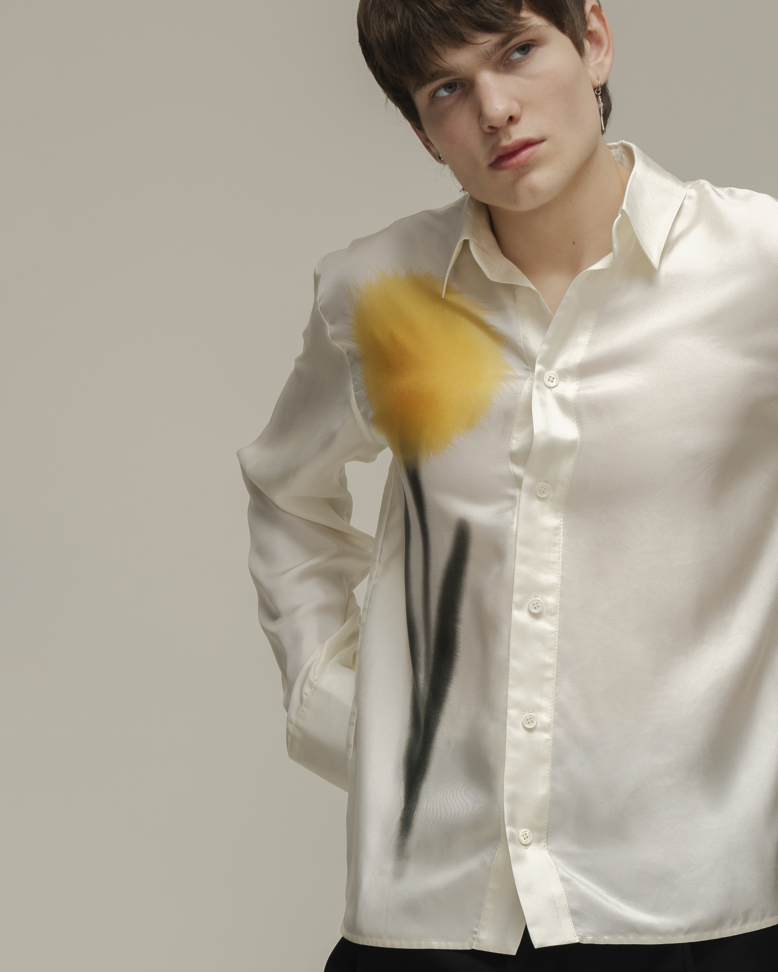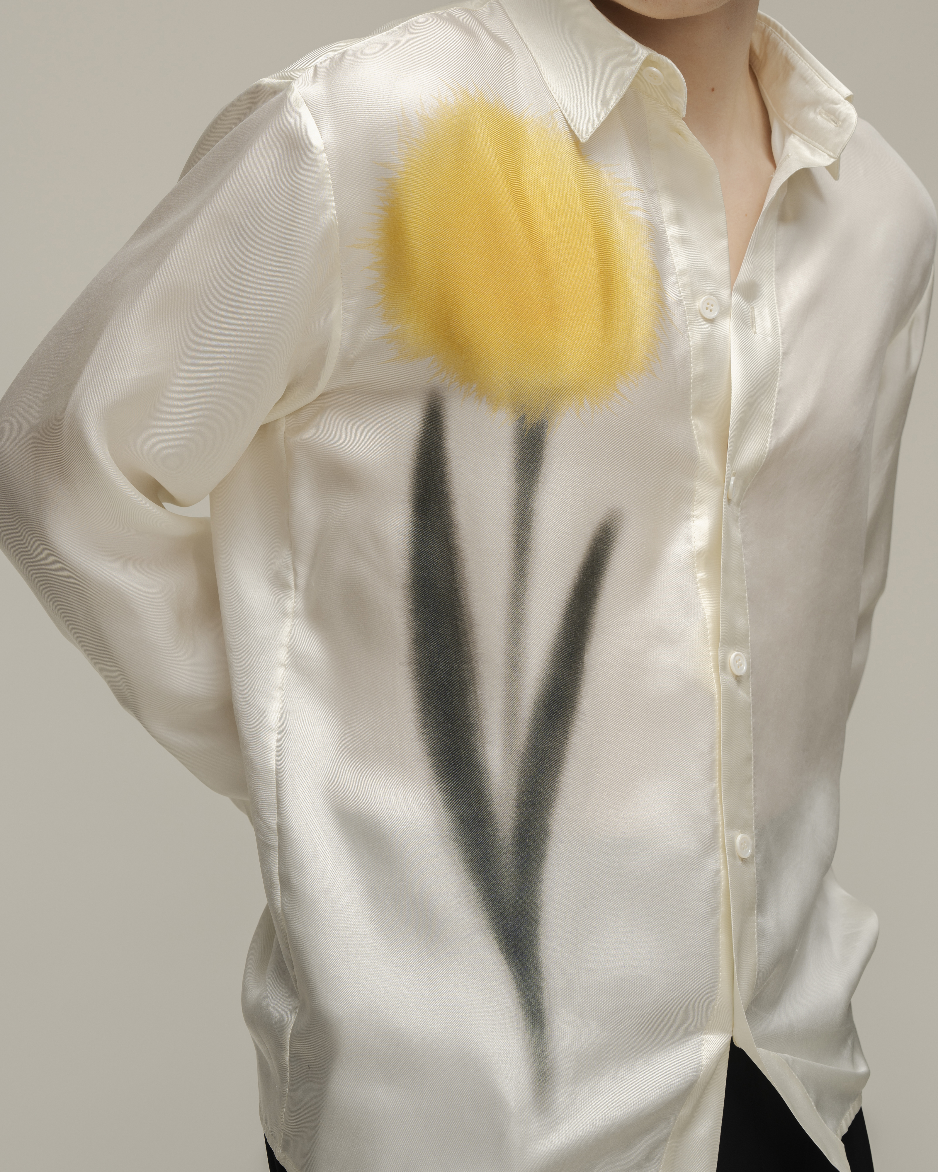 Рубашка прямого кроя из натурального шелка с с деликатным жемчужным блеском. На передней планки разместился авторский принт цветка. Модель дополнена классическим отложным воротником и акцентными двойными манжетами на пуговицах. Рубашка застегивается на ряд пуговиц.