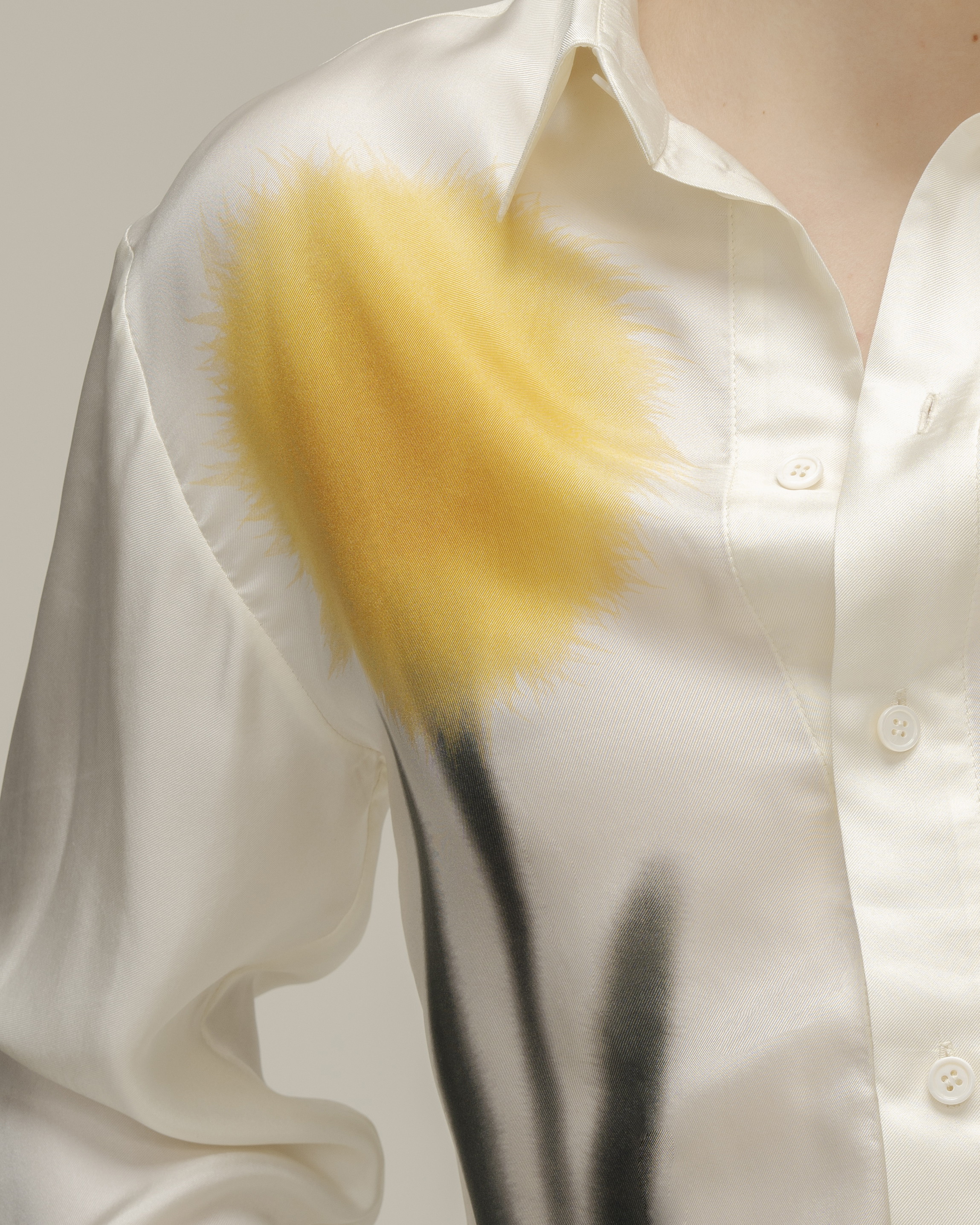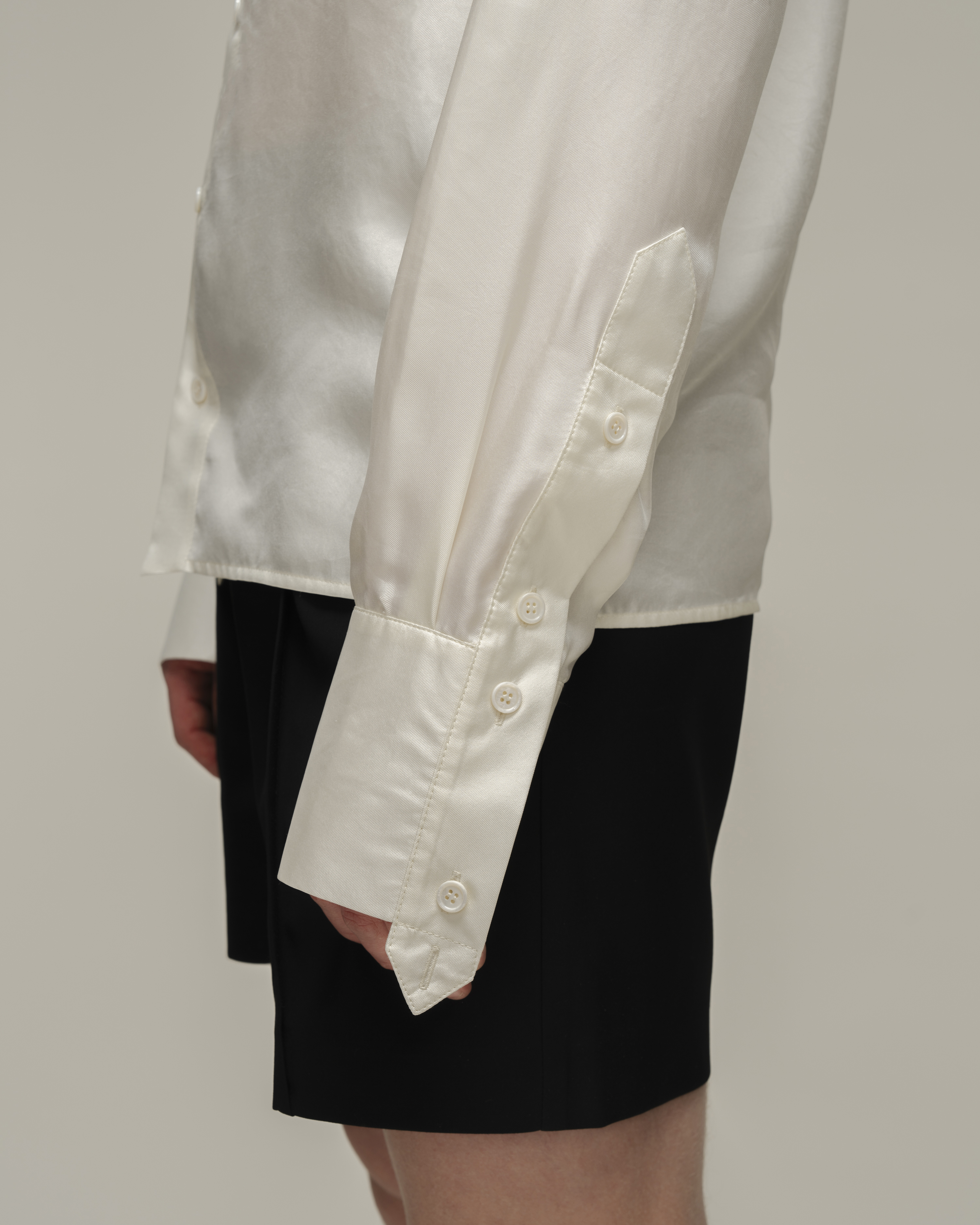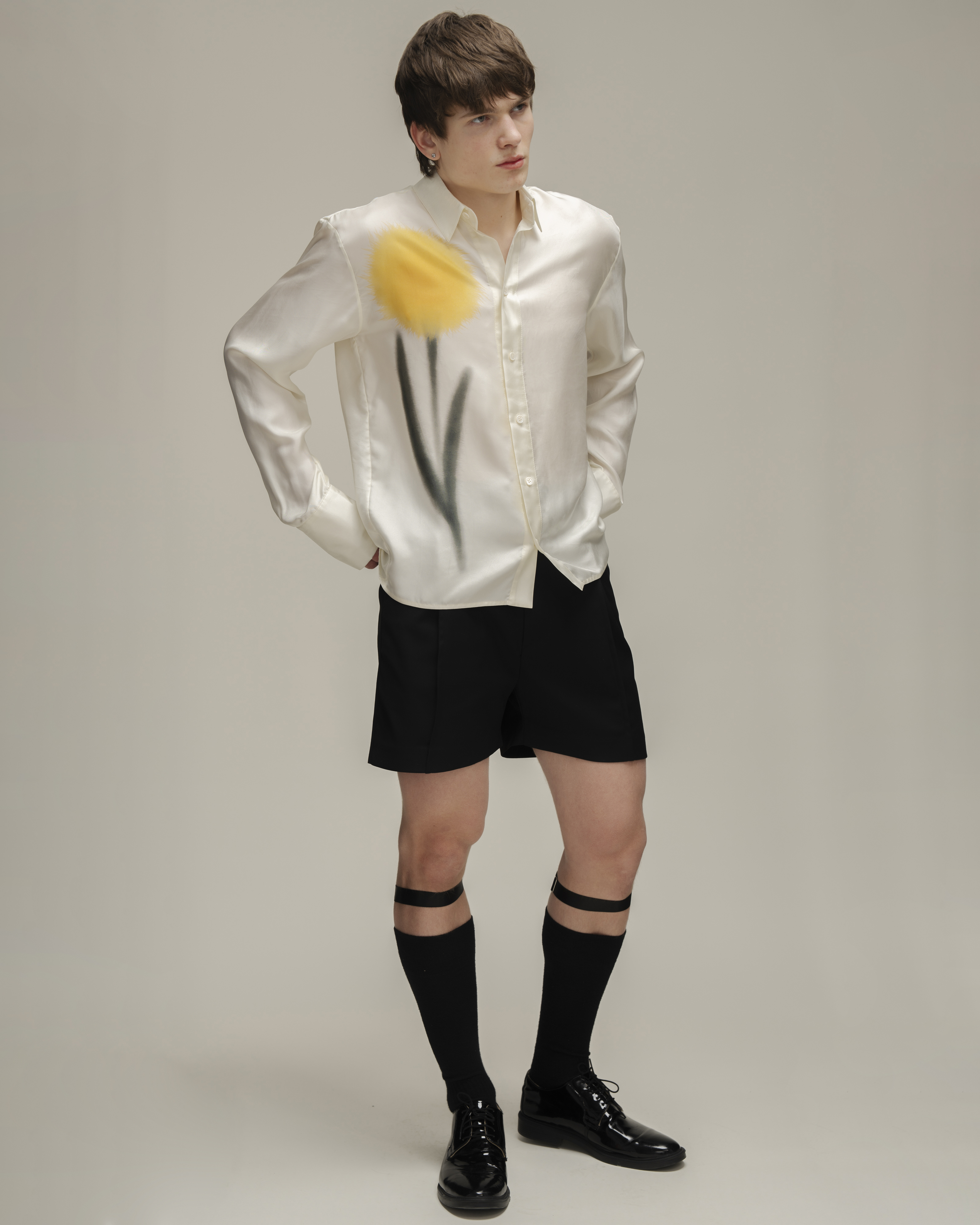 Рубашка прямого кроя из натурального шелка с с деликатным жемчужным блеском. На передней планки разместился авторский принт цветка. Модель дополнена классическим отложным воротником и акцентными двойными манжетами на пуговицах. Рубашка застегивается на ряд пуговиц.